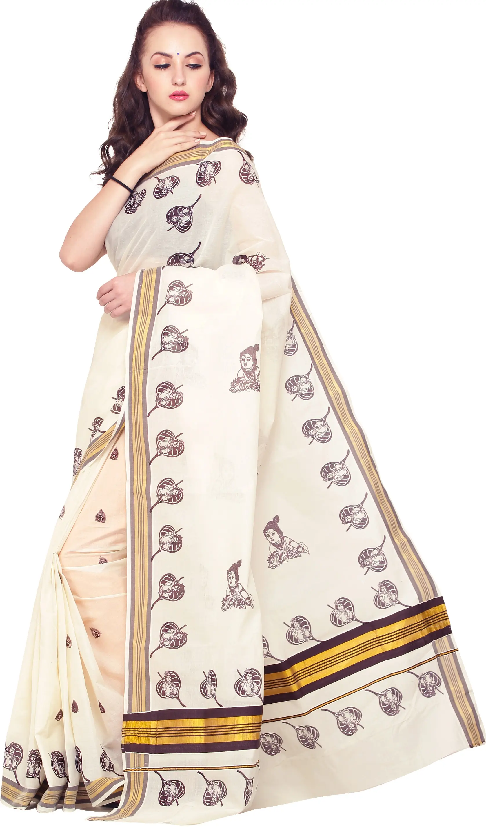 This sari is adorned with a captivating print that showcases the playful and divine imagery of Lord Krishna. Each motif, rendered in a deep, rich shade, appears as if delicately hand-painted, adding an artisanal charm. Interspersed between the Krishna prints are stylized leaf motifs, suggesting nature's grace and fertility. The pallu and border feature a classic Kasavu design, characterized by woven stripes of gold and charcoal grey. This traditional border adds a touch of regal splendor and anchors the contemporary prints with a timeless appeal. The combination of the soft cotton fabric, the evocative prints, and the classic border creates a garment that is both culturally significant and visually striking.