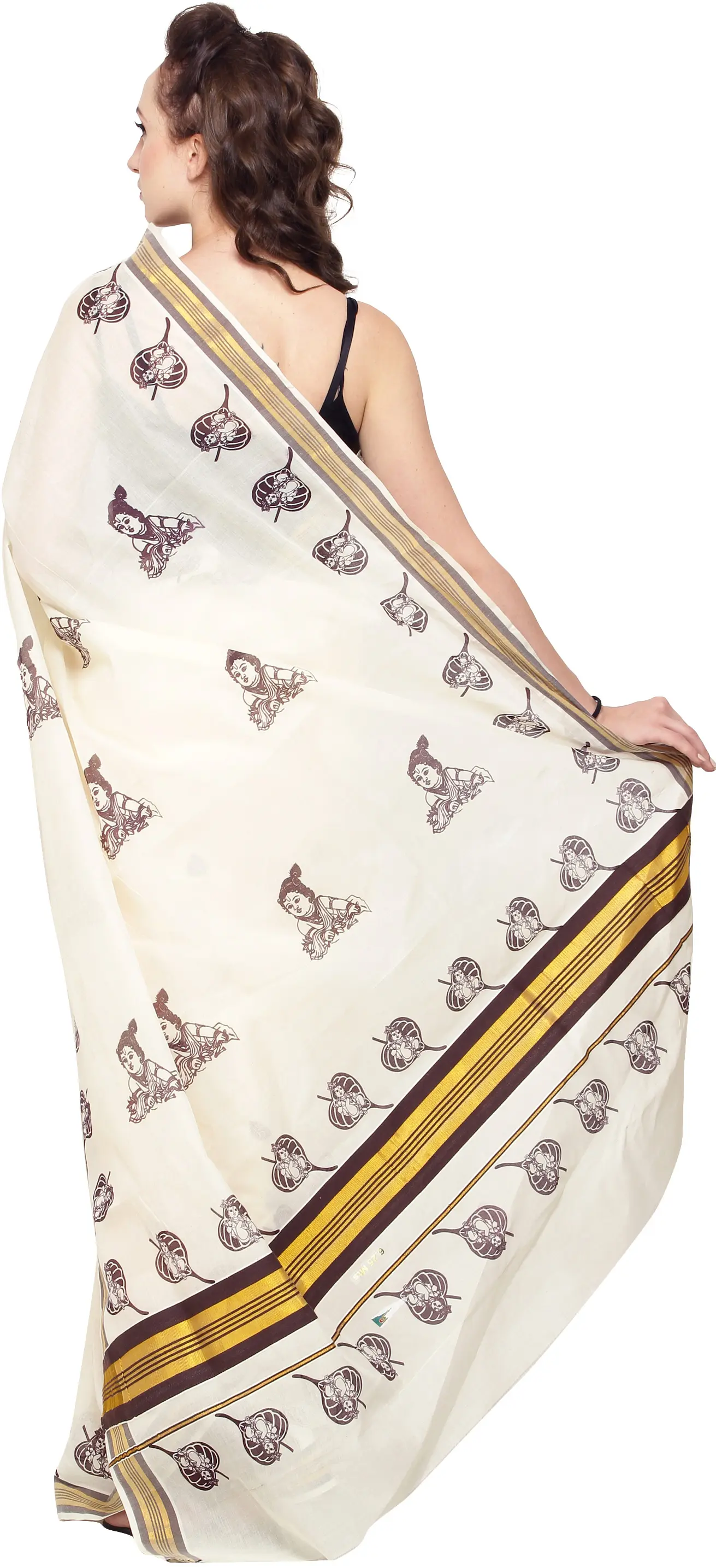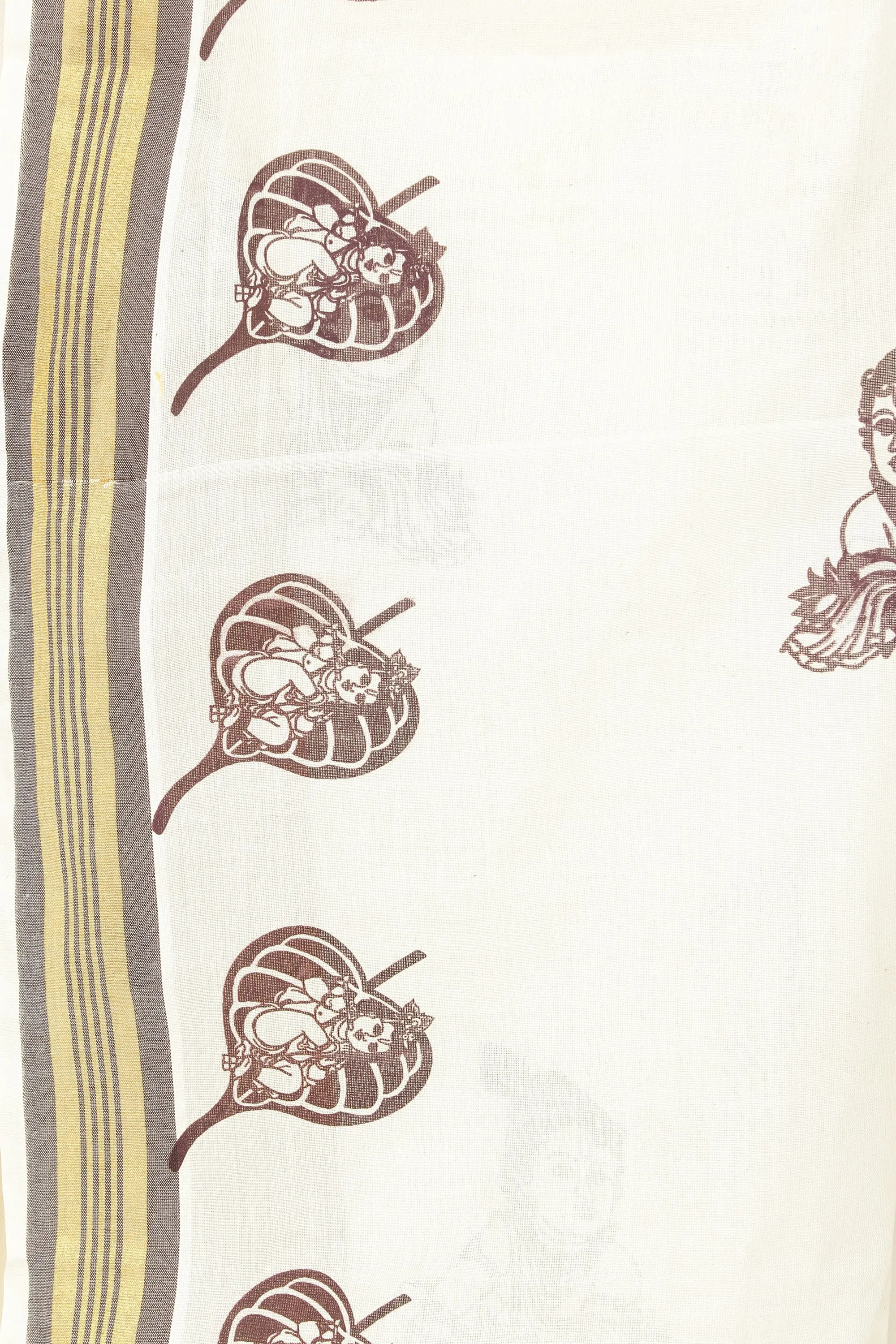 Off-White Kasavu Sari from Kerala with Woven Border and Printed Little Krishna