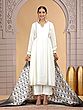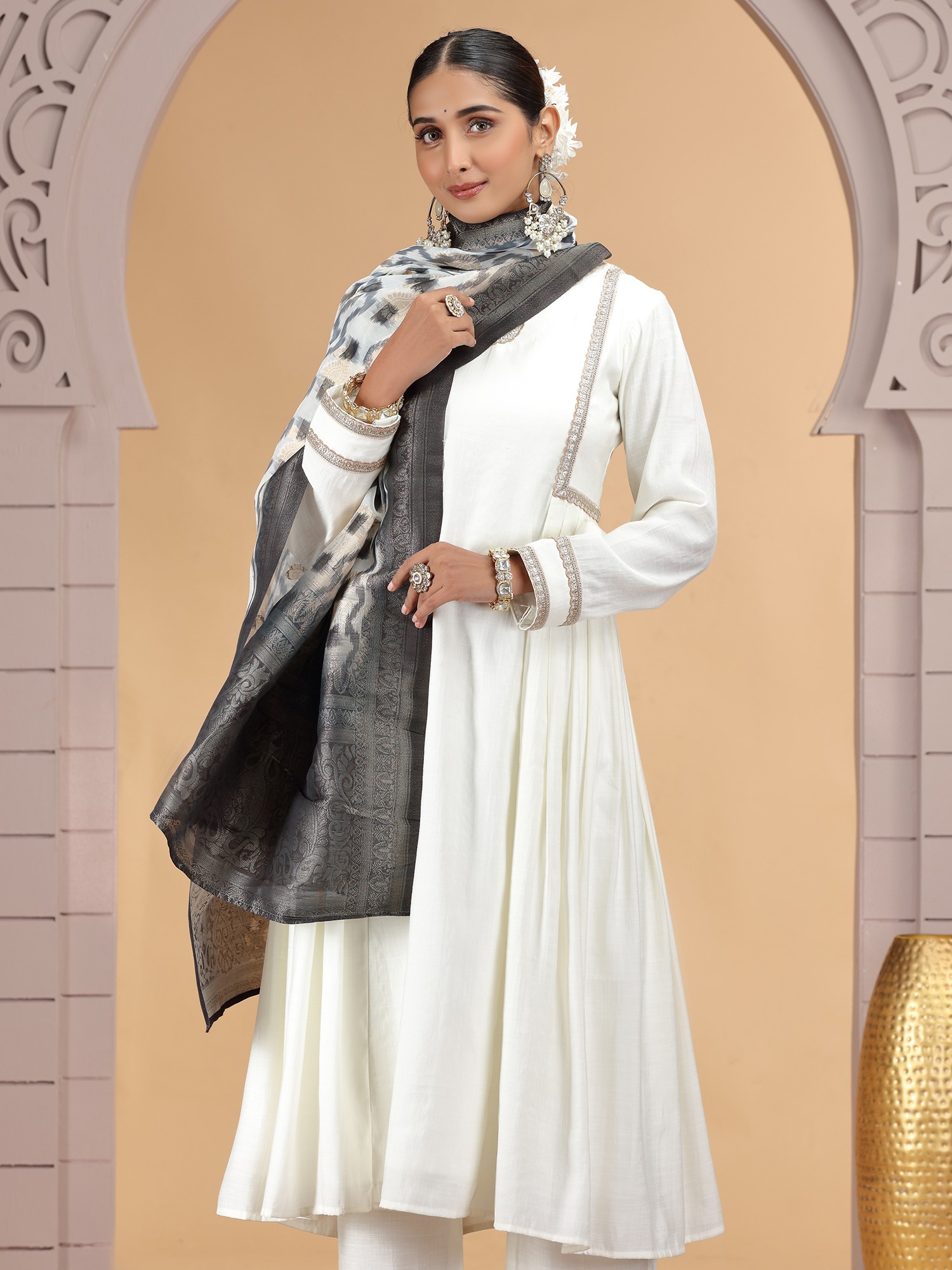 The ethereal off-white hue provides a canvas of purity, beautifully enhanced by the intricate detailing along the neckline and cuffs. The flowing silhouette of the kameez drapes effortlessly, complemented by the elegantly tailored pant suit. Accompanying this is a generously sized dupatta, featuring a captivating abstract motif that adds a modern yet classic touch, completing your look with an undeniable flair.