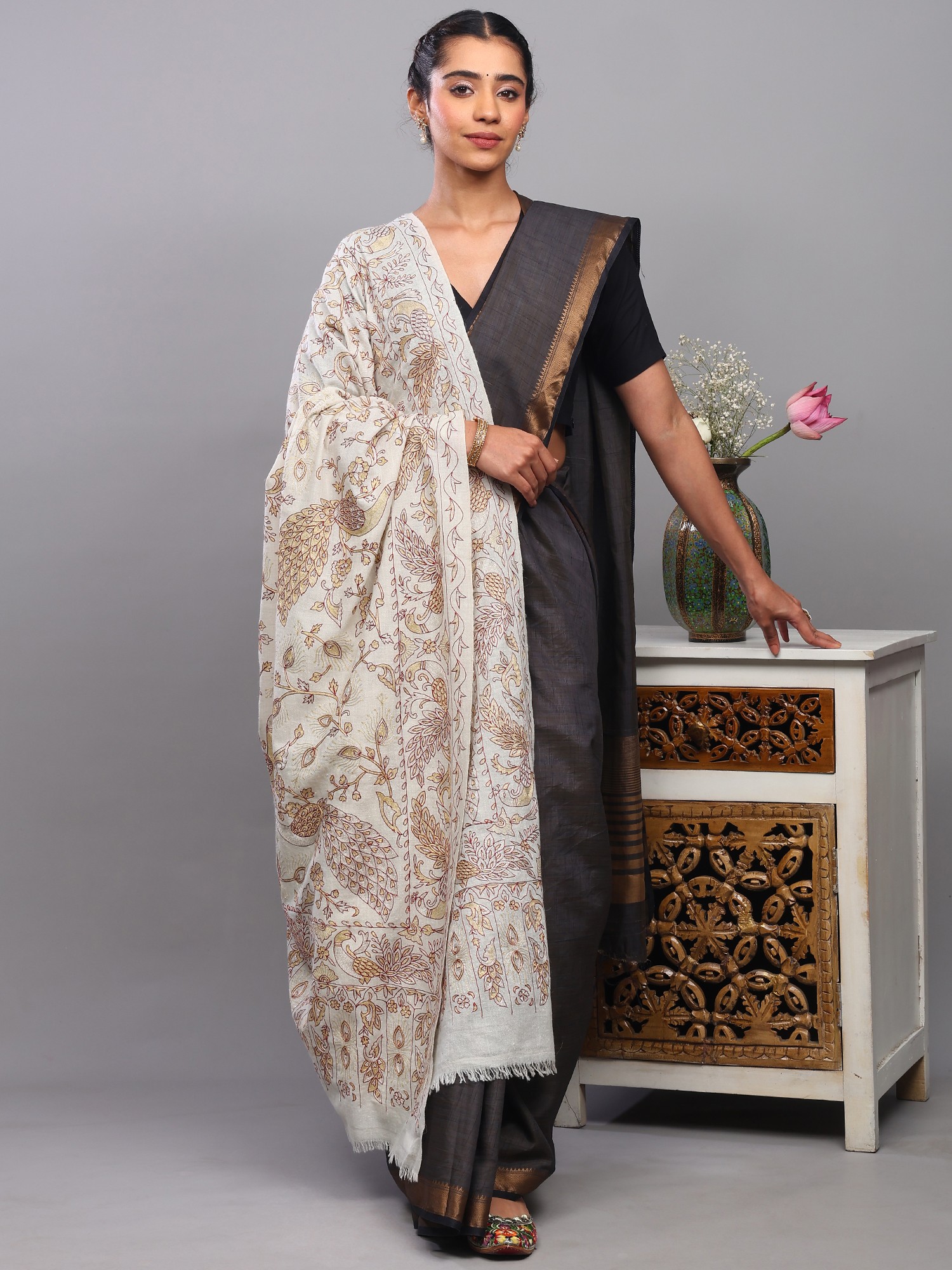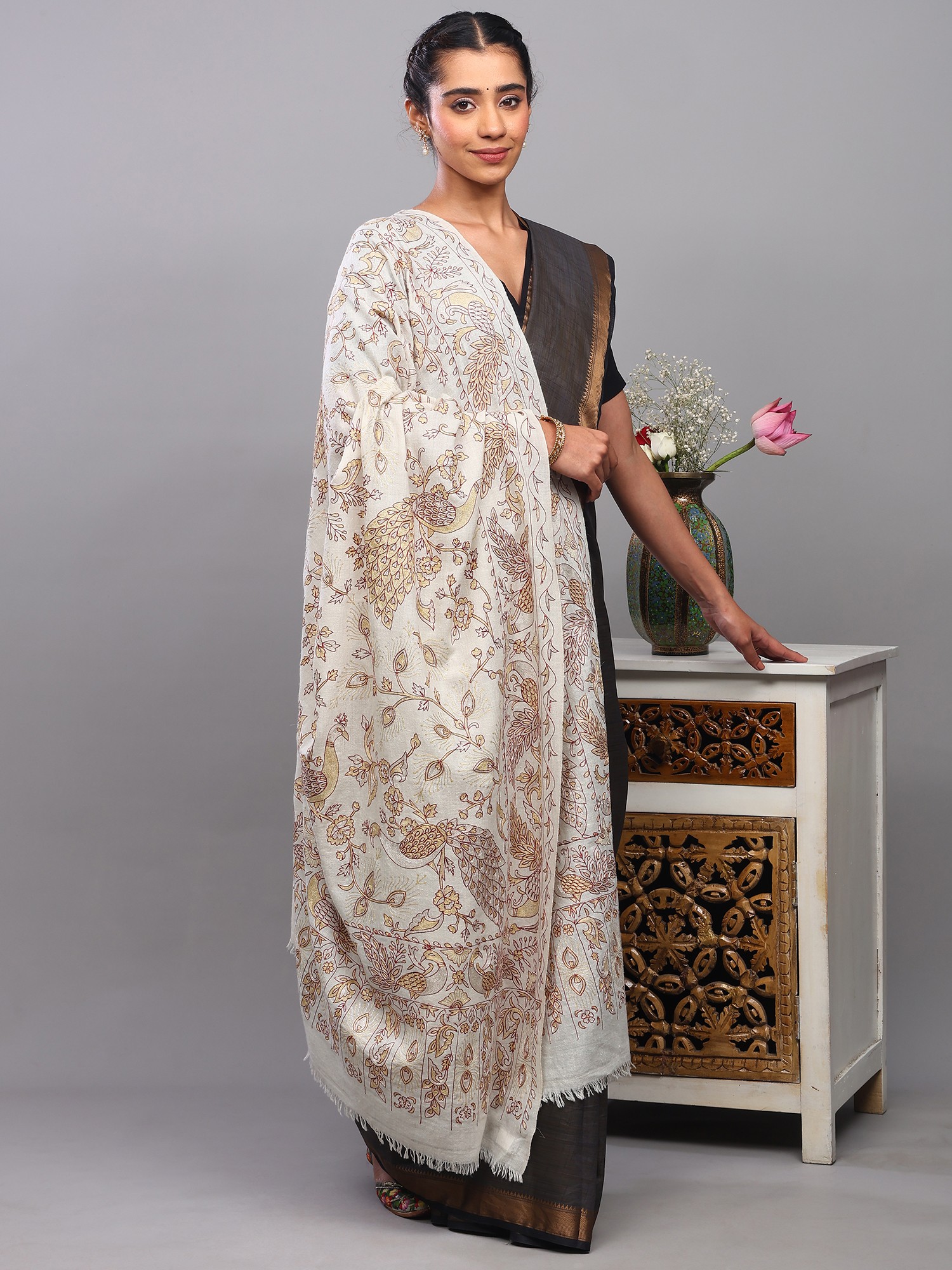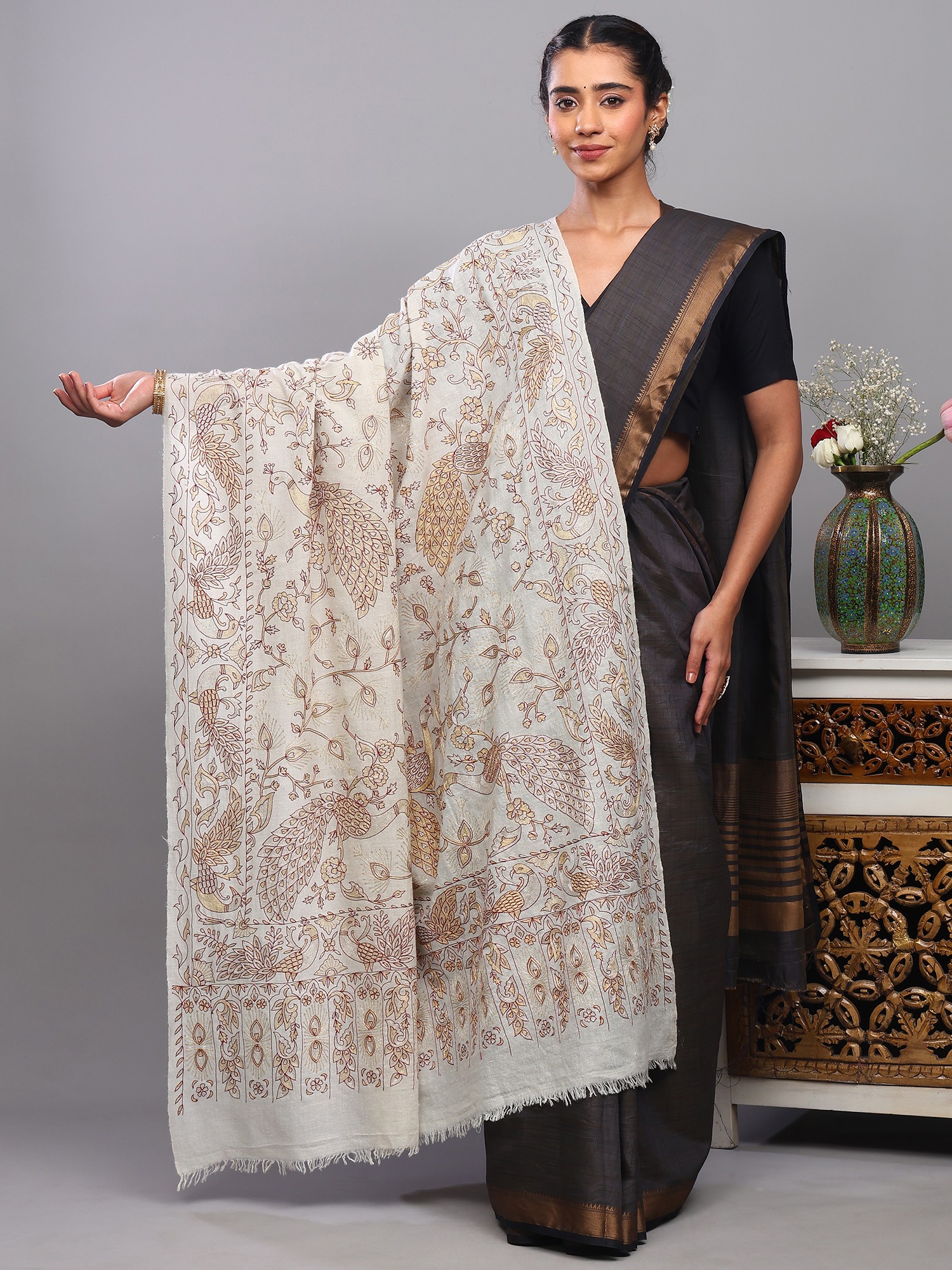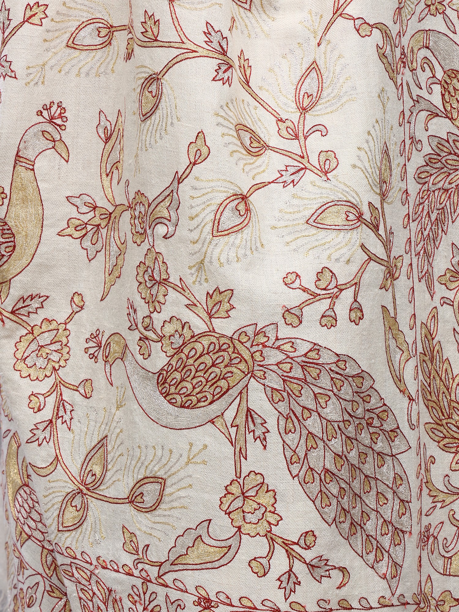 The true artistry of this shawl lies in its breathtaking embroidery. Adorning the entire expanse is a captivating motif featuring graceful peacocks perched on intricate tree branches. The skilled artisans have meticulously rendered these natural elements using a harmonious blend of golden and silver colored threads. This exquisite combination creates a subtle yet striking contrast against the off-white background, lending the design a rich, dimensional quality. Each feather of the peacock, each delicate leaf and branch, is brought to life with fine needlework, showcasing a dedication to detail that defines true luxury. The all-over pattern ensures that no matter how you drape or style this shawl, a piece of this enchanting scene will always be visible, captivating the eye.