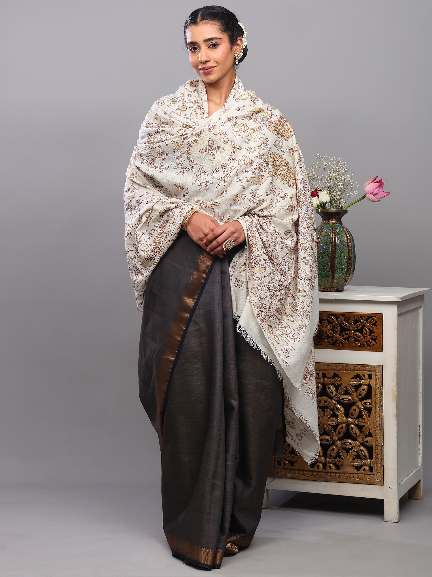 Off-White Pure Pashmina Shawl with Peacock on Tree Branch Embroidered in Golden-Silver Colored Thread on All-Over