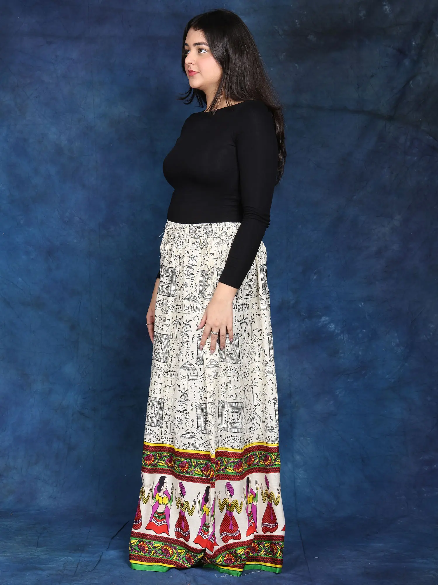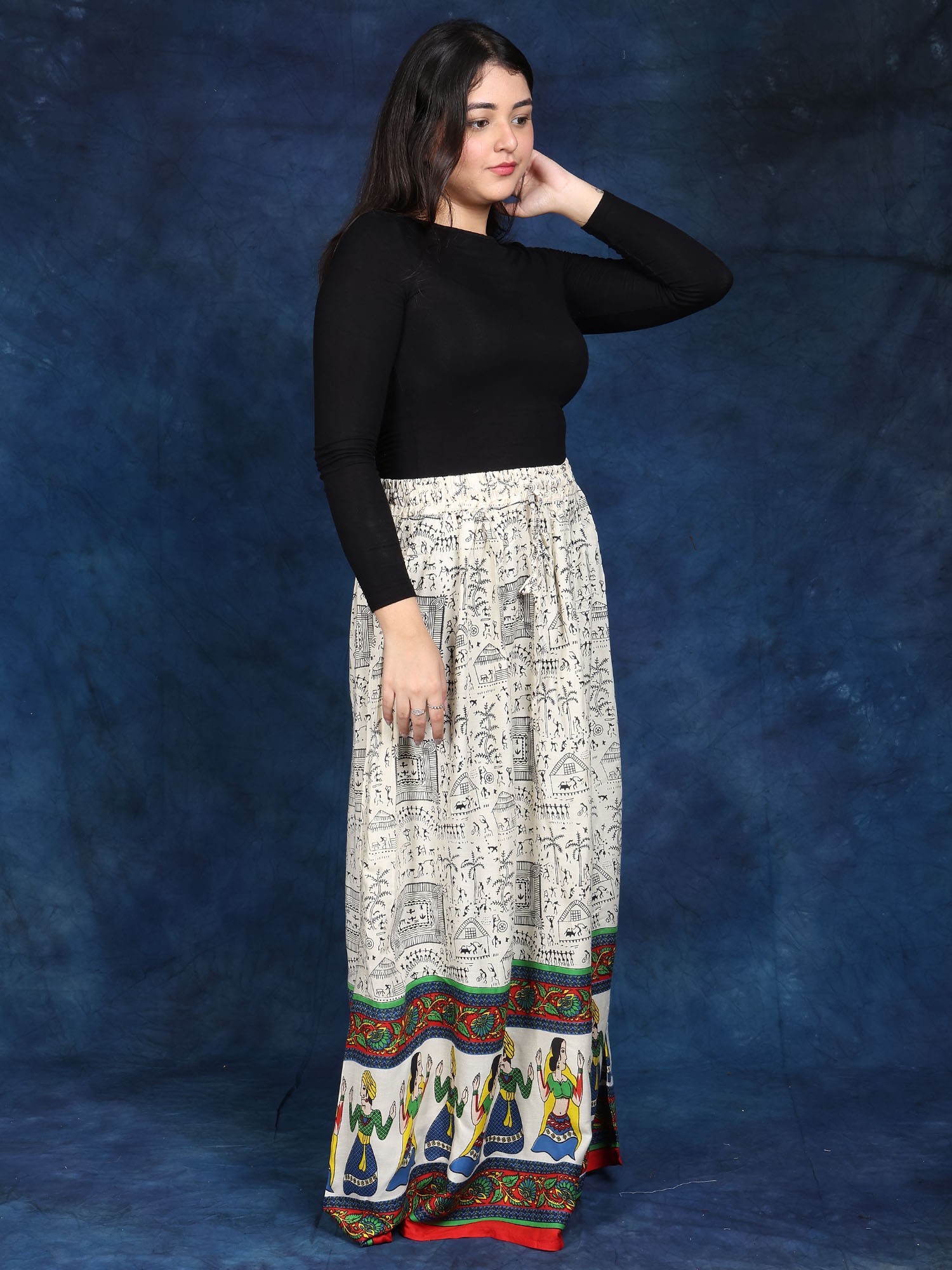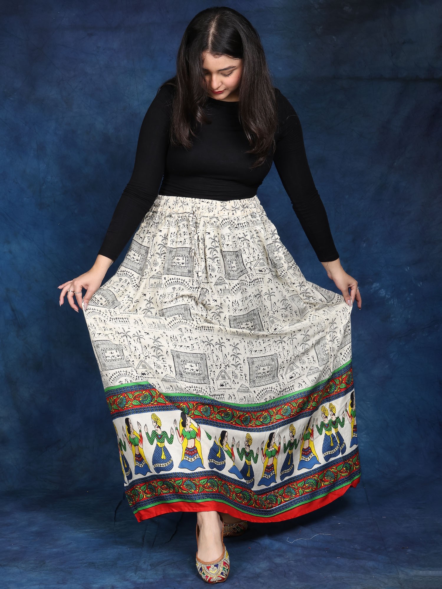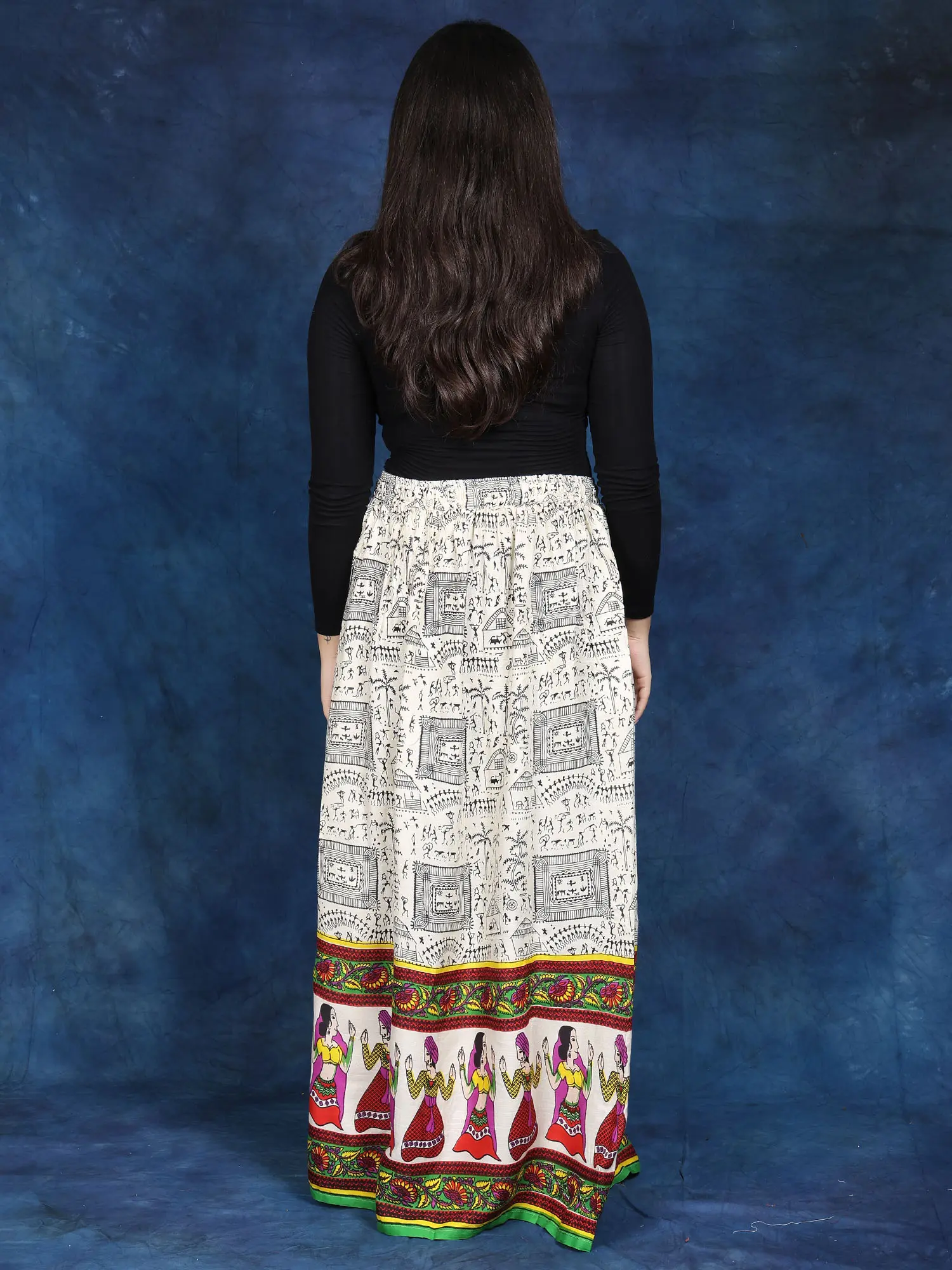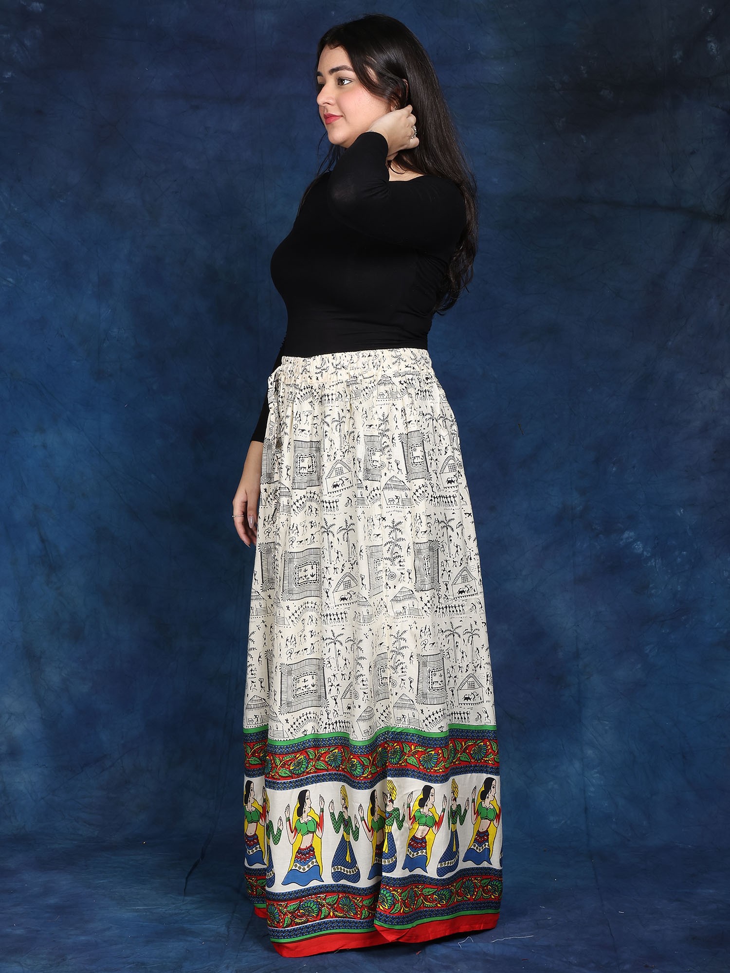 In the ethereal canvas of fashion, this Long Skirt is a masterpiece embroidered with threads of ethnic beauty. Its immaculate off-white colour, symbolic of purity, engulfs an individual in a peaceful embrace. Each stroke, embellished with elaborate Warli folk prints, tells a narrative about tradition and legacy, whispering ancient tales of love and celebration.