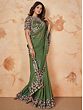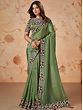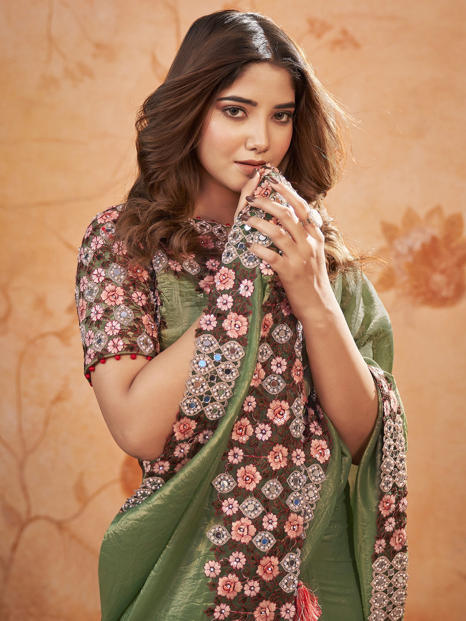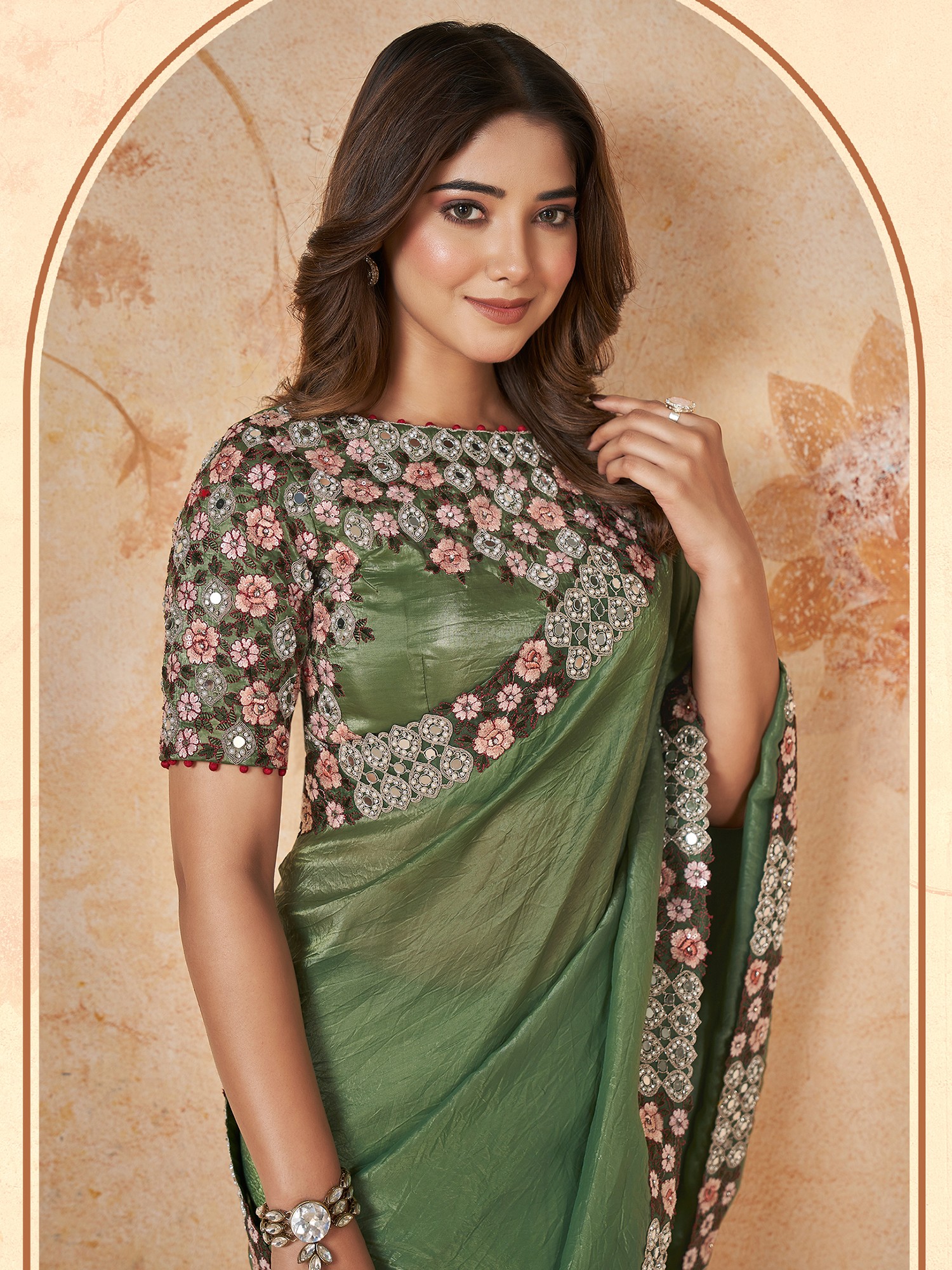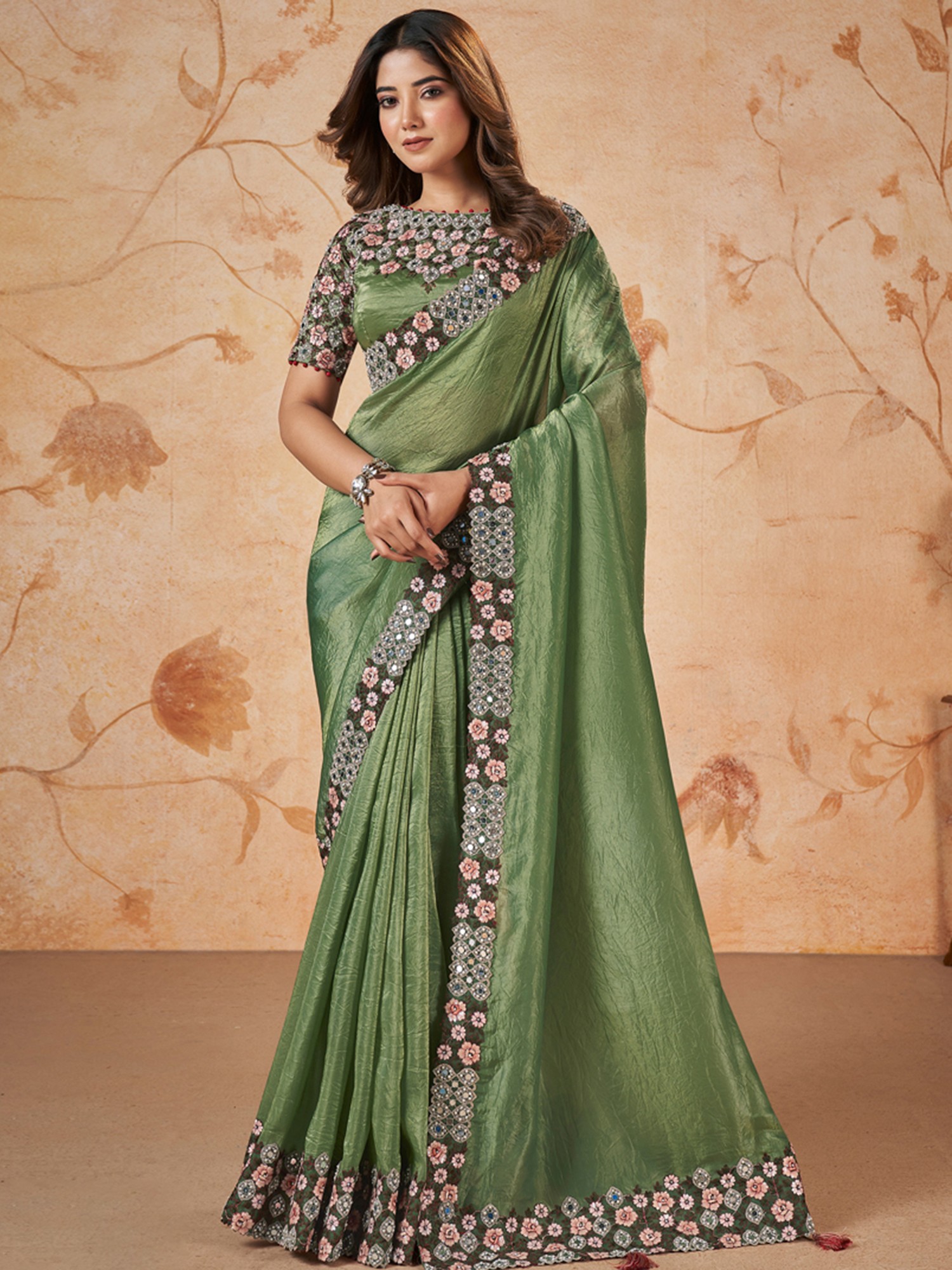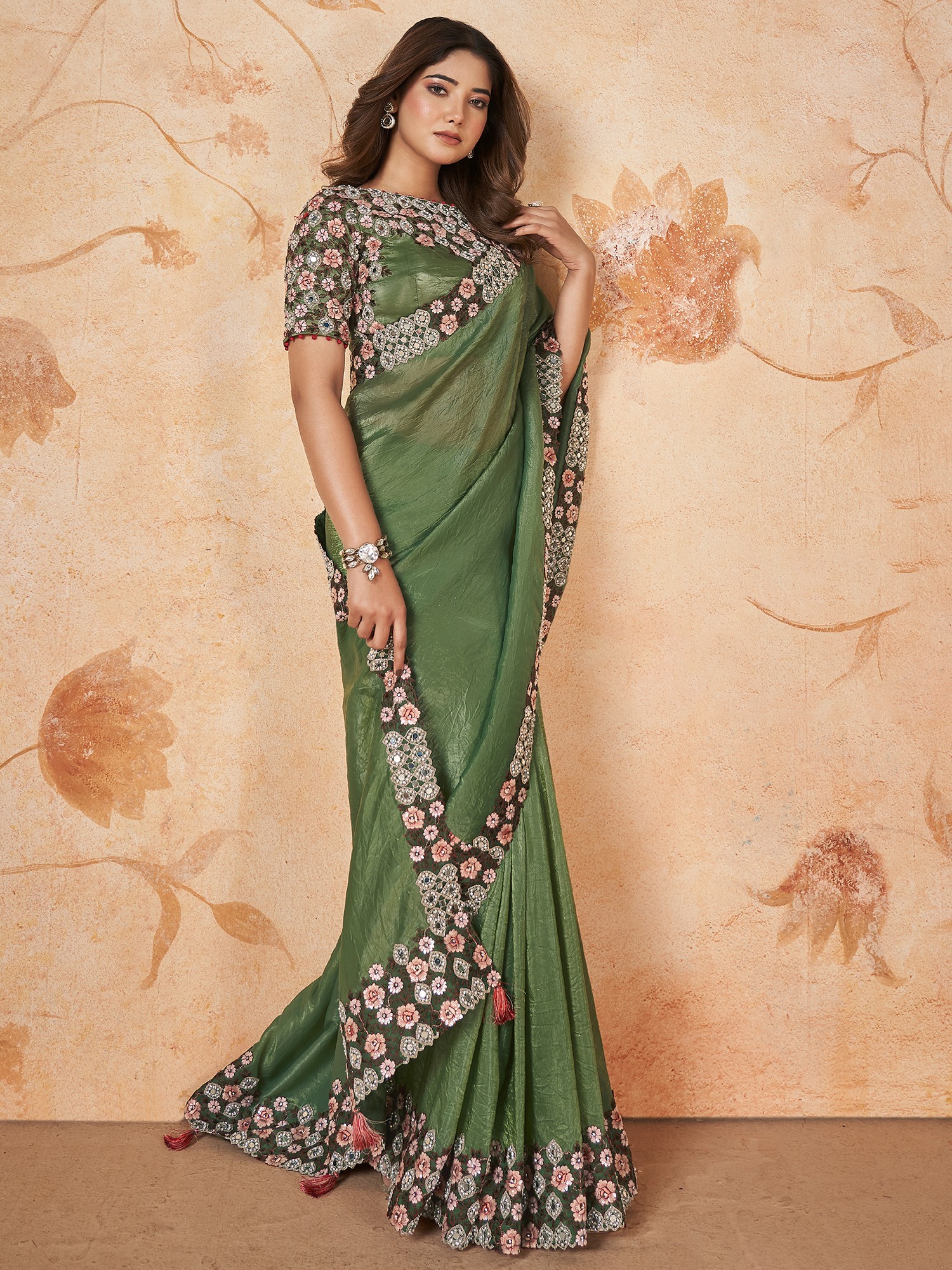 Olive-Drab Banarasi Crush Silk Cord Embroidered With Stone & Mirror Work Designer Saree With Blouse
