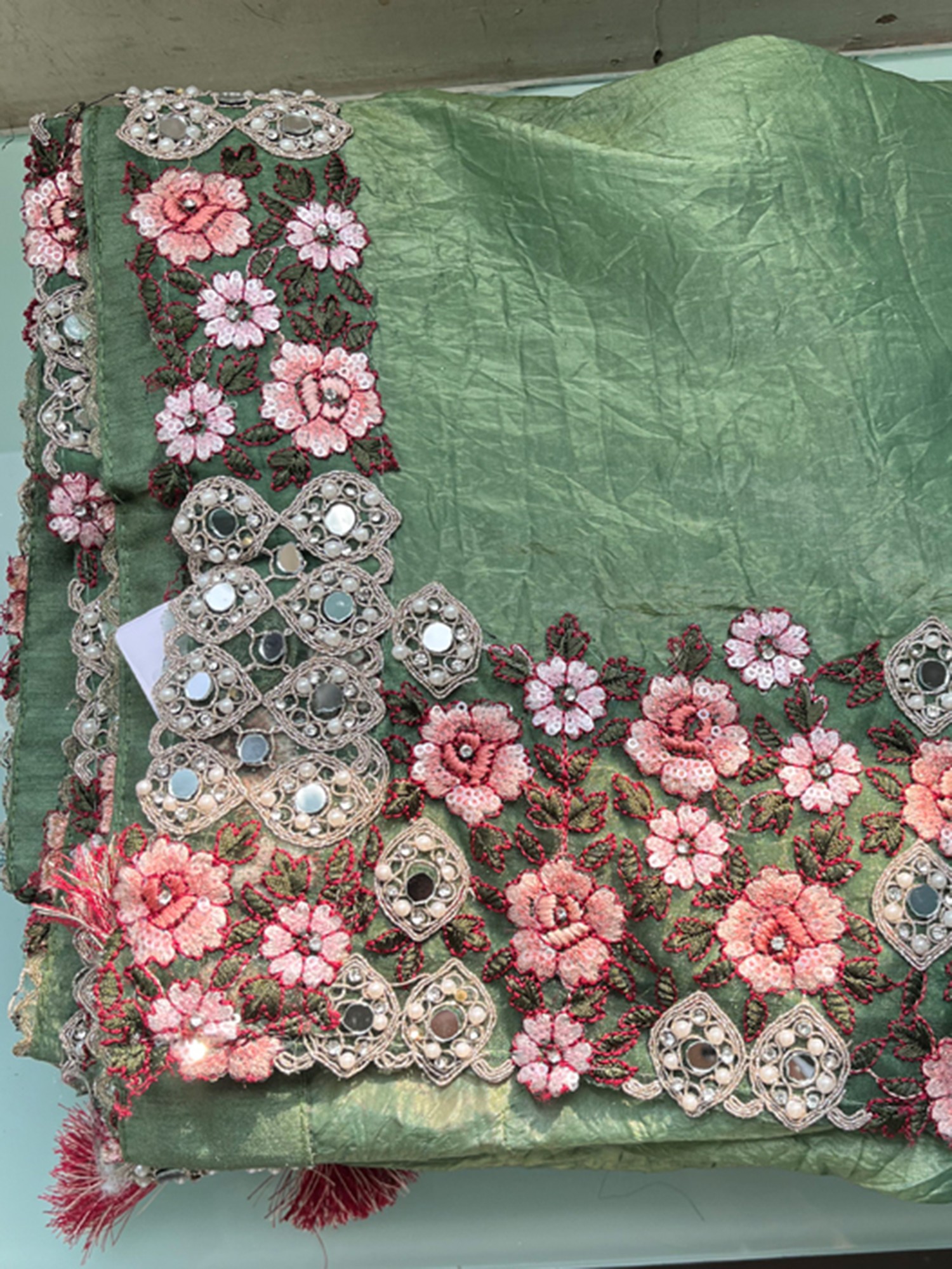 Tarragon Banarasi Silk Saree with Heavy Beaded Mirror Sequins & Thread Work All-over