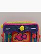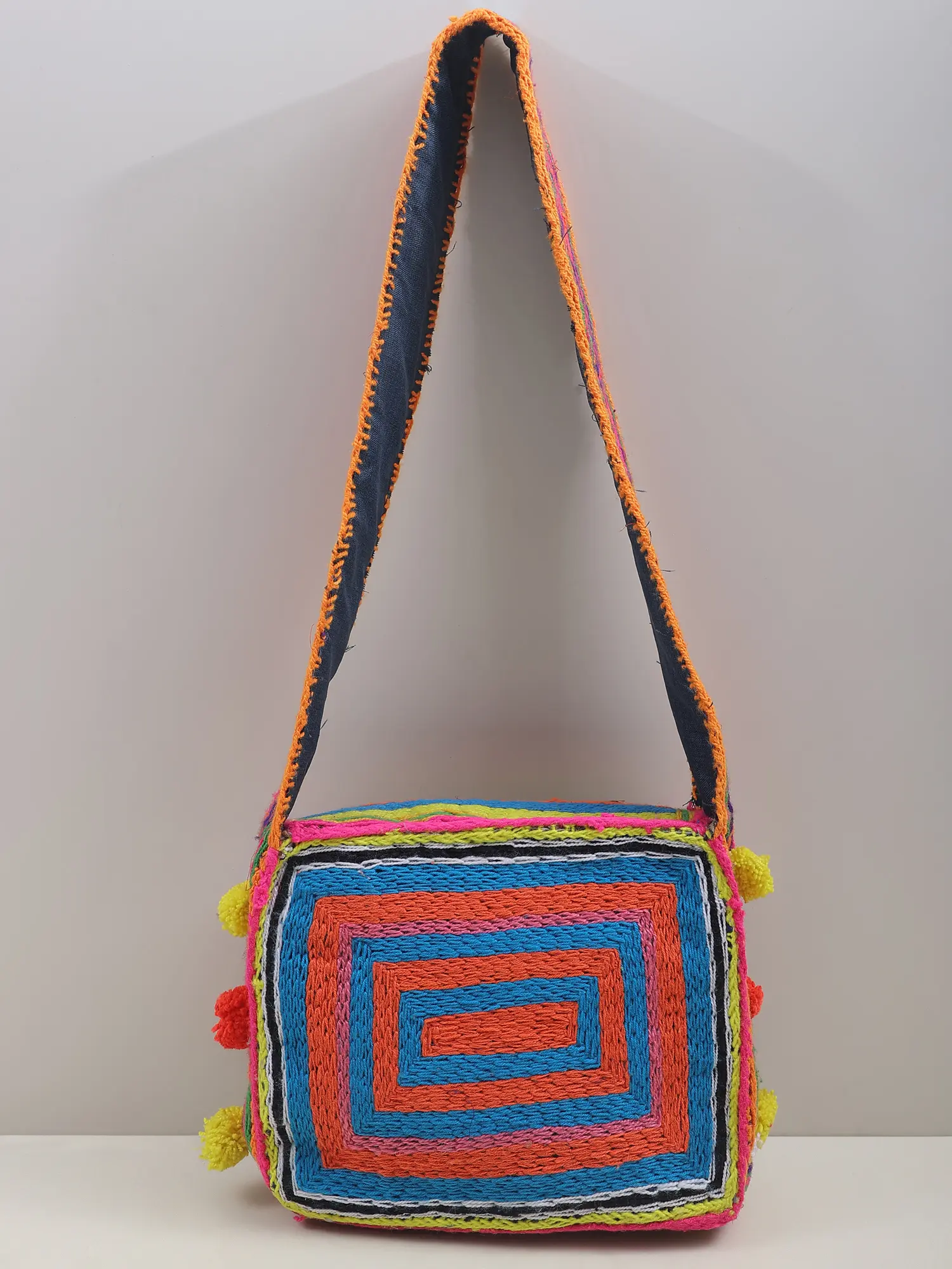 The most striking feature of this bag is its riot of color. Bold stripes of neon green, hot pink, sunshine yellow, ocean blue, fiery orange, and deep purple intertwine, creating a visually dynamic and joyful aesthetic. This vibrant palette is not merely decorative; it’s believed to represent the diverse energies and blessings that flow through sacred sites like Haridwar. Centered on the flap, the auspicious Om symbol, rendered in a contrasting pink, serves as a focal point, embodying peace, unity, and the universe. The playful addition of fluffy pom-poms in cheerful yellow, green, and red adds a whimsical touch, making this bag an instant mood-booster.