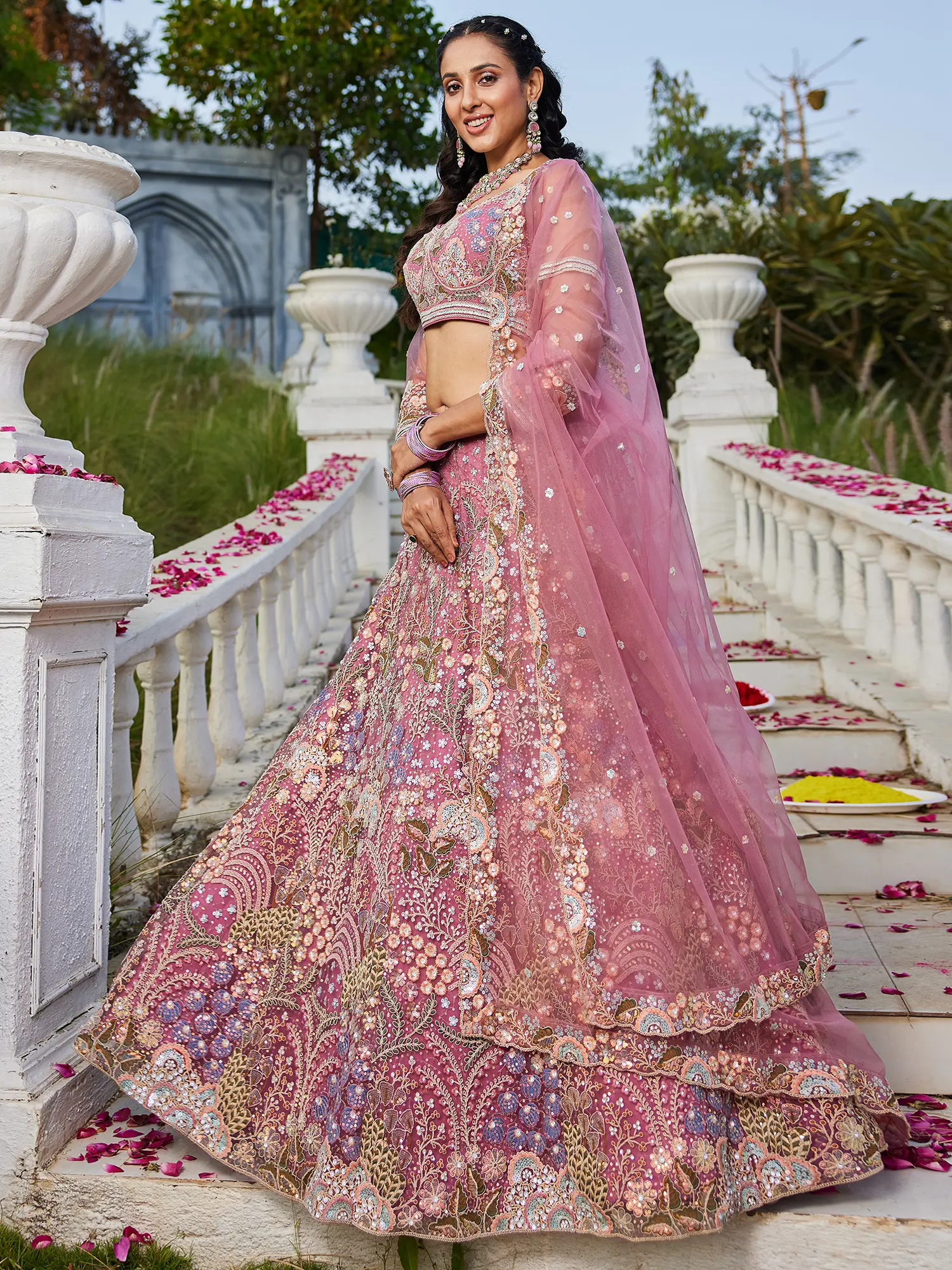Light-Pink Soft Net Thread Embroidered Lehenga Choli with Sheer Dupatta