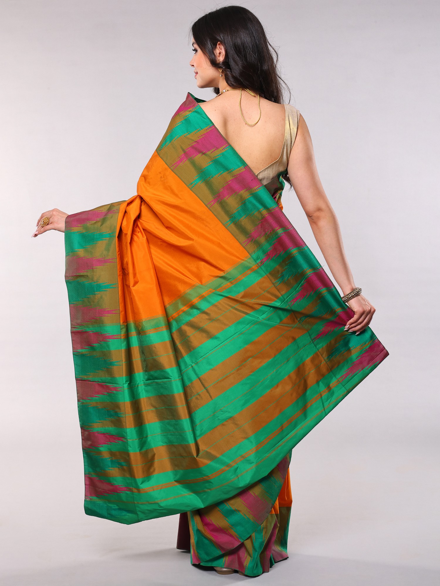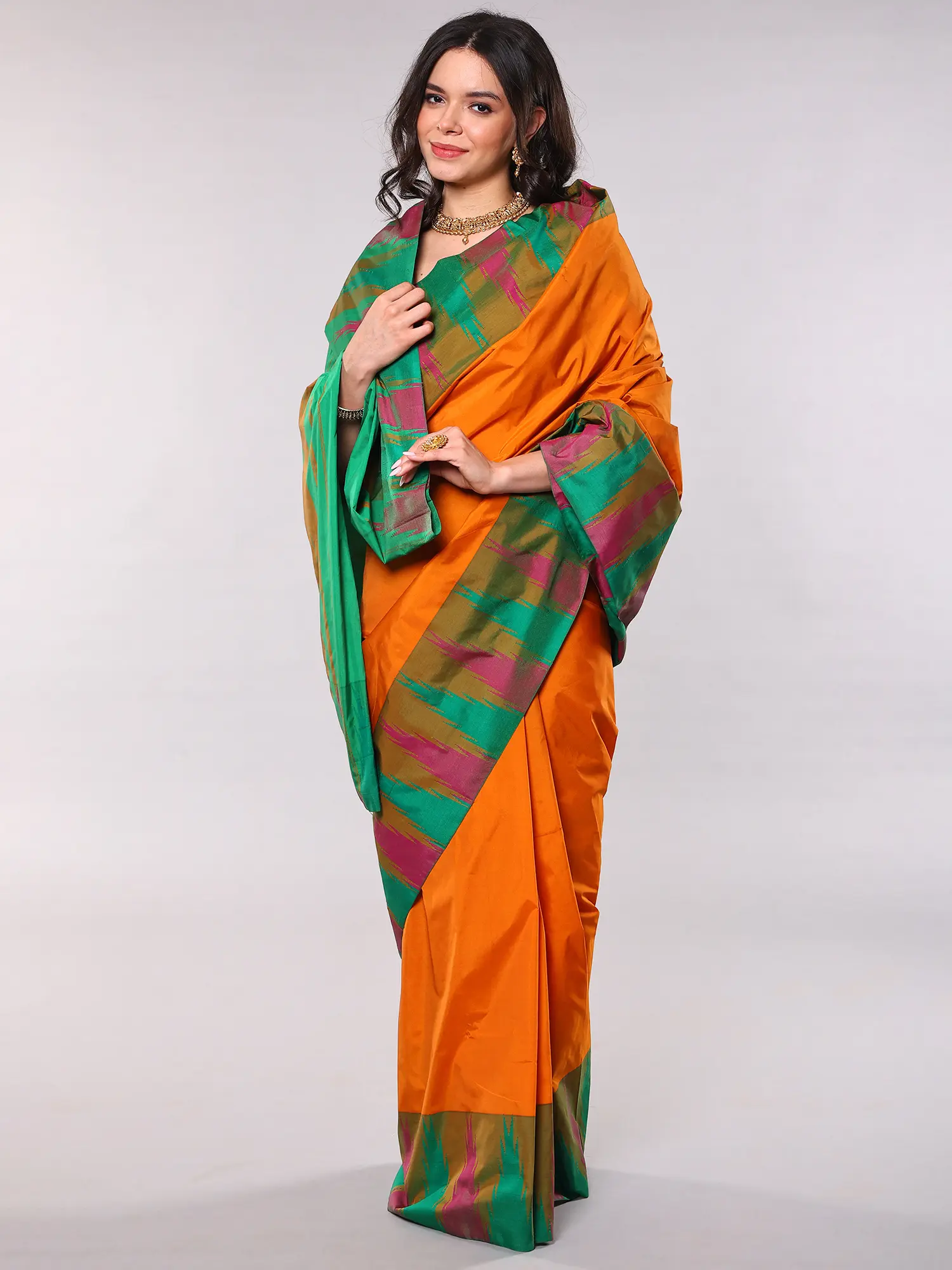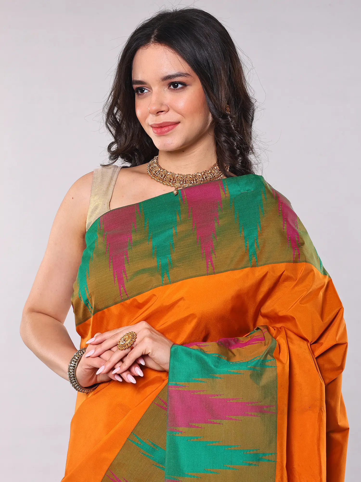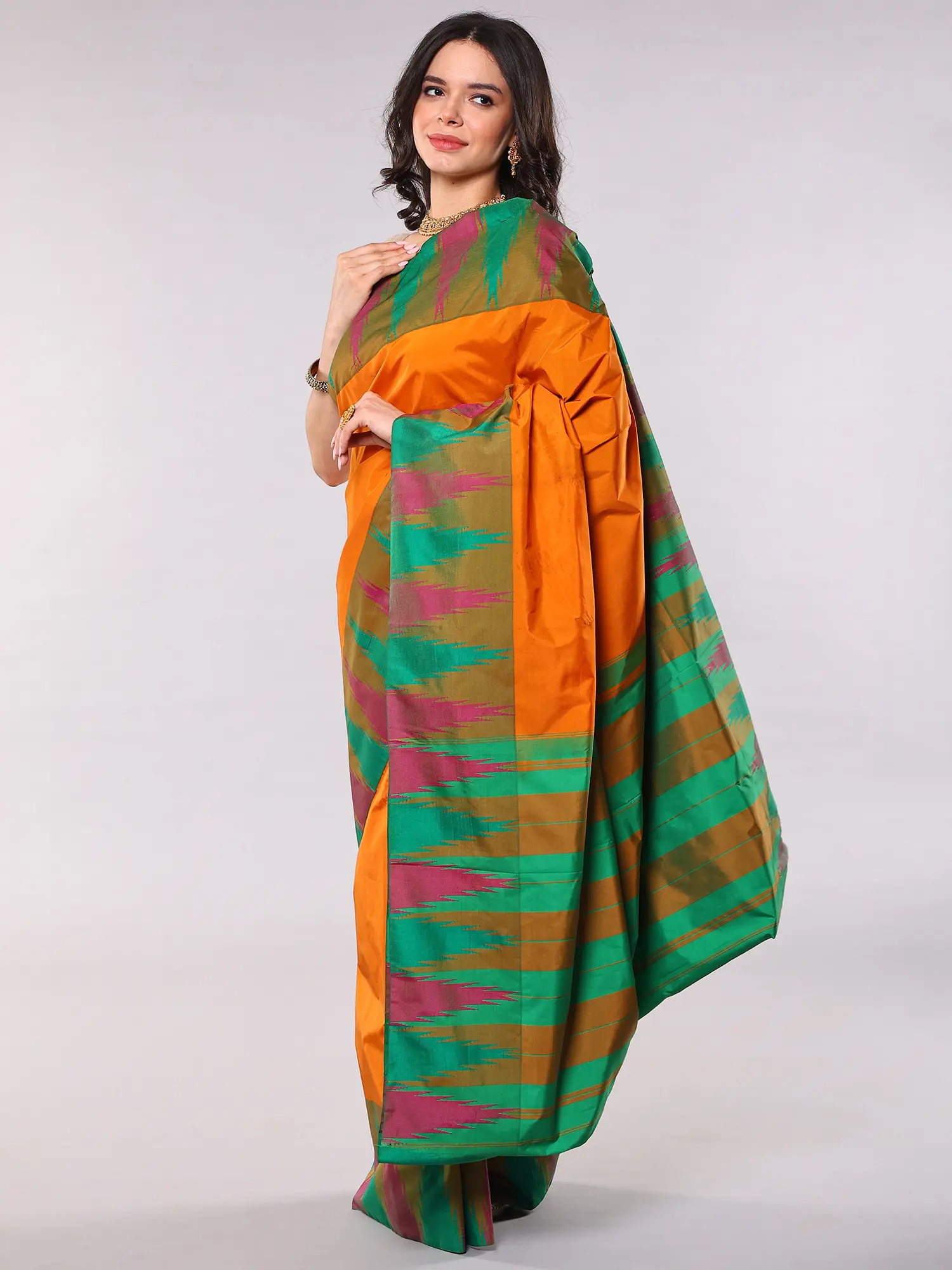 Golden-Orange Gajam Temple Border Pure Silk Saree from Kumbakonam with Golden Thread Work and Dual Colored Border