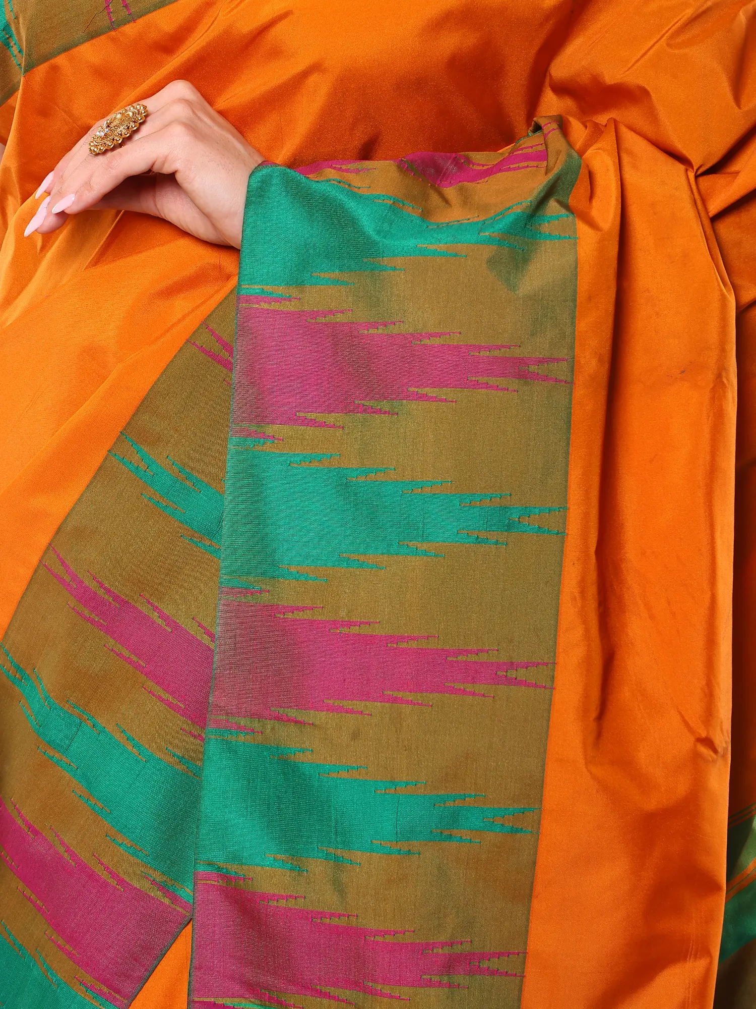 The striking contrast of the warm, radiant orange body against the bold, geometric patterns of the border and pallu creates a captivating visual. You'll appreciate the subtle sheen of the art silk, which catches the light beautifully, highlighting the rich jewel tones of emerald green and fuchsia woven into the intricate motifs. The generous drape ensures a flattering silhouette for every wearer, with the accompanying blouse and underskirt expertly tailored to your precise measurements for a flawless fit.