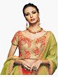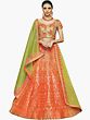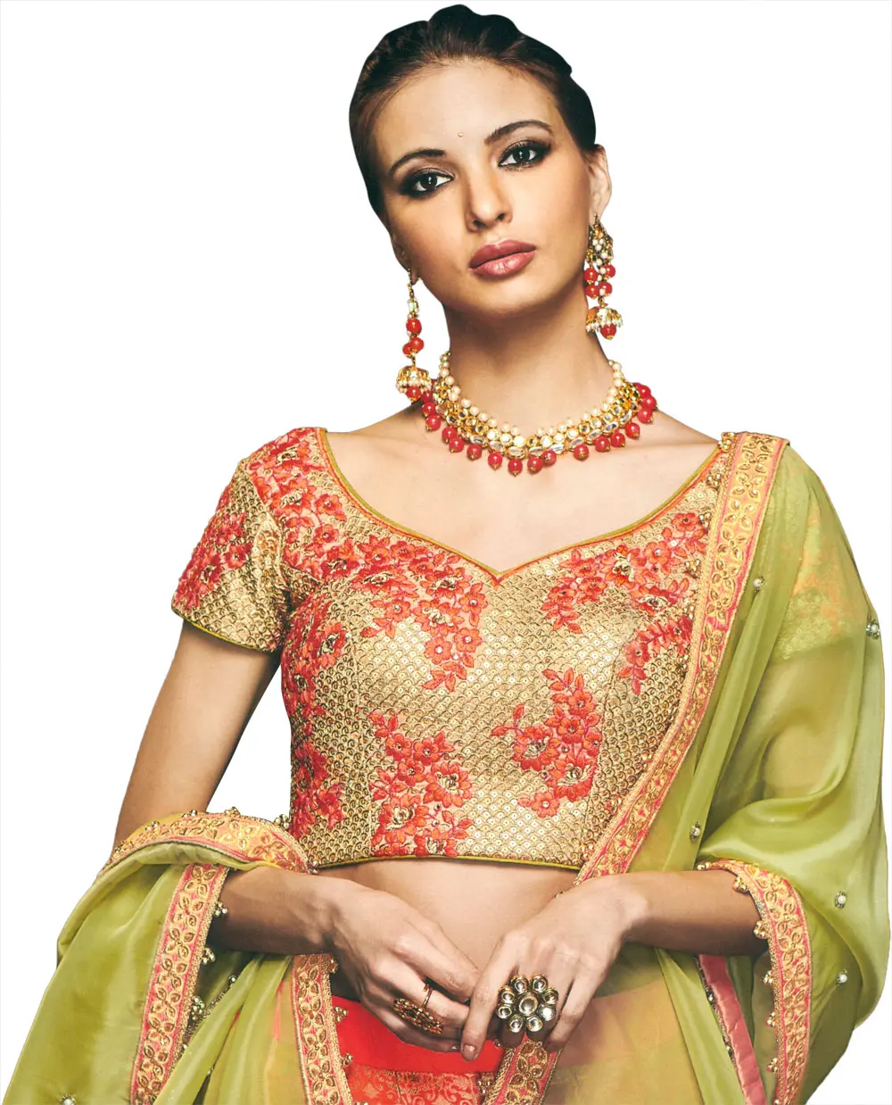 The finer details of this ensemble are what makes this a signature pick. The dupatta is sparsely embellished with faux pearls across the field and along the edges, which feature orange floral embellishments to match the skirt. The skirt itself is densely brocaded in gold, conveying oodles of traditional glam. The choli is the most statement-making aspect of this lehenga. The ultra-feminine curve of the neckline shows just the right bit of decolletage, while the embroidery against the thick golden fabric complements the outfit. Teamed with the right gold pieces, this lehenga just might end up being the most talked about thing at the wedding!