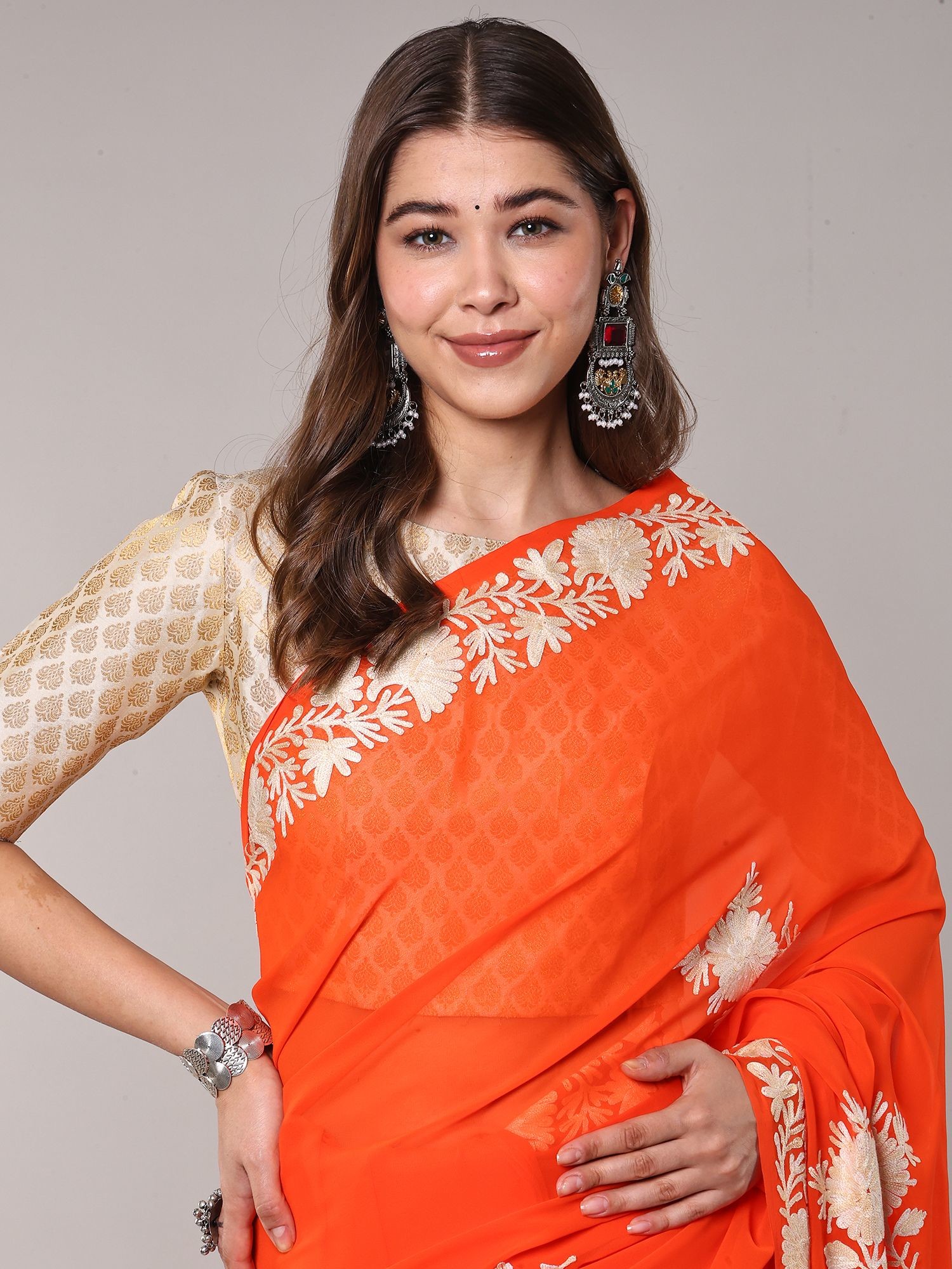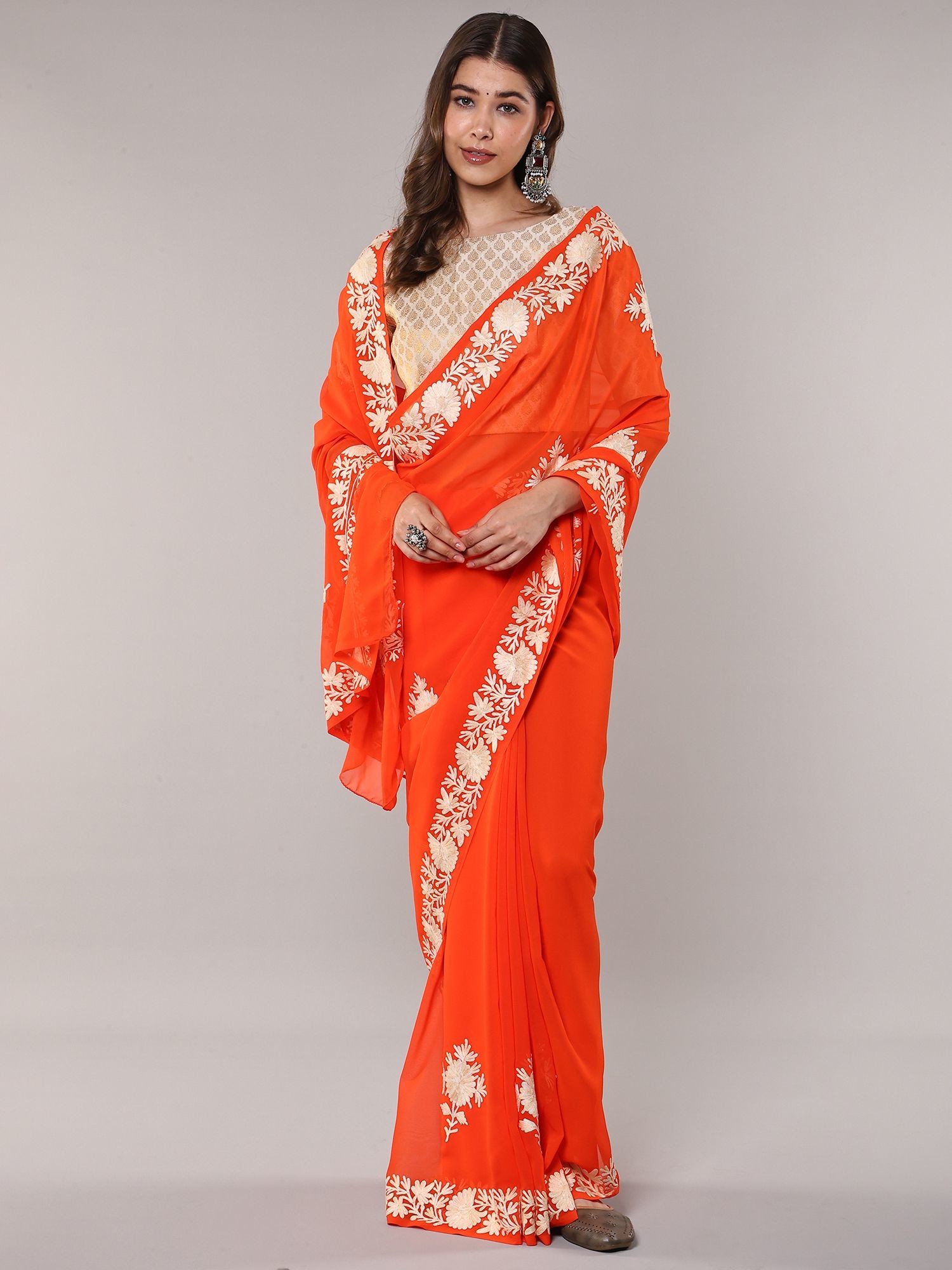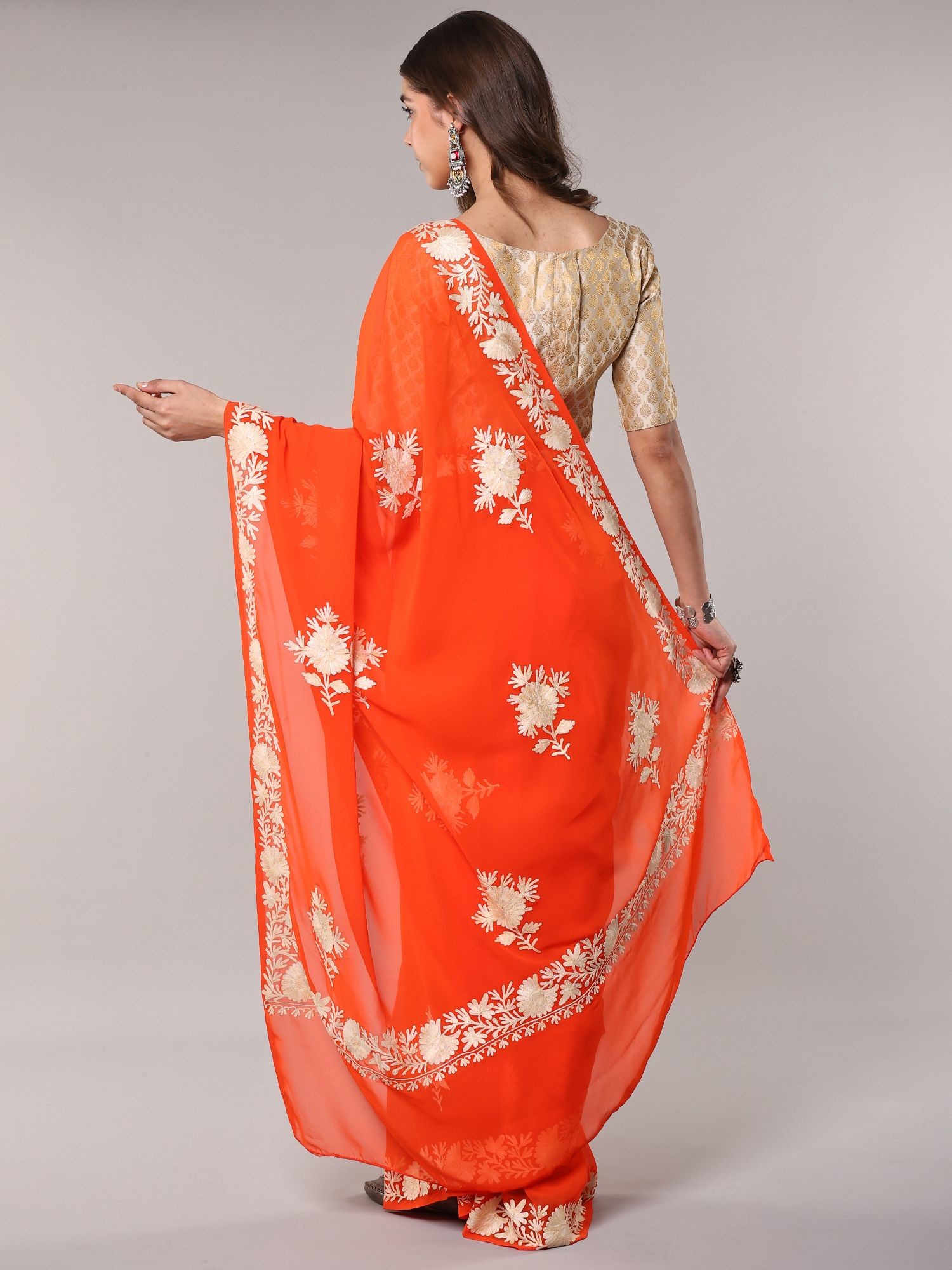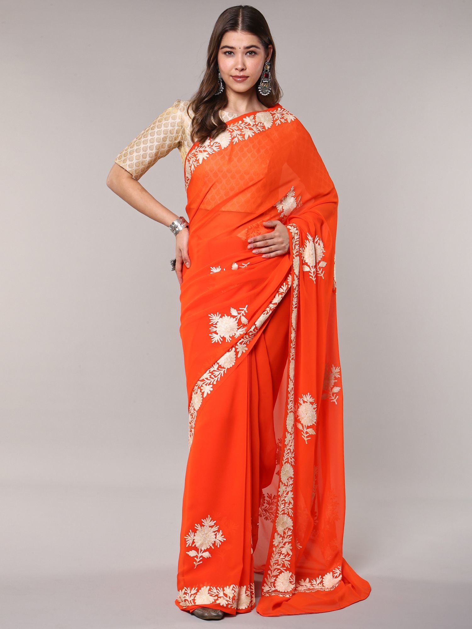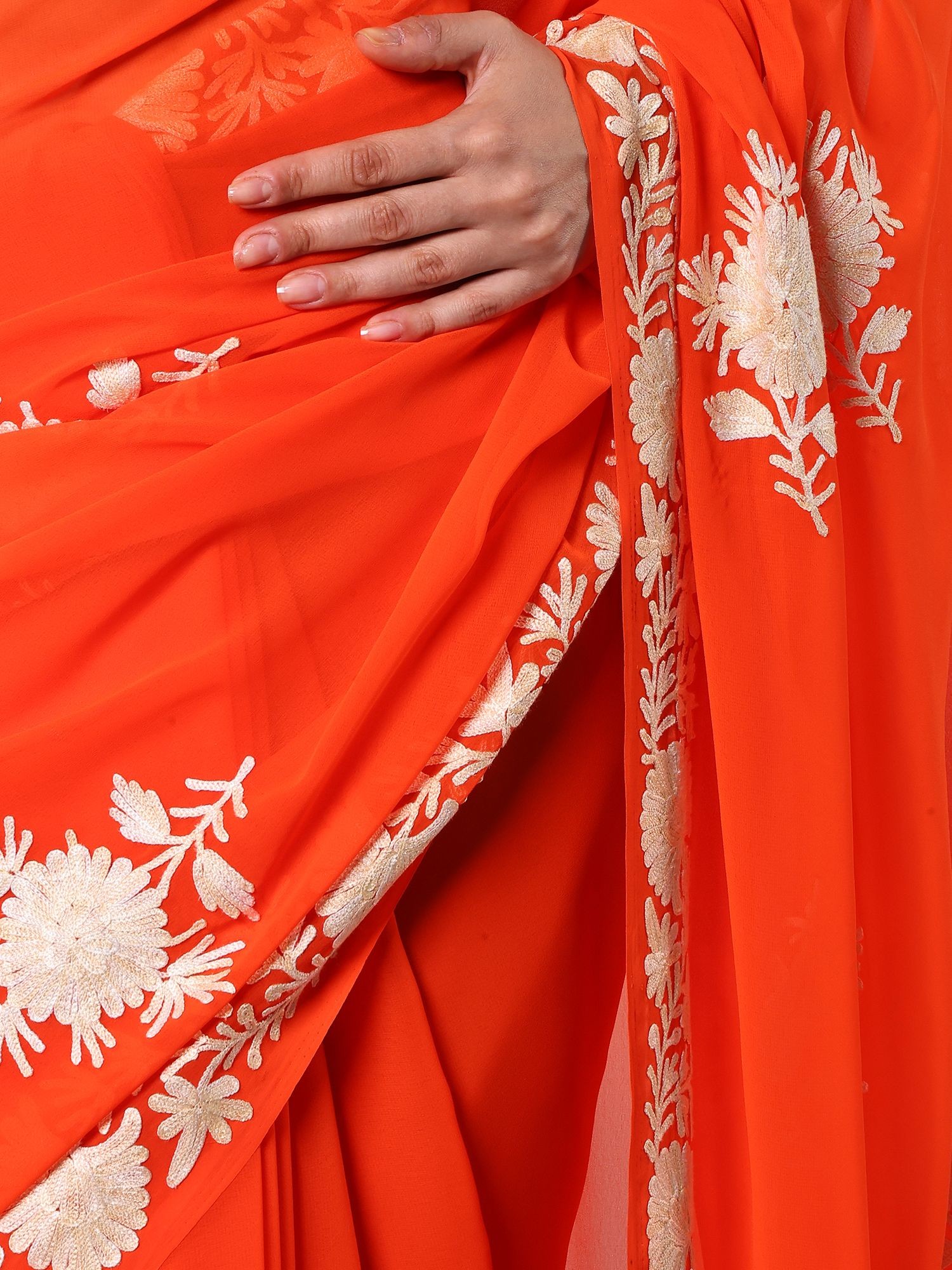 Kashmiri Aari Embroidered Georgette Saree in Apricot Hue