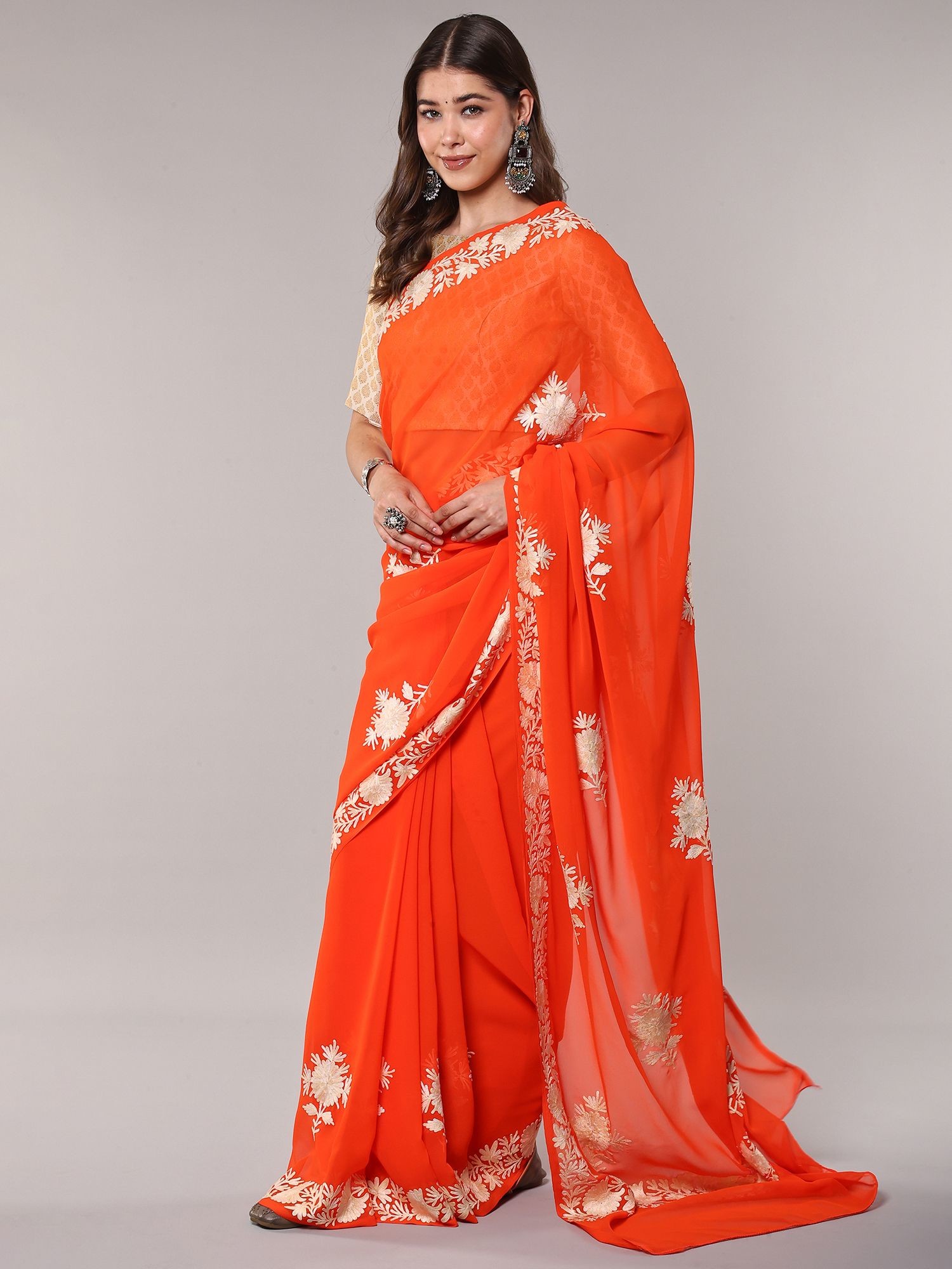 Embroidered Georgette Saree Featuring Maple Leaf Vines in Chain Stitch