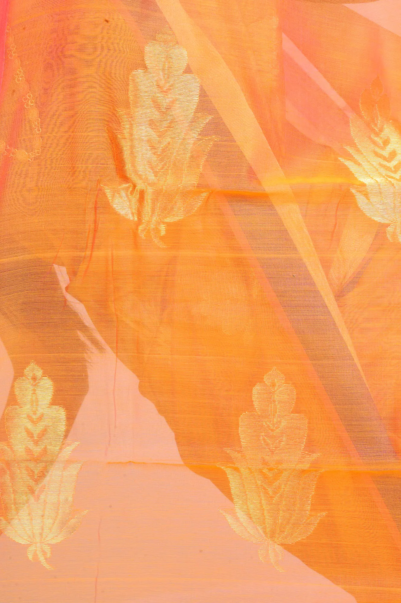 Adorn yourself in elegance with our Orange-Pearl Chanderi Saree, a symphony of grace and allure. The lovely orange hue envelops you in warmth, while handwoven golden leaves cascade like whispers of nature. Mesmerizing against the backdrop, they create an ethereal dance of artistry. The broad border, adorned with three captivating colors, frames the drape with regal charm. Crafted from cotton silk, it embraces you in comfort and luxury. This saree isn't just attire; it's a canvas of beauty and style. With every step, you capture hearts, celebrating the perfect harmony of color, motif, and fabric.