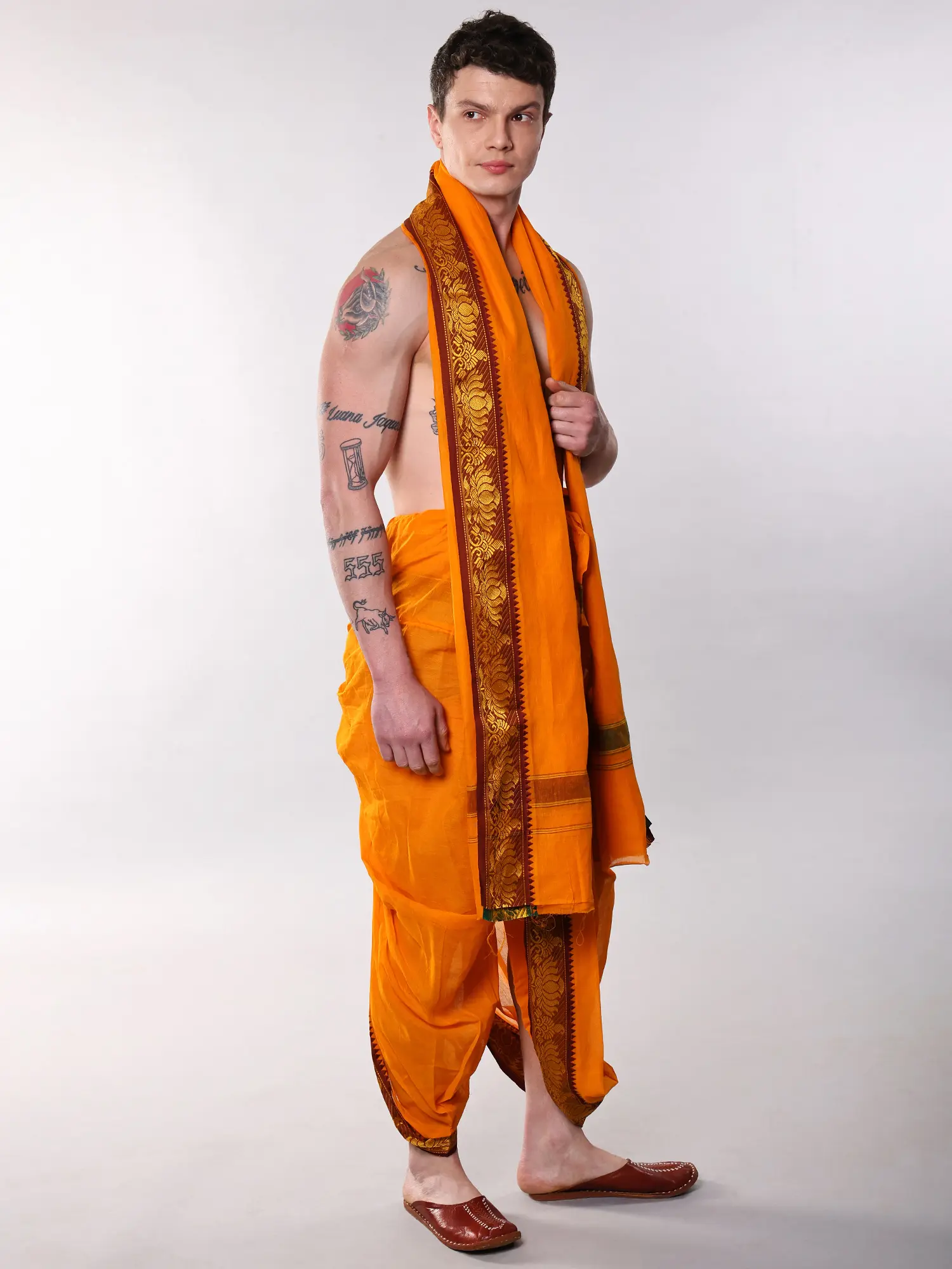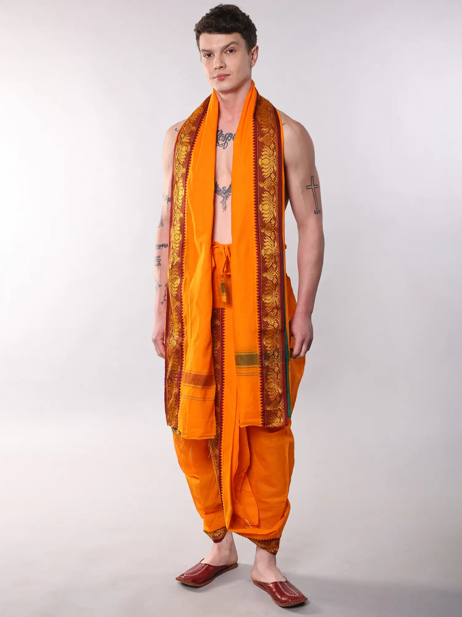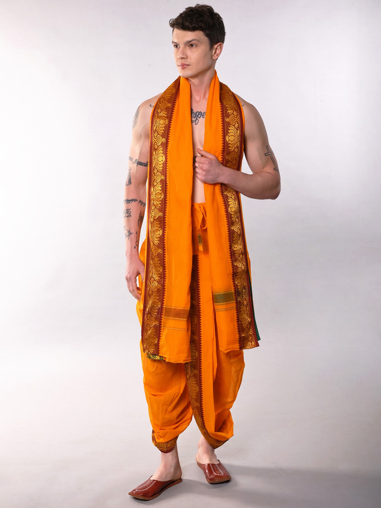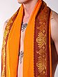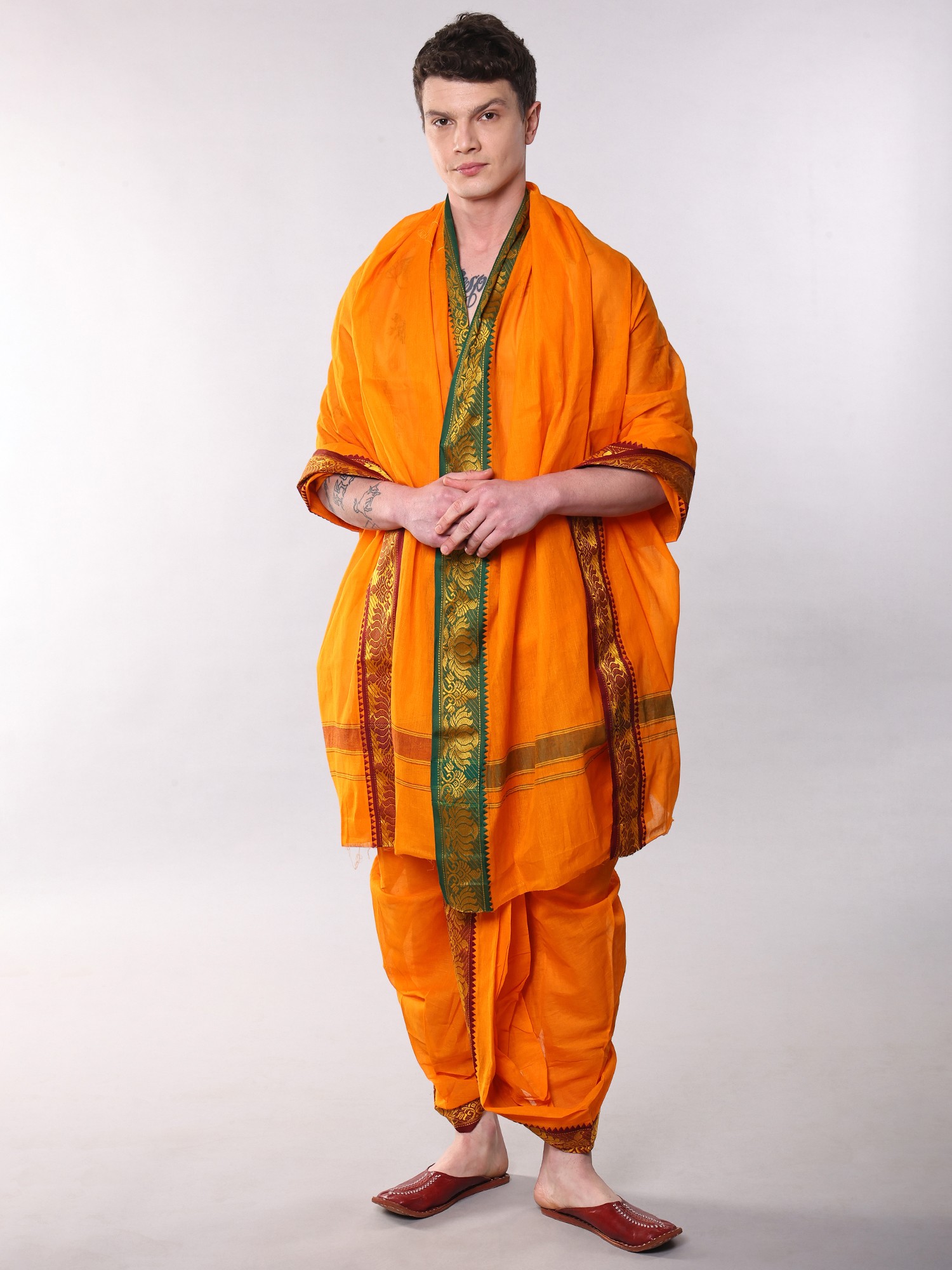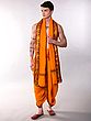 Features a vibrant orange-peel hue dhoti and matching angavastram.