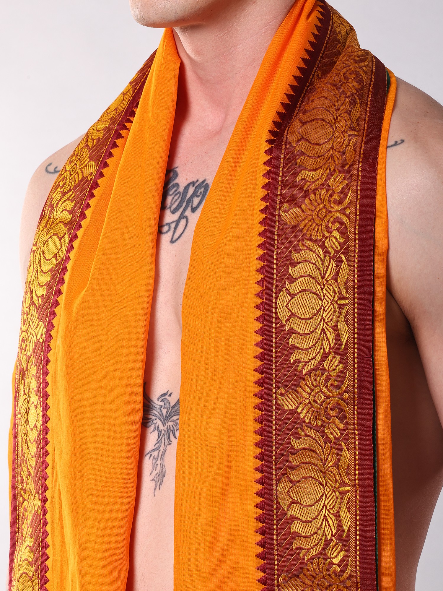The vibrant orange-peel shade offers a striking visual appeal, while the ready-to-wear dhoti ensures effortless wearability. Its generous dimensions provide a comfortable fit, allowing for graceful movement. Complementing this, the accompanying angavastram, measuring a substantial length, features a stunning thread-woven lotus border that adds an opulent flourish. This intricate border, with its rich patterns, transforms the garment into a statement of artistry.