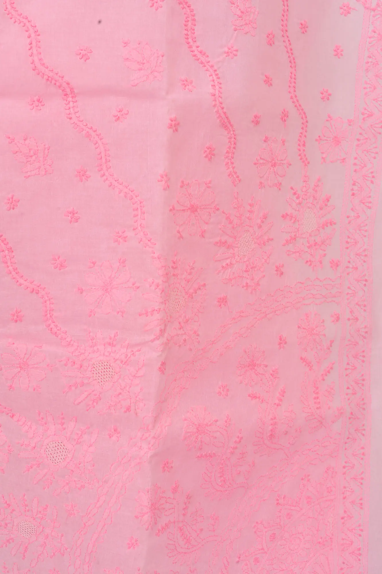 Chikan embroidery, originating from the Nawabs of Lucknow, is a highly detailed and intricate art form. The delicate handwork on this sari showcases classic Chikan motifs like 'kairi' (mango), 'bel' (creeper), and various floral patterns. The subtle, tonal embroidery in a slightly darker shade of pink against the pastel base adds depth and dimension without overpowering the delicate aesthetic. This is a piece that speaks volumes through its refined details and the sheer skill involved in its creation. Wearing this sari is an invitation to connect with a rich cultural legacy and to appreciate the beauty of handmade artistry. ––––––––––––––––––––