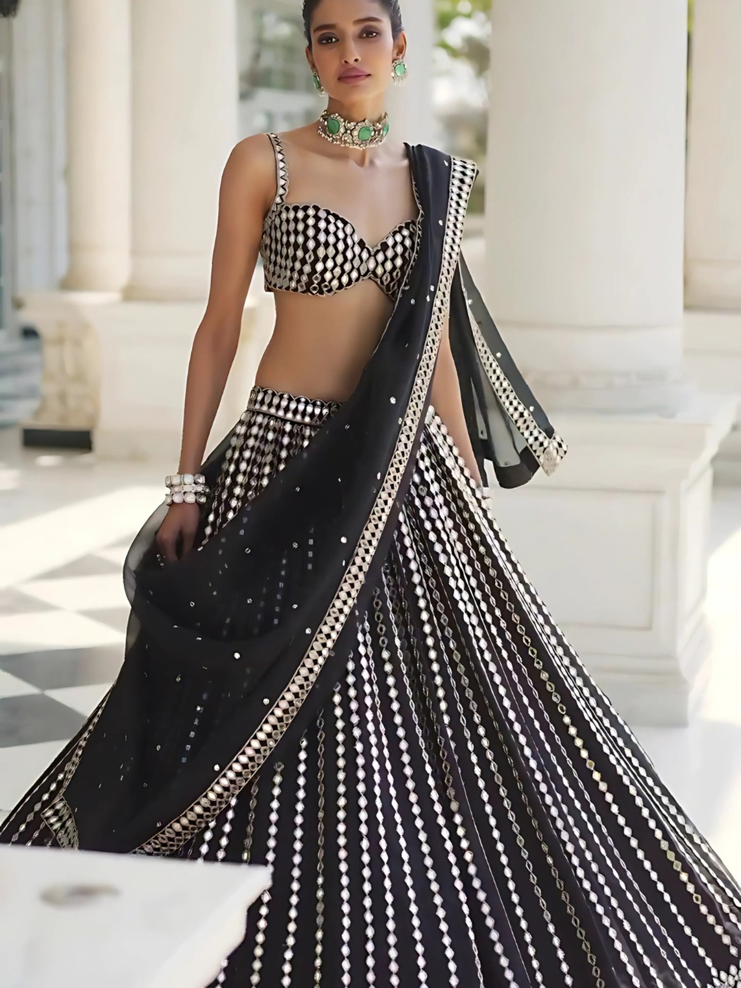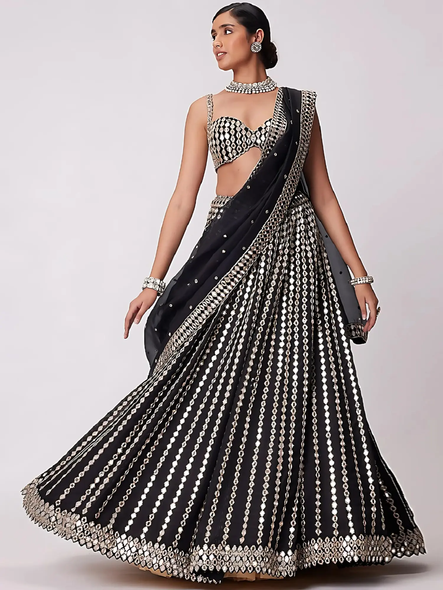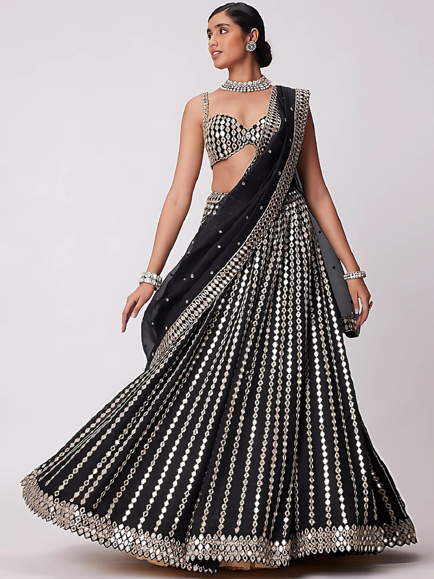 Bottle-Green Net Beads and Golden Thread Embroidery Lehenga Choli with Cutwork Dupatta