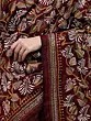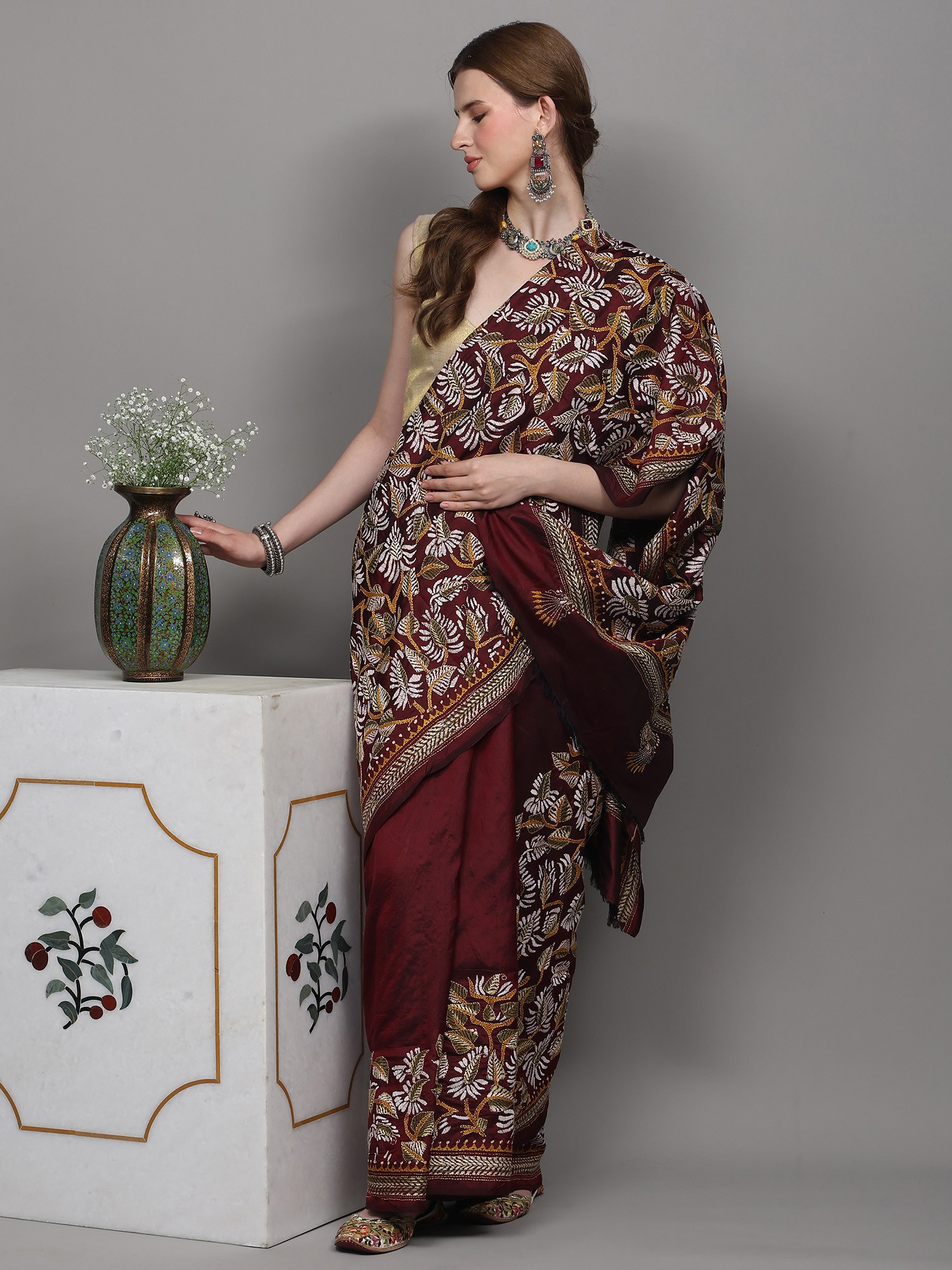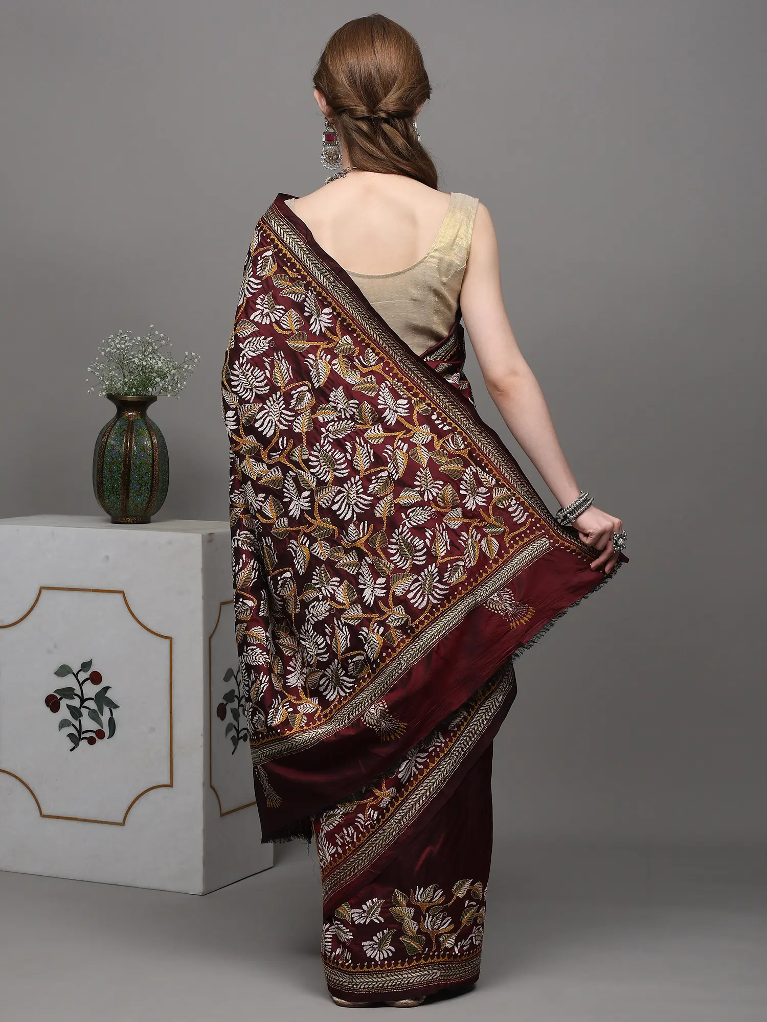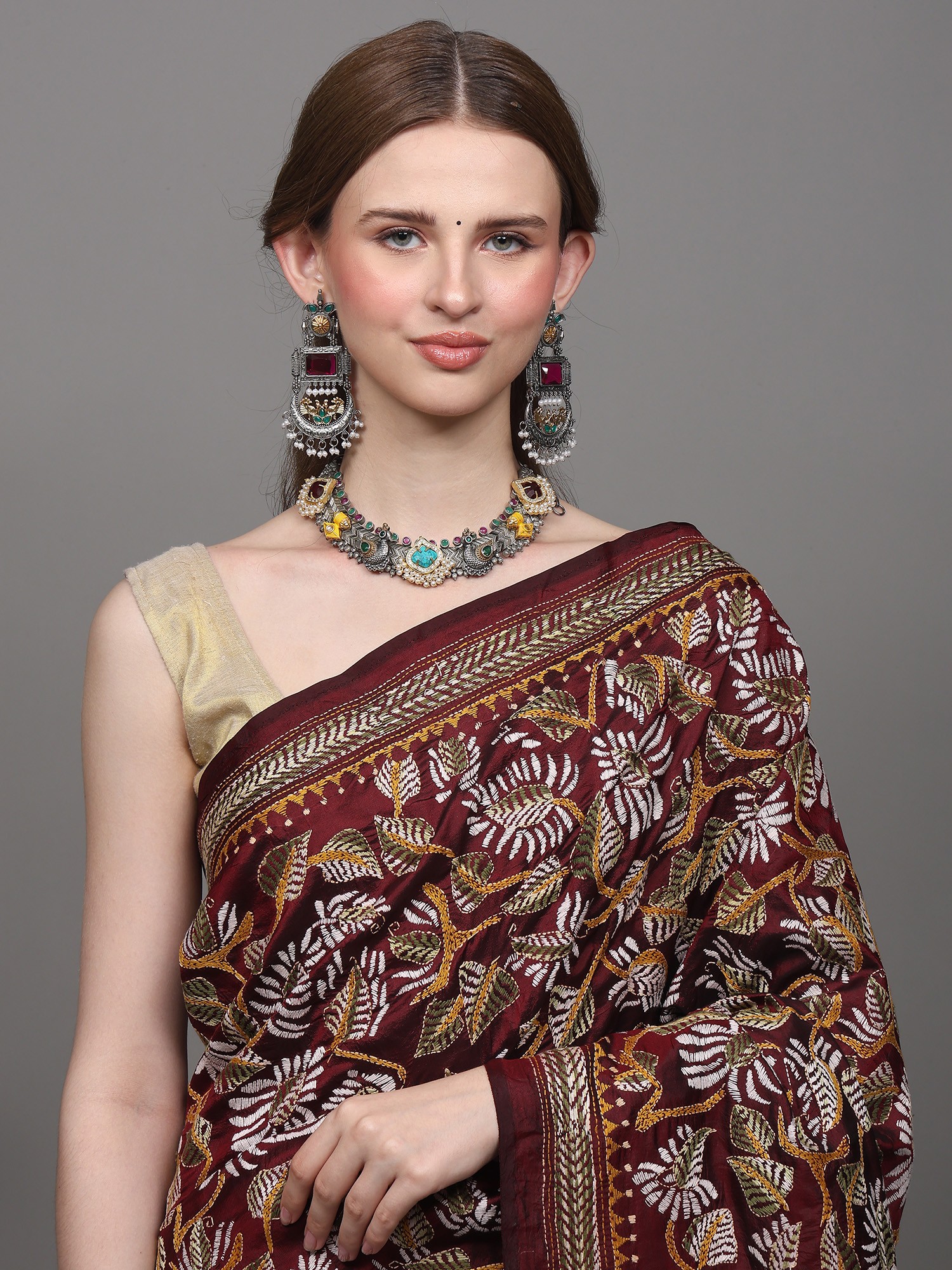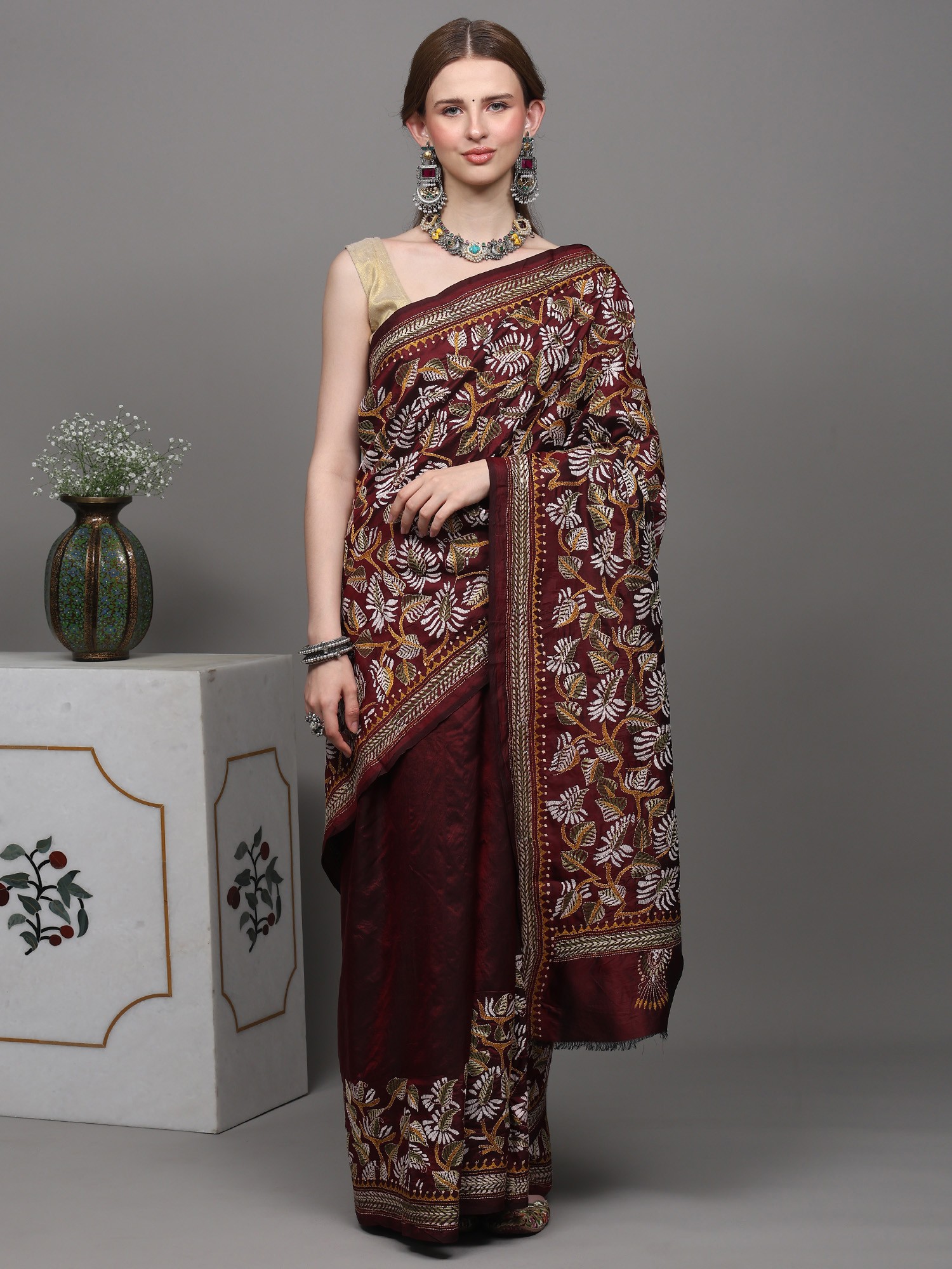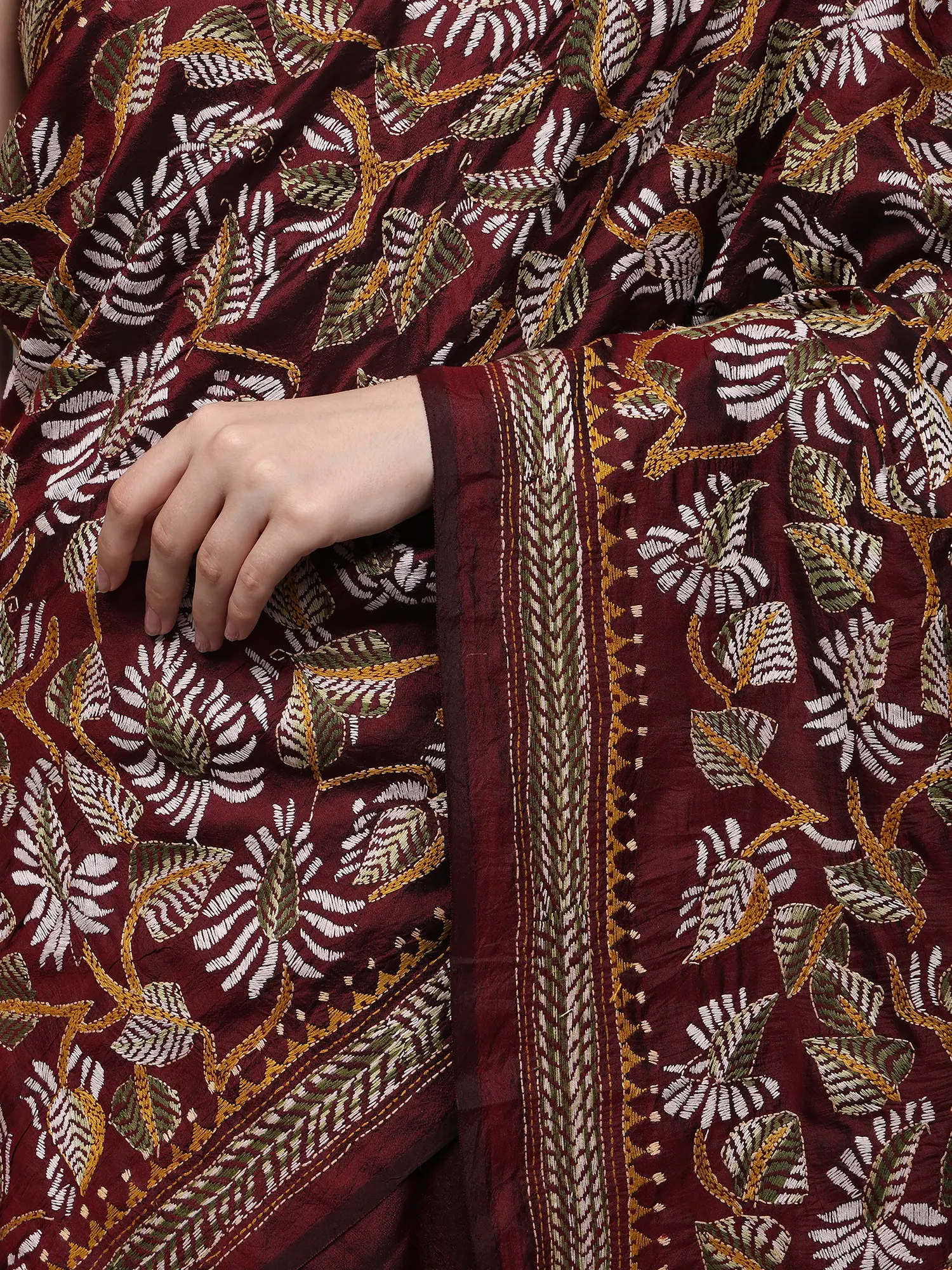 The Oxblood-Brown Kantha Saree from Kolkata is a mesmerizing masterpiece that effortlessly blends tradition with contemporary elegance. Crafted from the finest silk fabric, its rich oxblood-brown hue evokes a sense of depth and sophistication. Hand-embroidered with intricate paisleys and foliage, this sari showcases the timeless art of Kantha work, which creates a lavish overlay of blossoms and patterns.