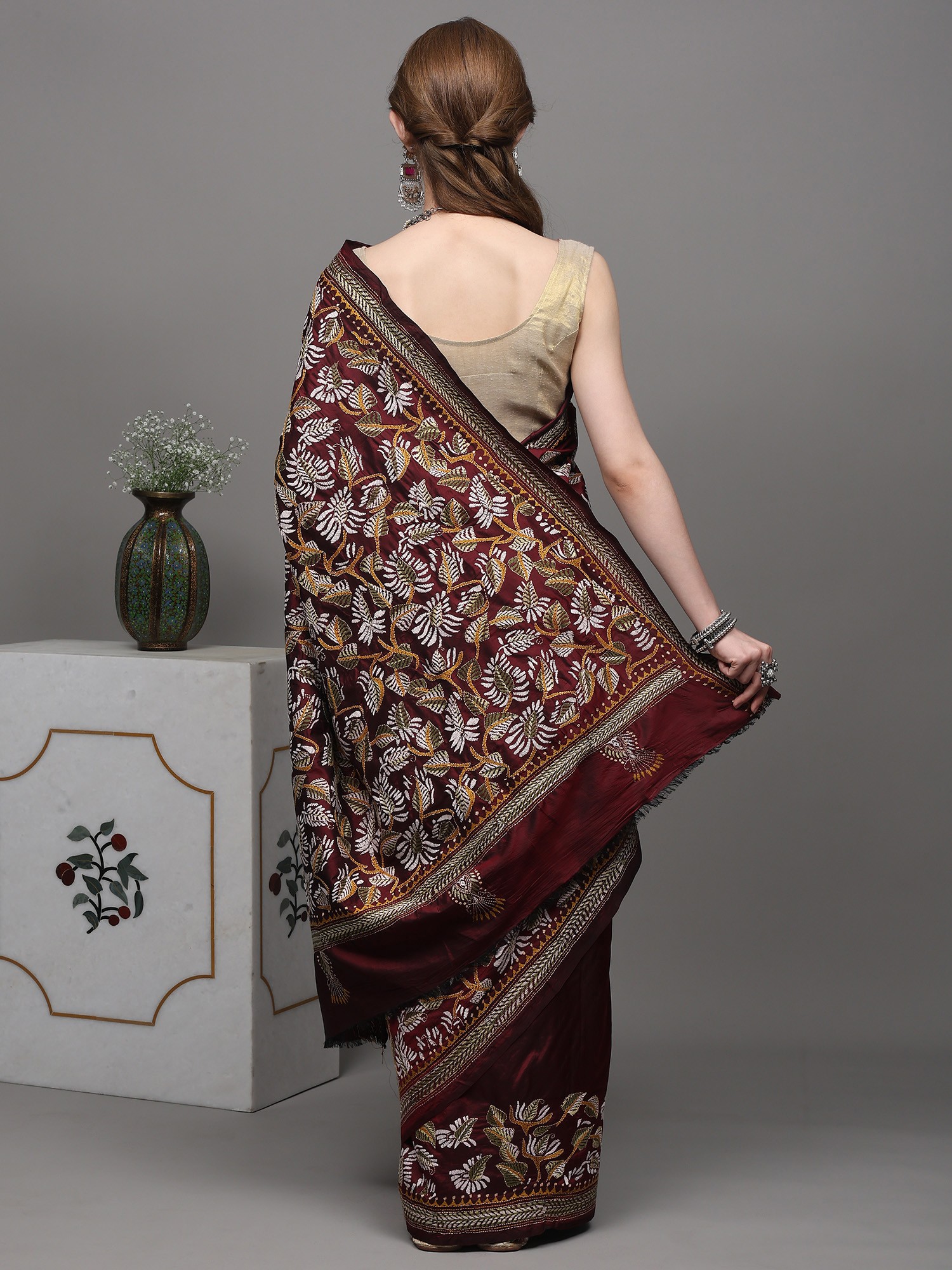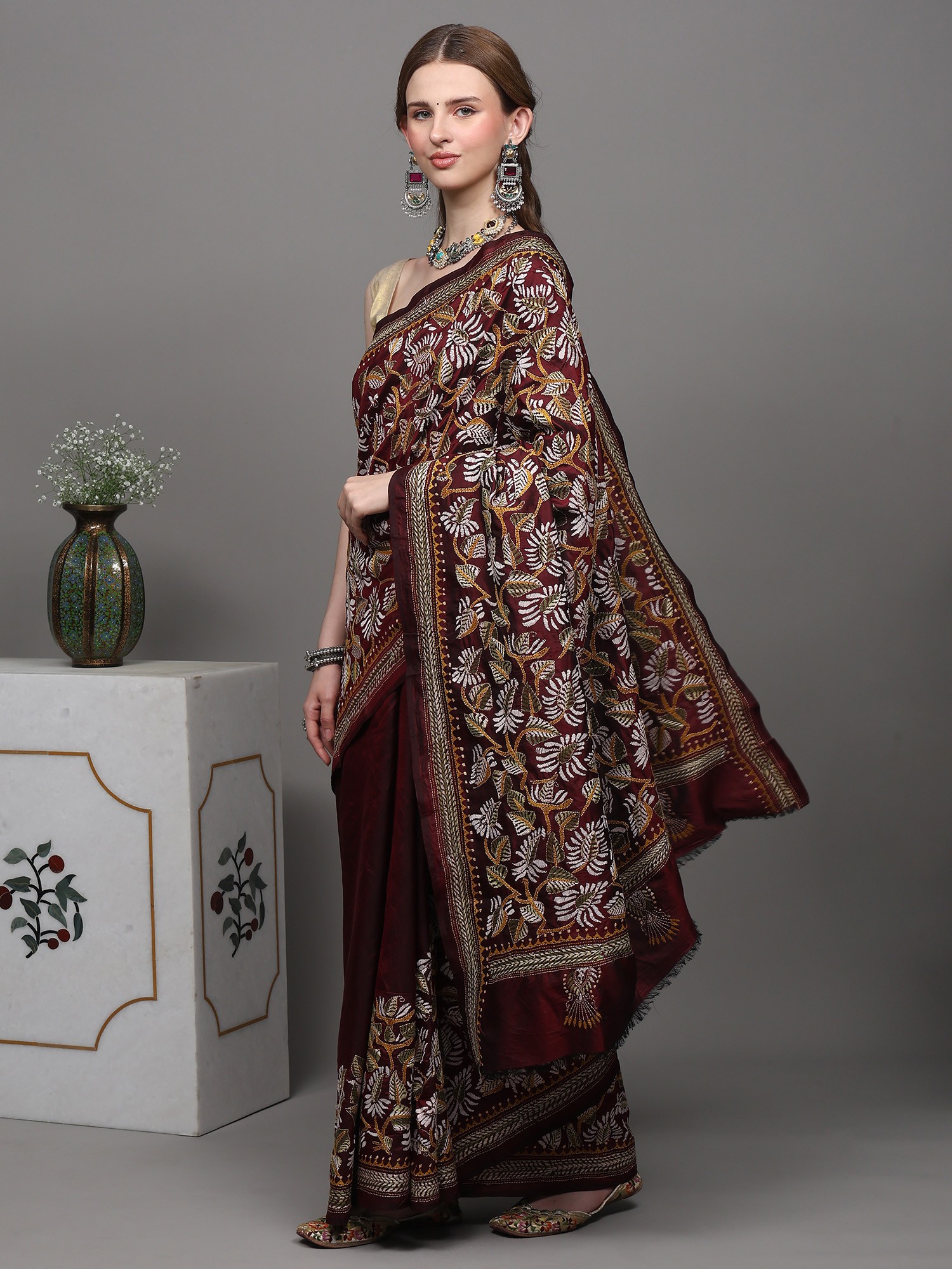 The deep, sumptuous color complements the delicate silk fabric, adding a regal touch to its drape. Each meticulously stitched motif tells a story, preserving the heritage of Kolkata's craftsmanship. This sari is a true celebration of artistry and tradition, making it a cherished addition to any wardrobe, perfect for special occasions and cultural festivities.