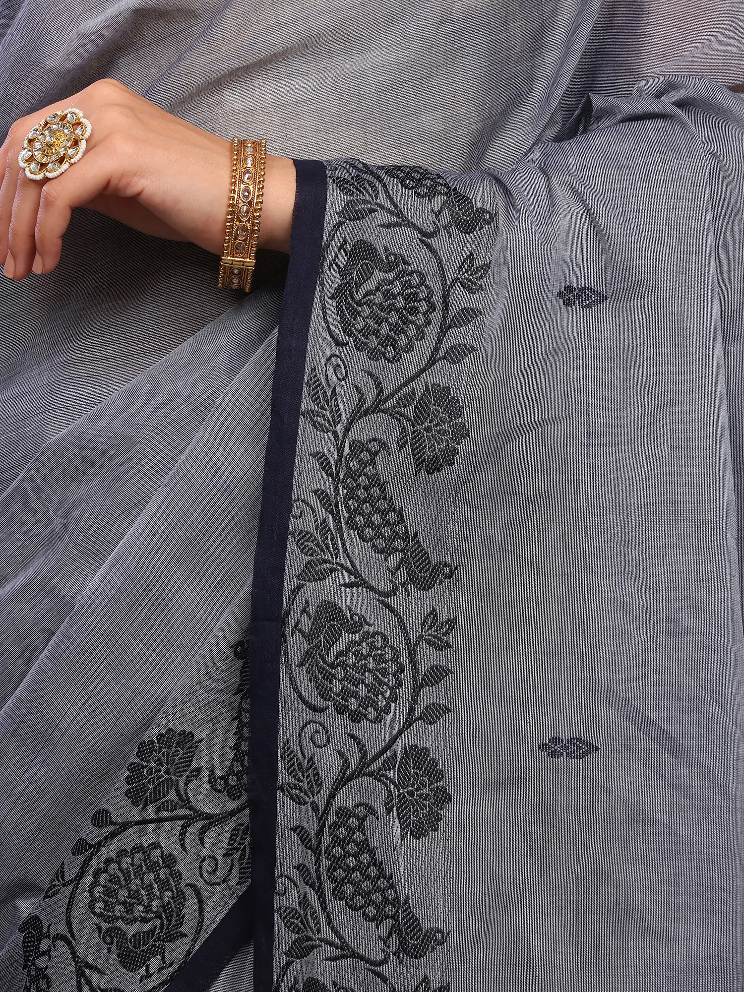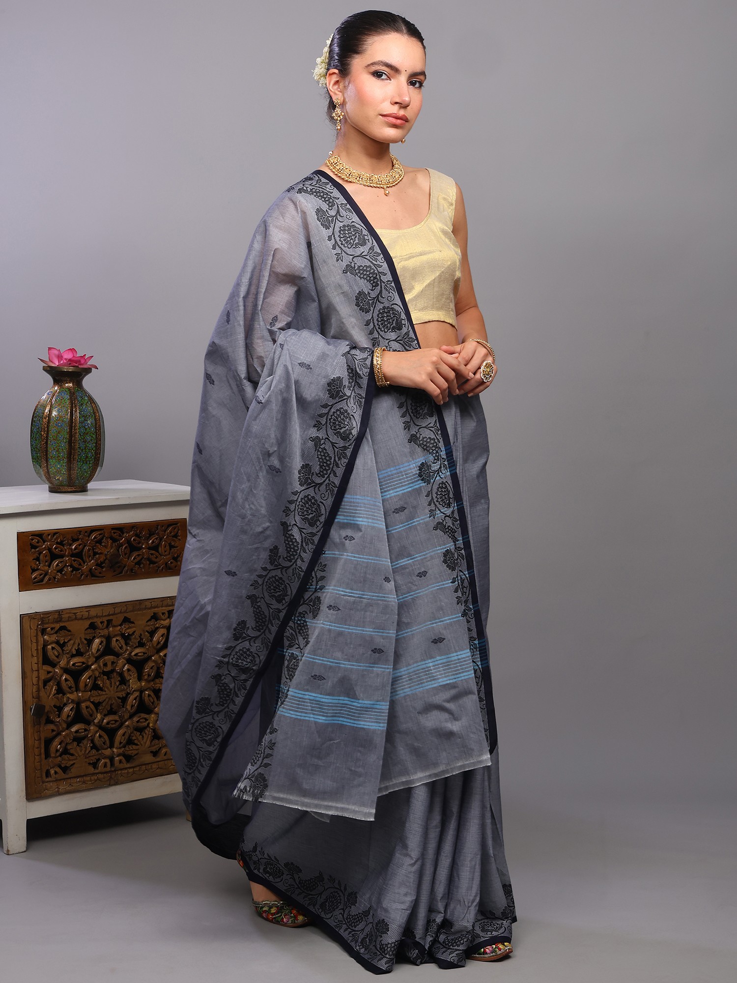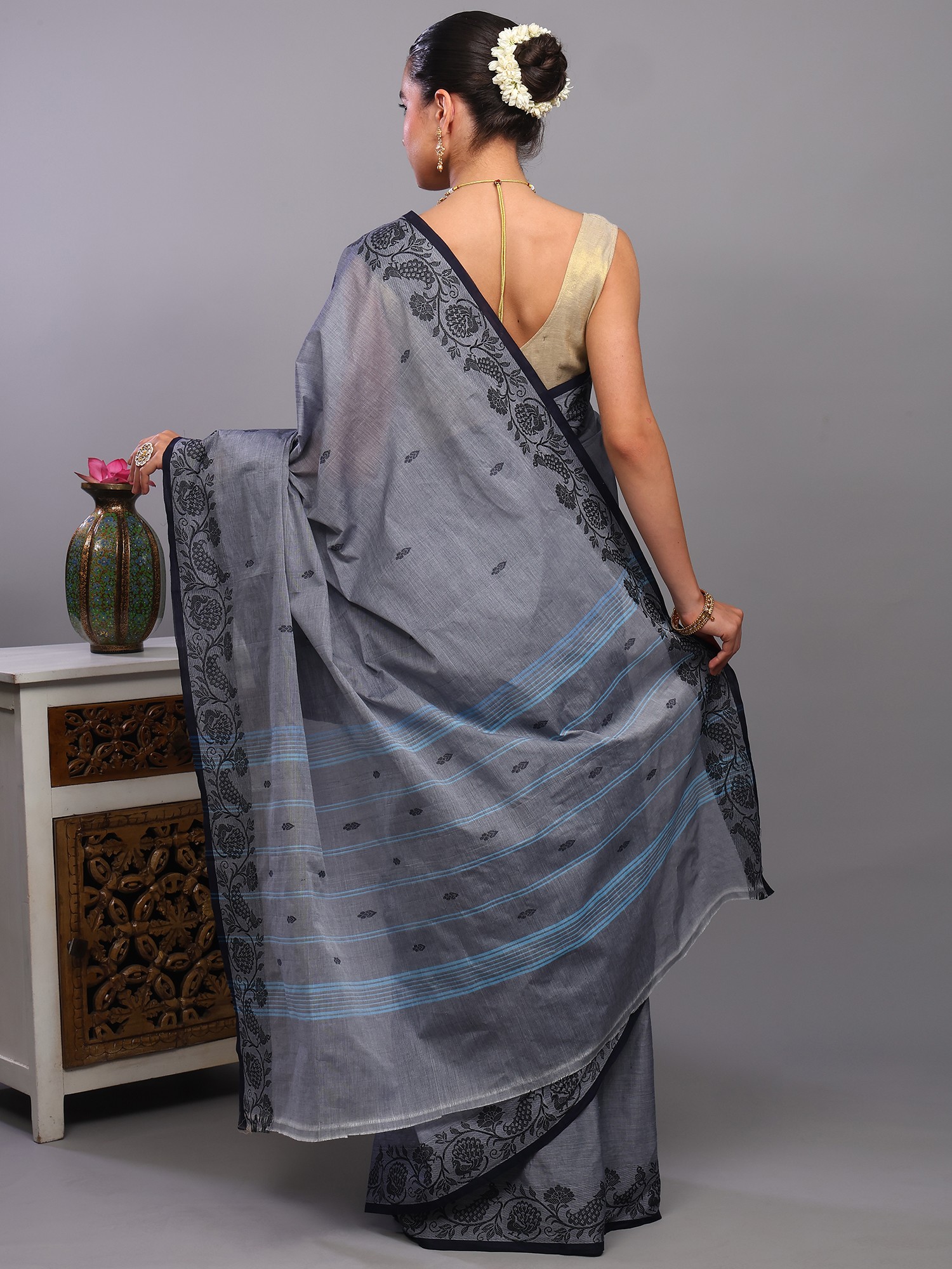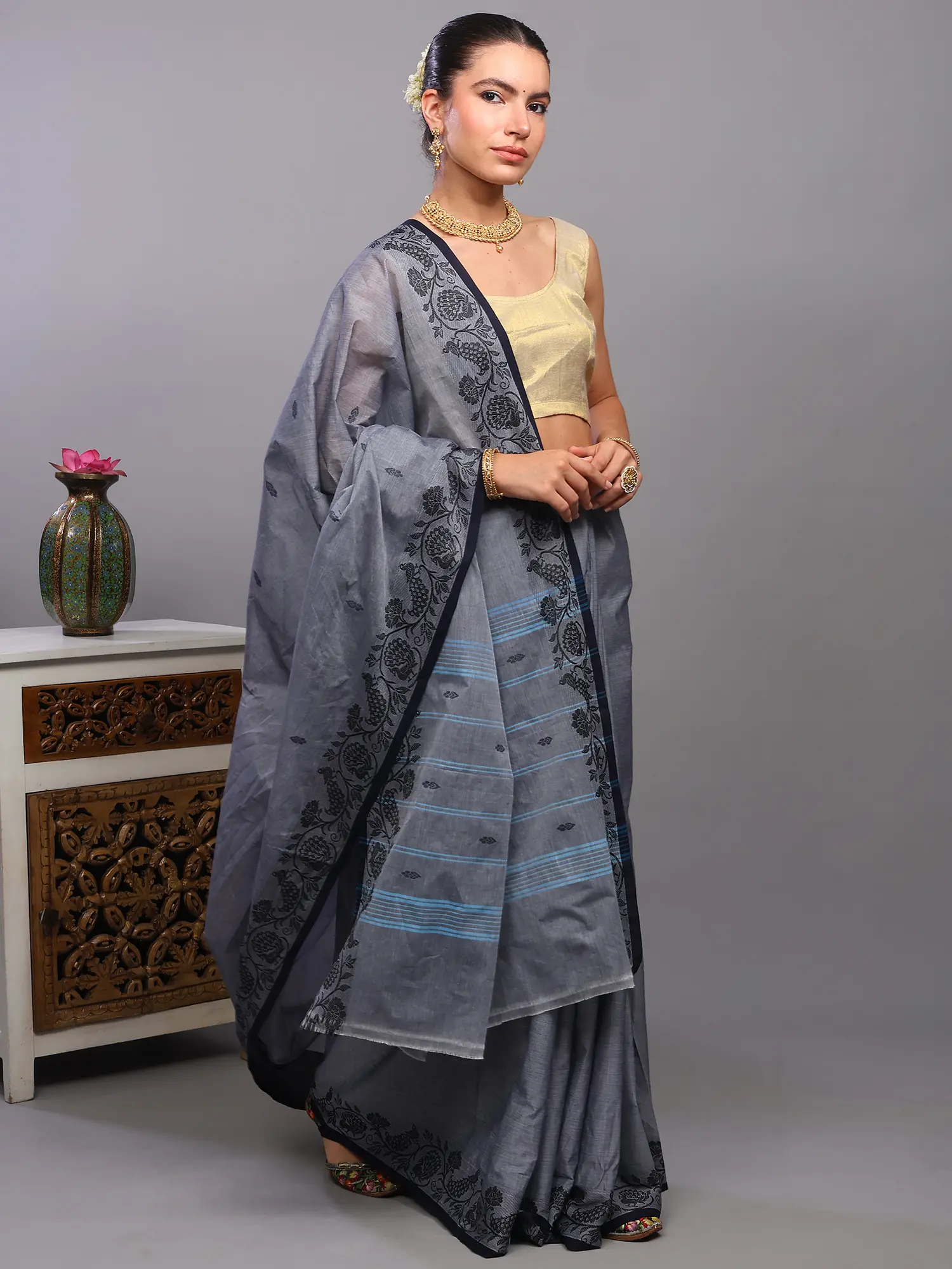 Moss-Gray Pure Silk Booti Motifs Saree with Zari Woven Contrast Border-Pallu from Kumbakonam