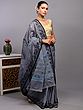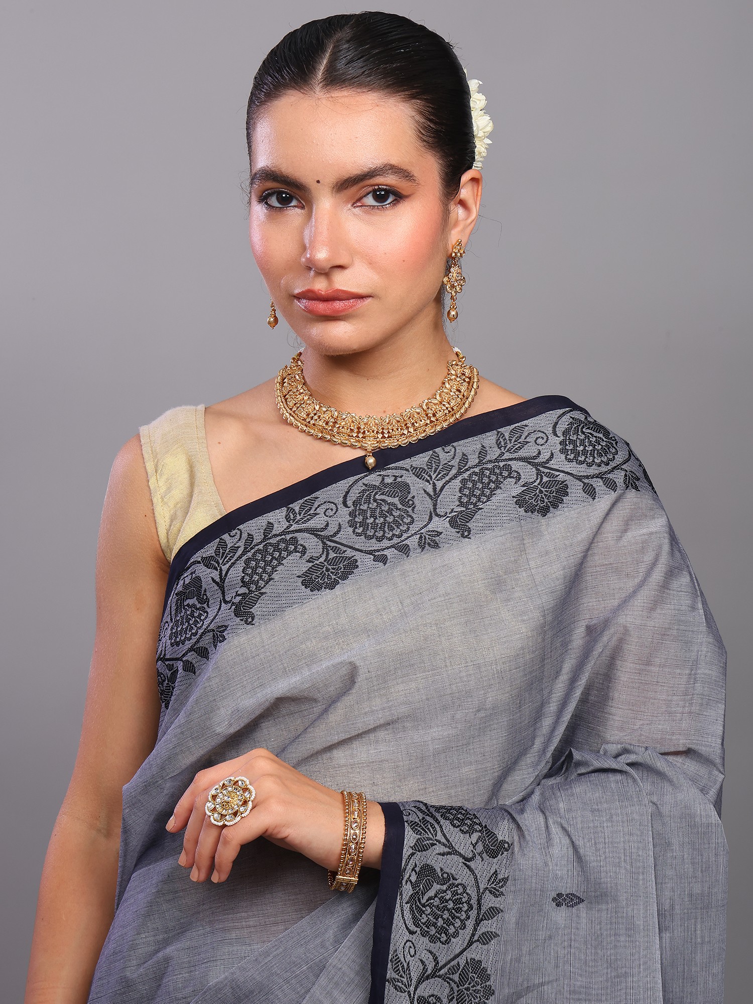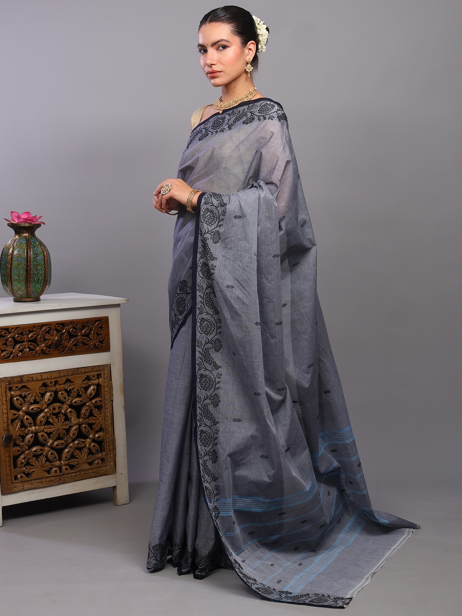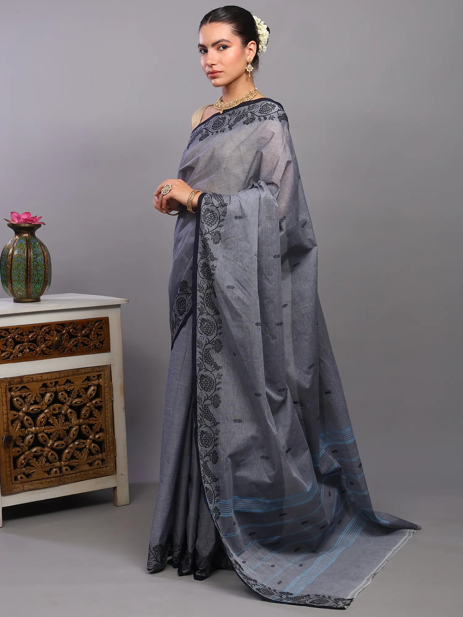 Moss-Gray Pure Silk Booti Motifs Saree with Zari Woven Contrast Border-Pallu from Kumbakonam