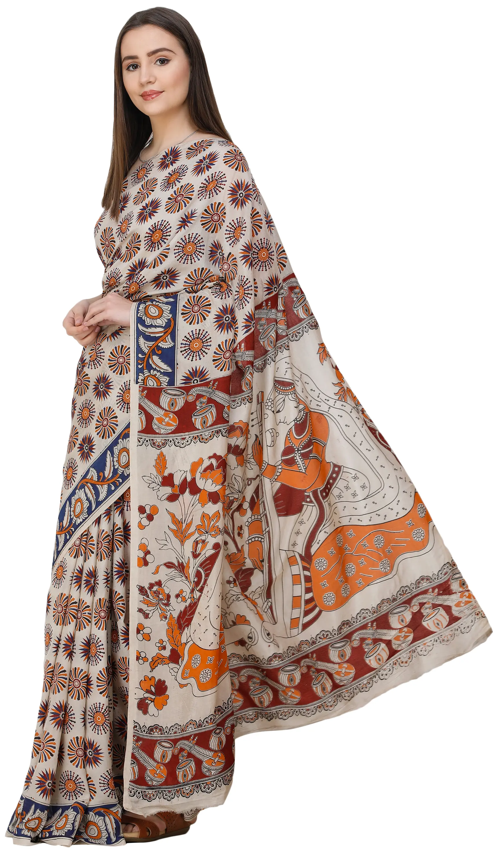 Multicolor Kalamkari Sari from Seemandhra with Painted Flowers and Woven Border