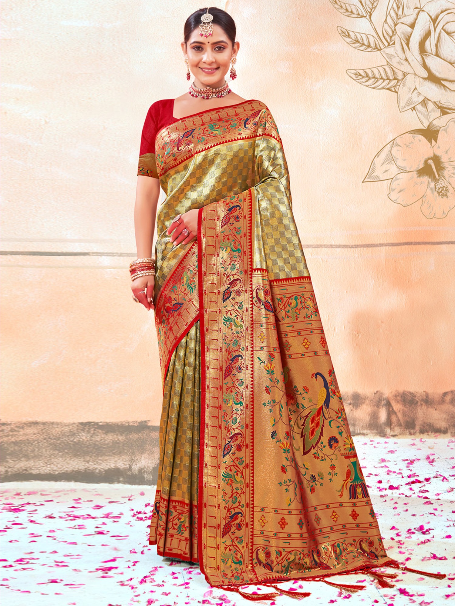Spring-Bud Zari Brocade Mor Pallu Paithani Silk Saree with Chattai Border