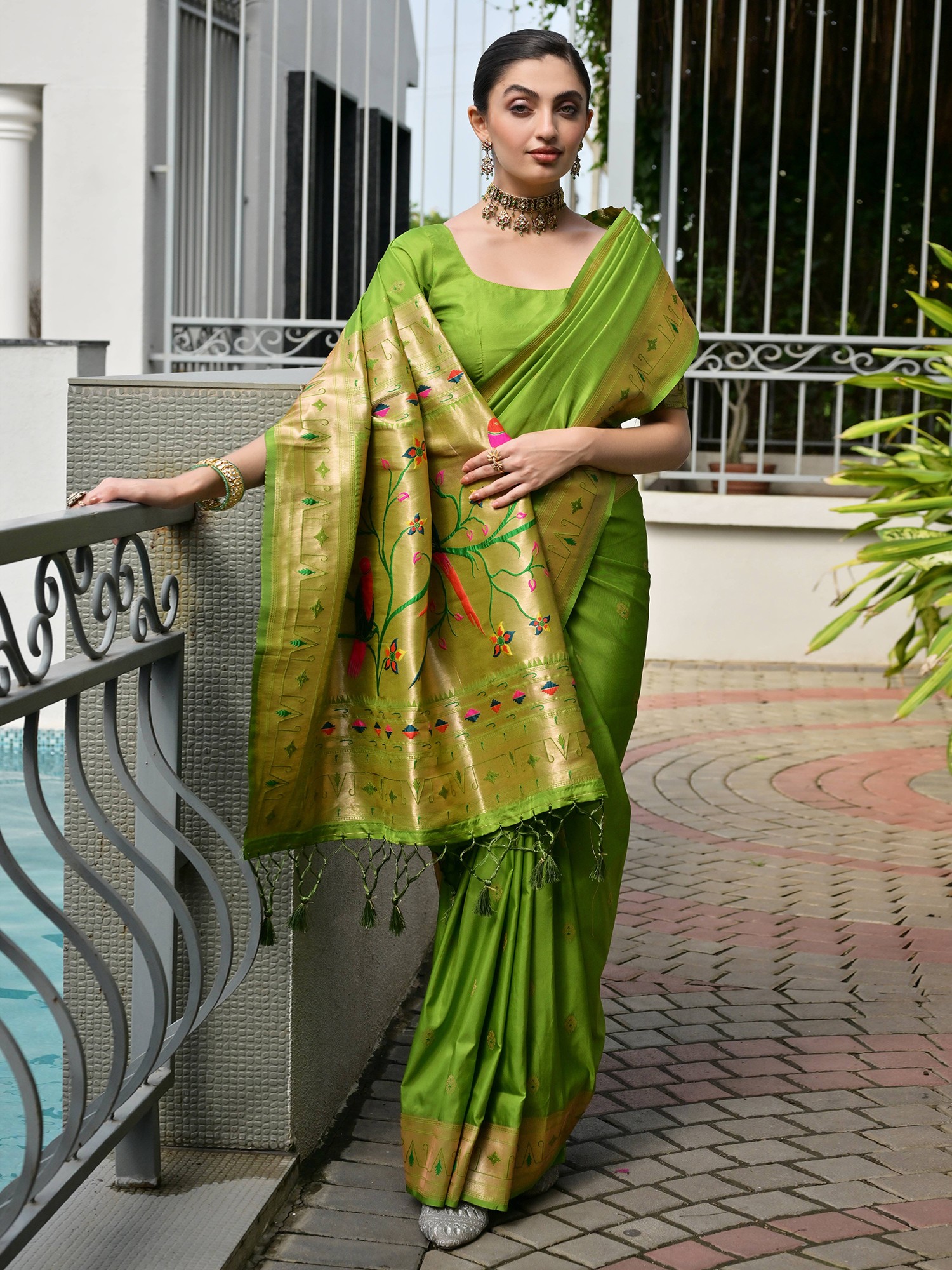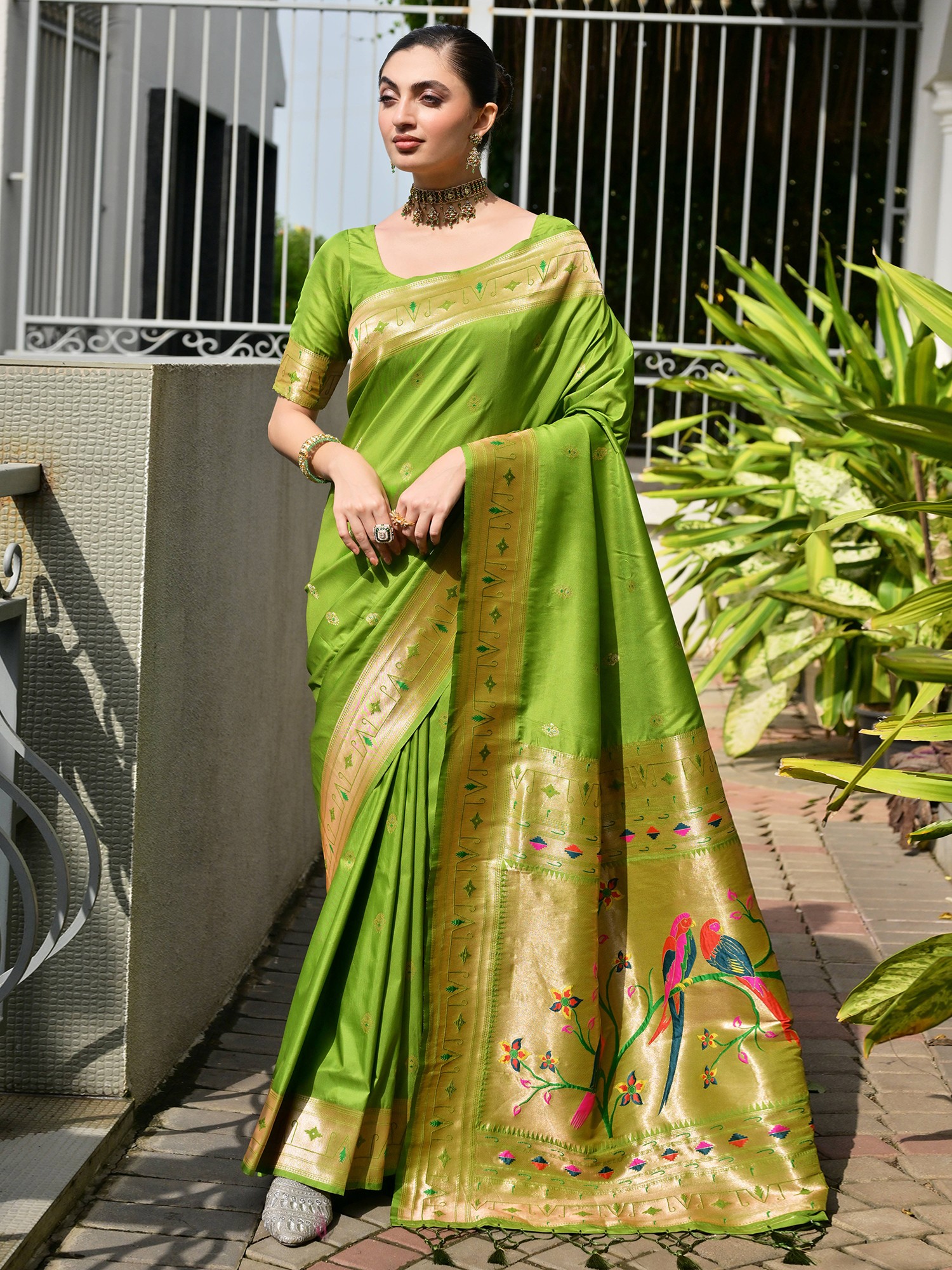 Drape yourself in the exquisite charm of this Paithani Silk Saree, a masterpiece that embodies the rich heritage of Indian craftsmanship. Crafted from the finest pure silk, this saree offers a luxurious feel and a lustrous sheen that is sure to turn heads. The vibrant lime green hue serves as a perfect canvas for the intricate Meenakari weaves, adding a touch of regal splendor to the garment.
