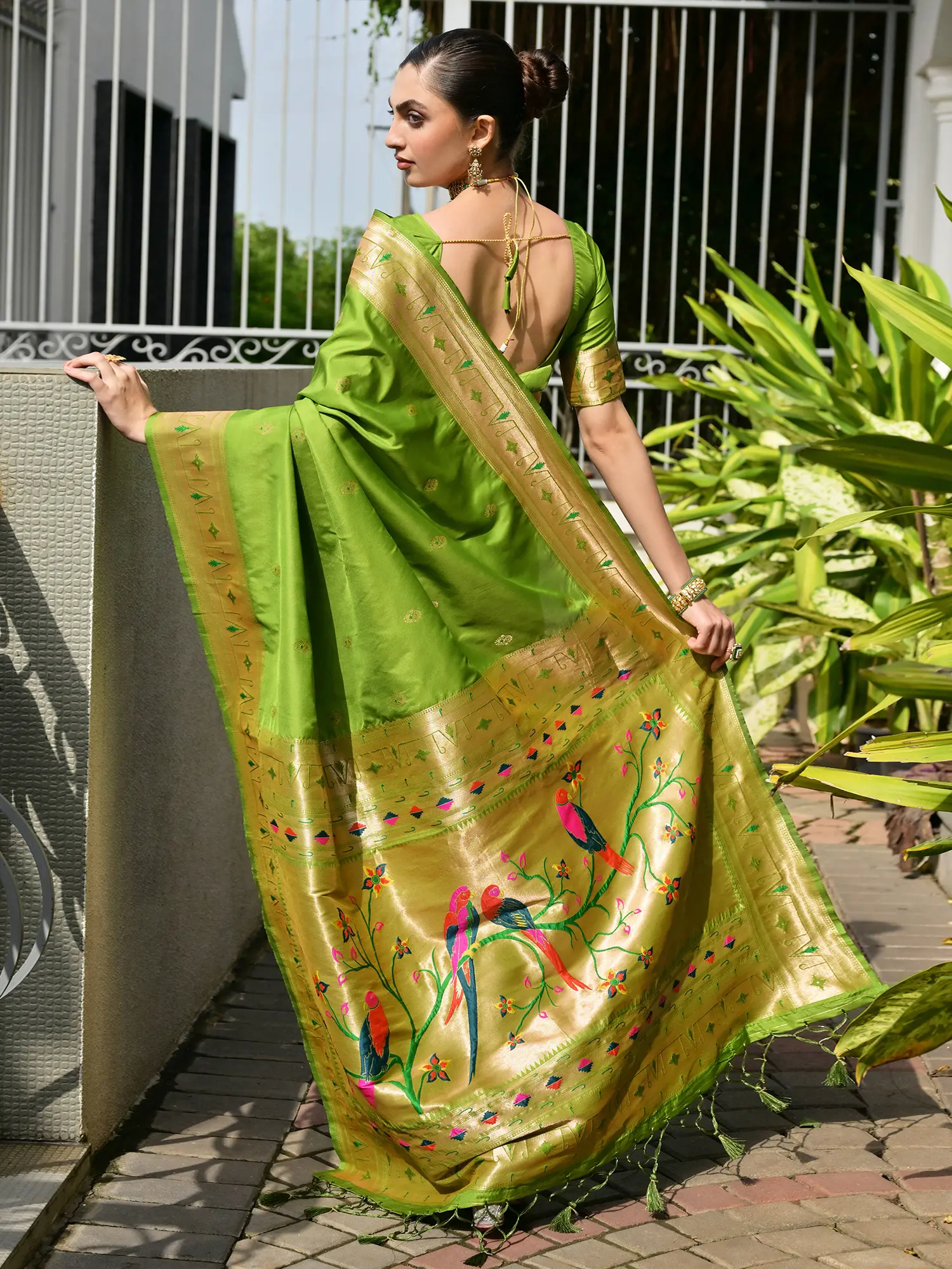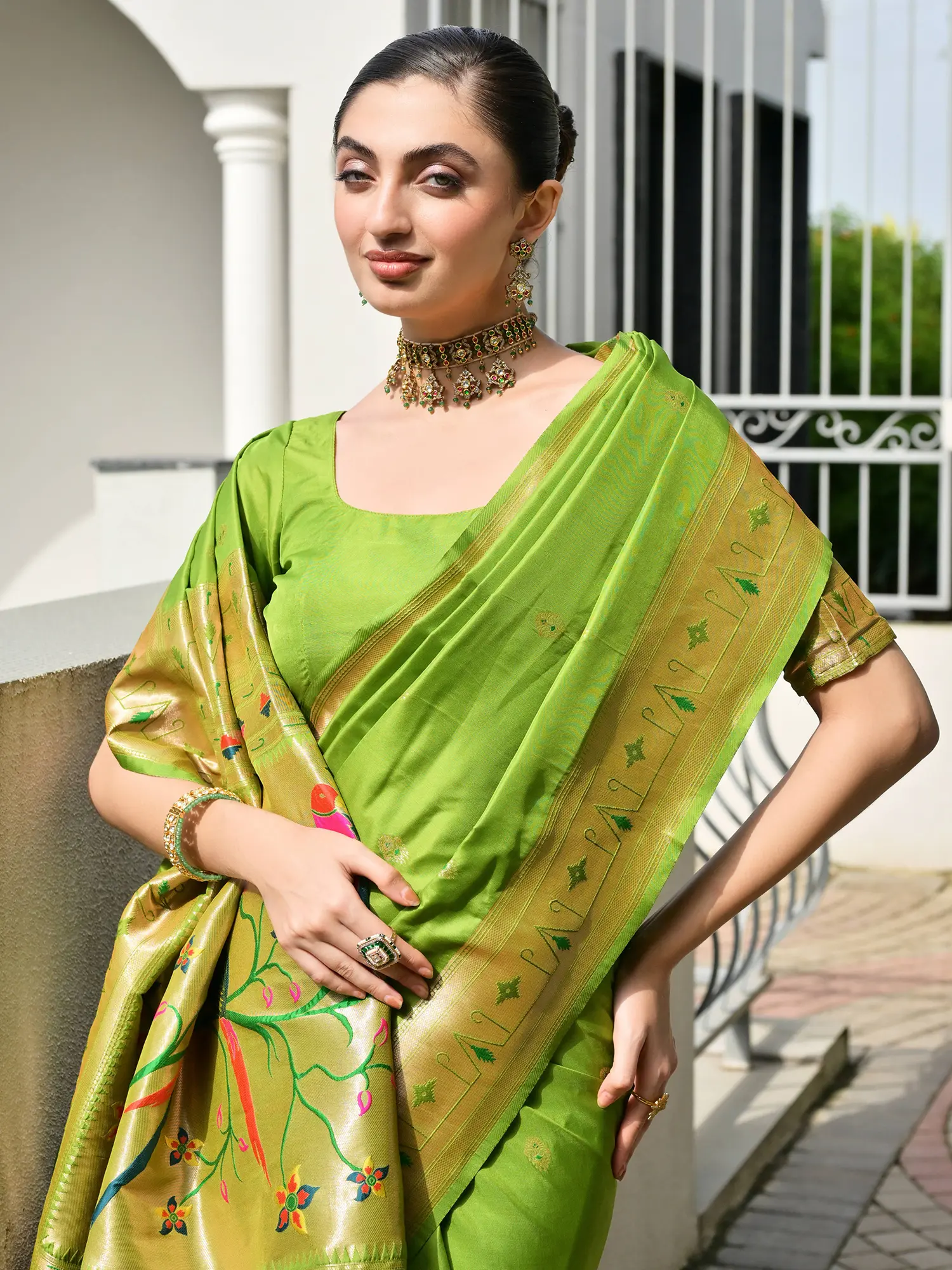 Drape yourself in the exquisite charm of this Paithani Silk Saree, a masterpiece that embodies the rich heritage of Indian craftsmanship. Crafted from the finest pure silk, this saree offers a luxurious feel and a lustrous sheen that is sure to turn heads. The vibrant lime green hue serves as a perfect canvas for the intricate Meenakari weaves, adding a touch of regal splendor to the garment.