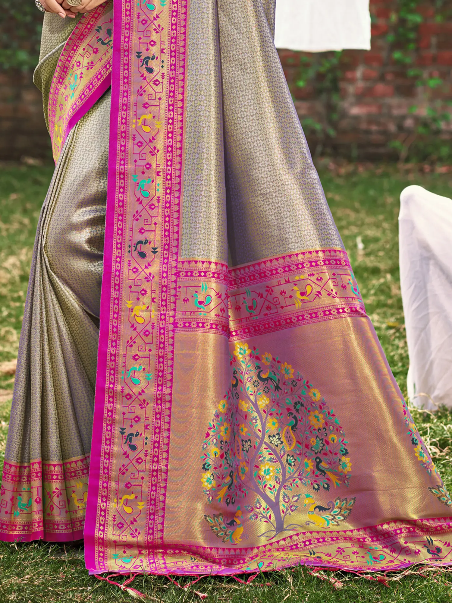 Indulge in the rich heritage and exquisite craftsmanship of this stunning Paithani silk saree. Drape yourself in the luxurious feel of authentic Paithani silk, known for its delicate weave and lustrous sheen. This saree is more than just clothing; it's a statement piece, a testament to timeless style and sophisticated grace. The subtle grey base provides a versatile canvas for the vibrant floral motifs that adorn the pallu, creating a captivating visual narrative. The intricate detailing and meticulous weaving technique showcase the skill and artistry that goes into each Paithani creation. This saree is perfect for weddings, festive occasions, or any event where you want to make a memorable impression.