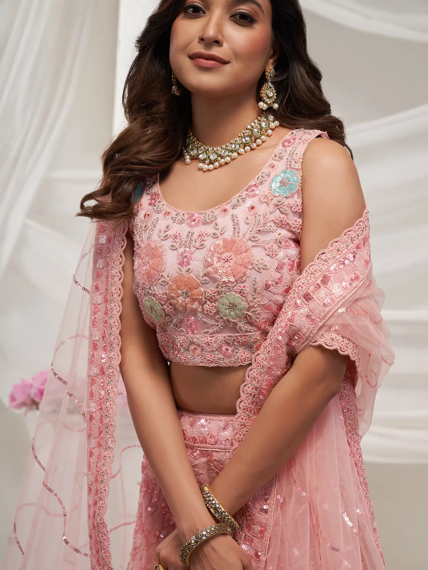 Floral Sequins And Embroidery Work Pure Cosmos Jacquard Elegant Lehenga Choli With Dupatta