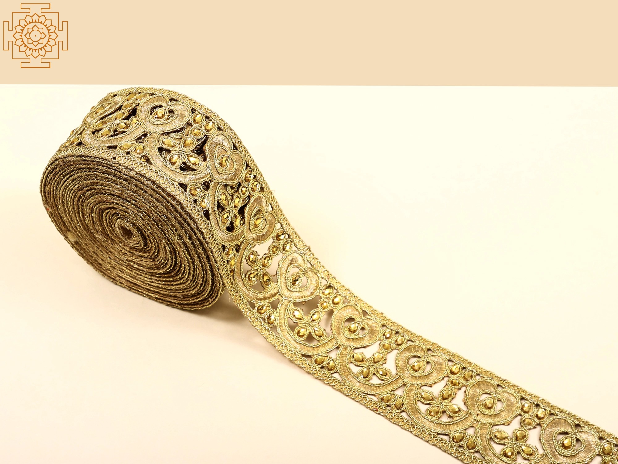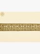 This pale gold zari and stone cut border is a masterwork of eternal beauty, transporting you to a realm of ethereal elegance. The magnificent pale gold zari and hypnotic stonework create a tale of grandeur and luxury in every detail. This elegant cambric border will enhance the look of any garment, from a classic saree to a modern cocktail dress, with an aura of royal majesty. This border represents culture and sophisticated taste, making it the perfect accent for cultural festivals, weddings, and parties.