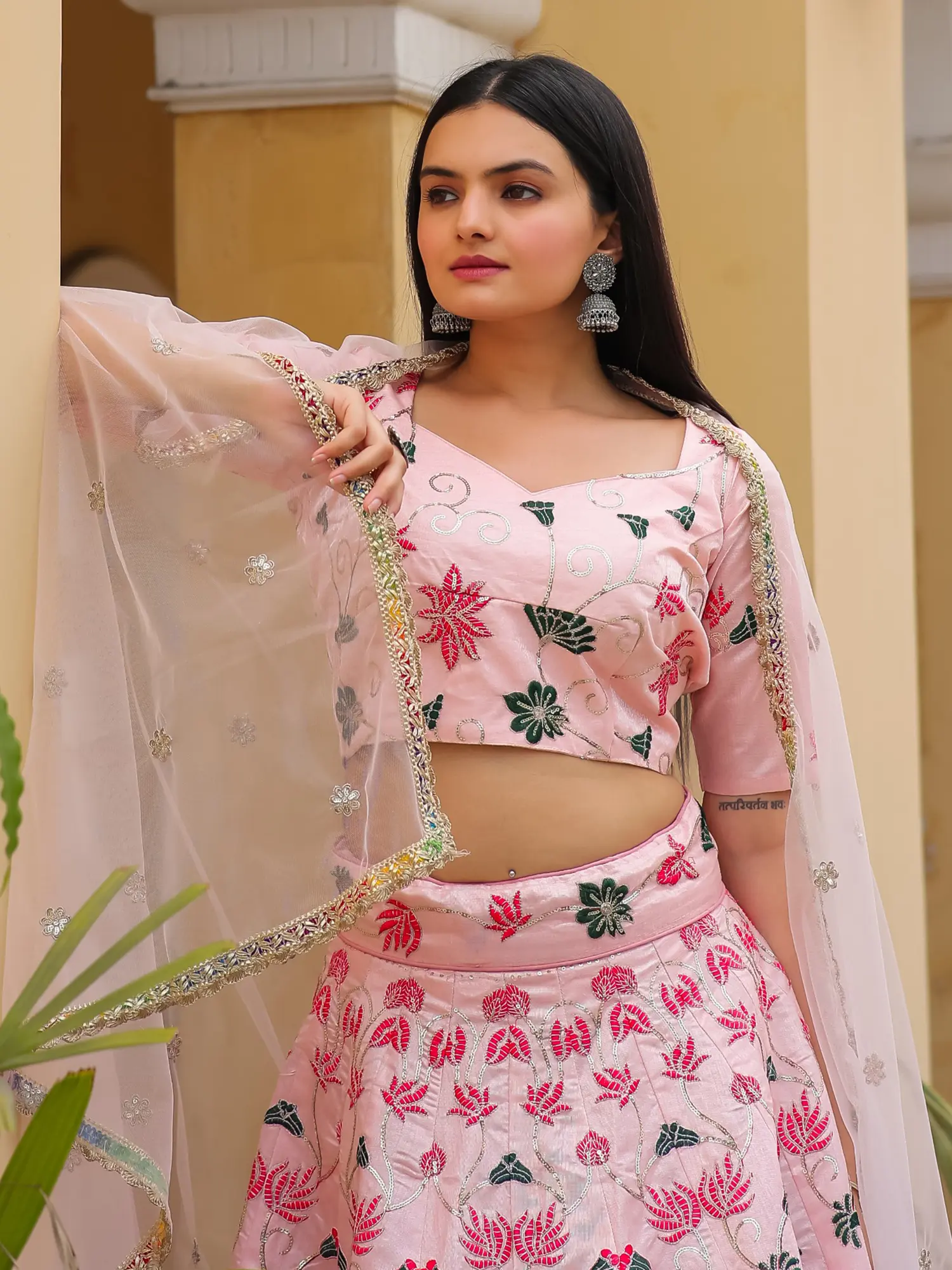 Stunning Tropical Floral Print And Sequins Work Art Silk Lehenga Choli With Dupatta