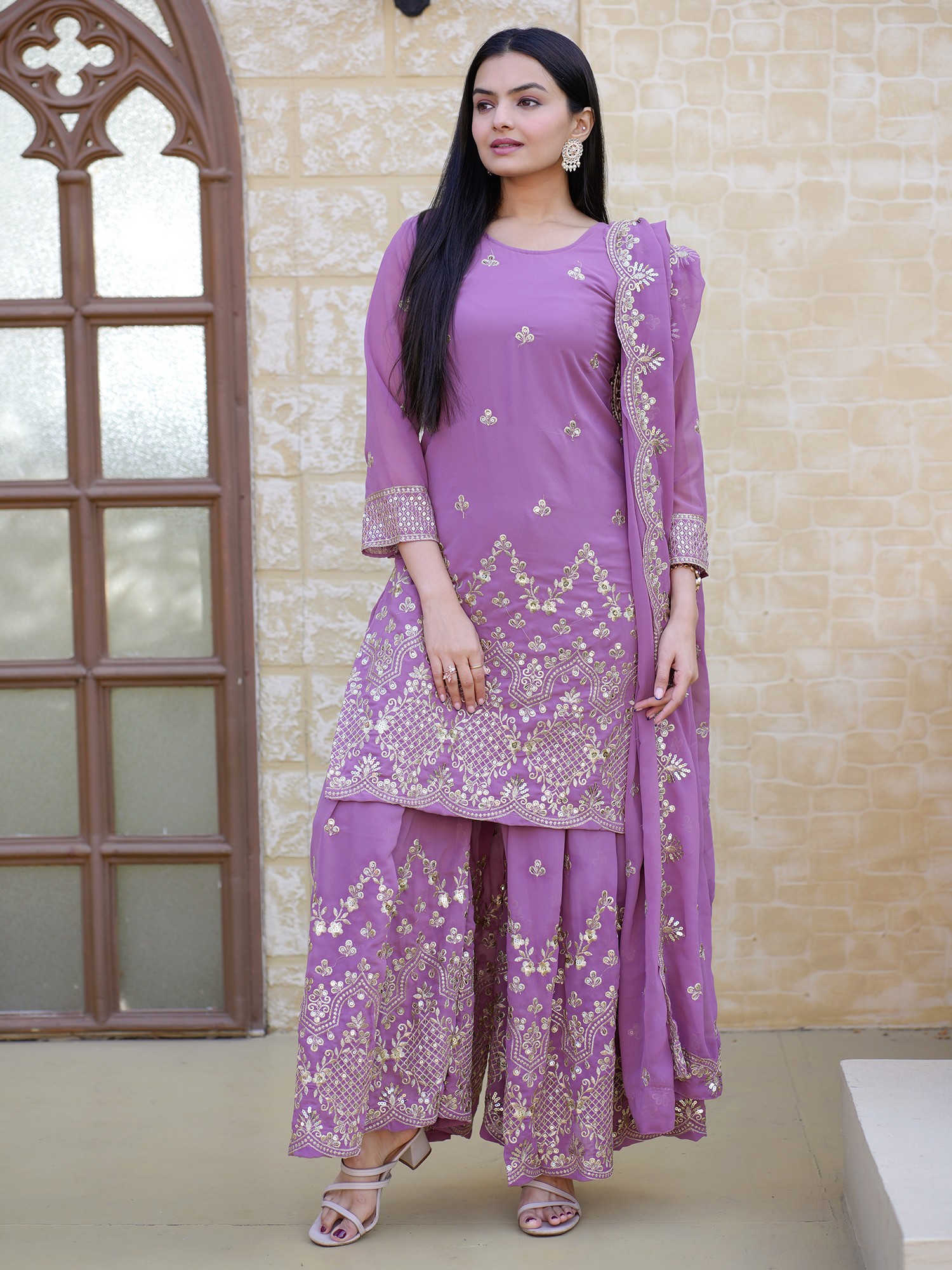Step into a world of refined style and captivating charm with this stunning pale-purple kurti and palazzo set. Crafted from lightweight faux georgette, this ensemble drapes beautifully, offering both comfort and a graceful silhouette. The soft, ethereal hue of pale purple is reminiscent of twilight skies and delicate blossoms, making it a perfect choice for any celebratory occasion.