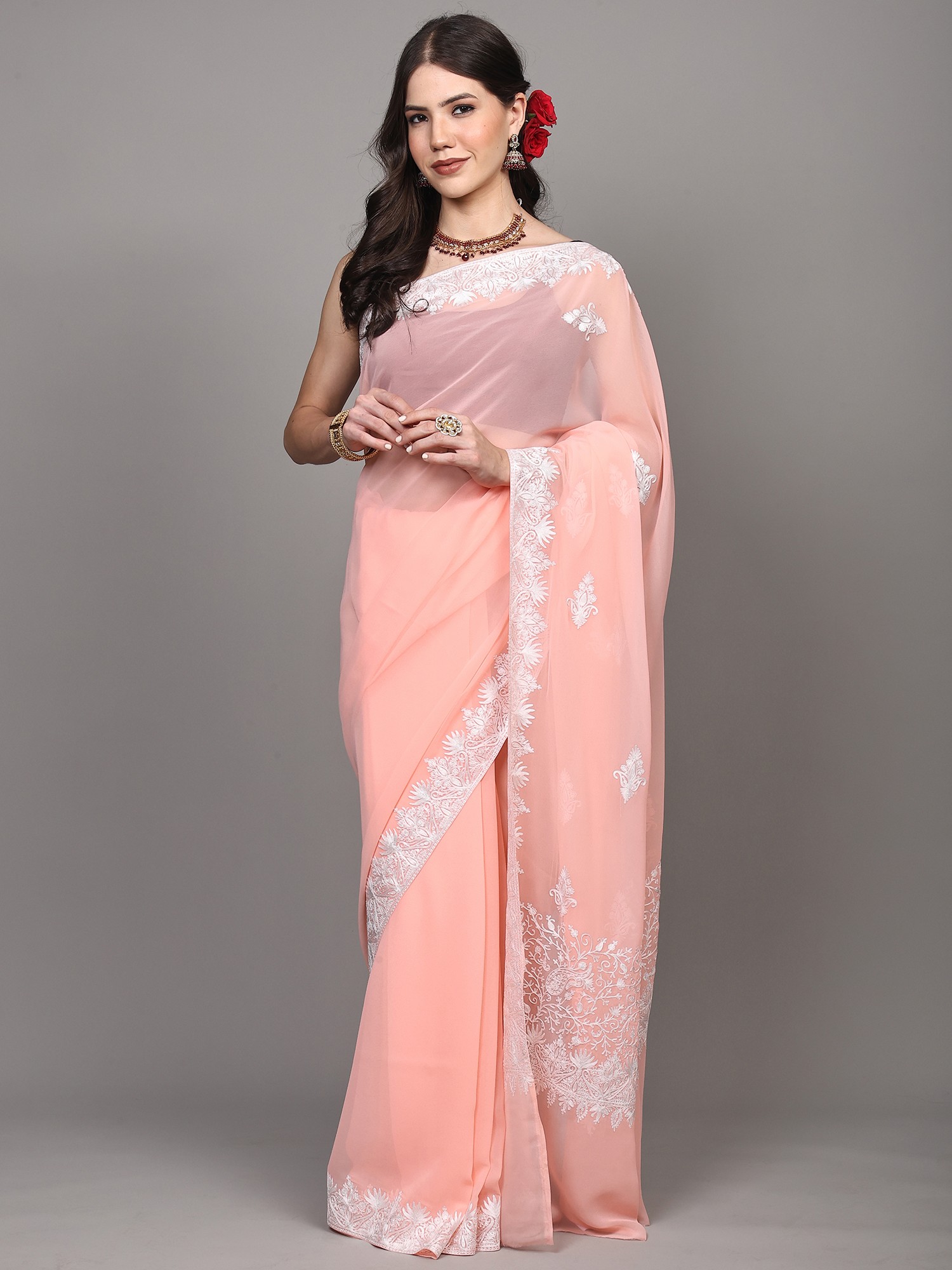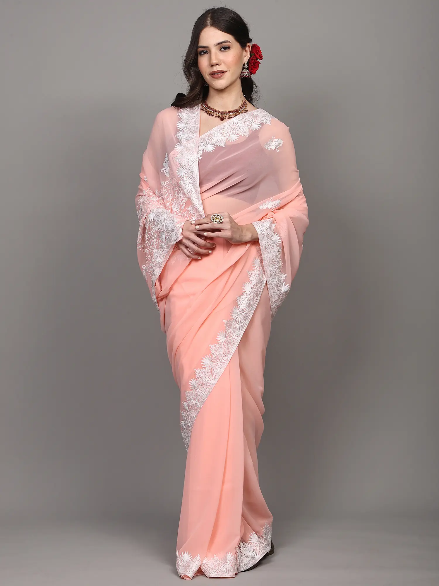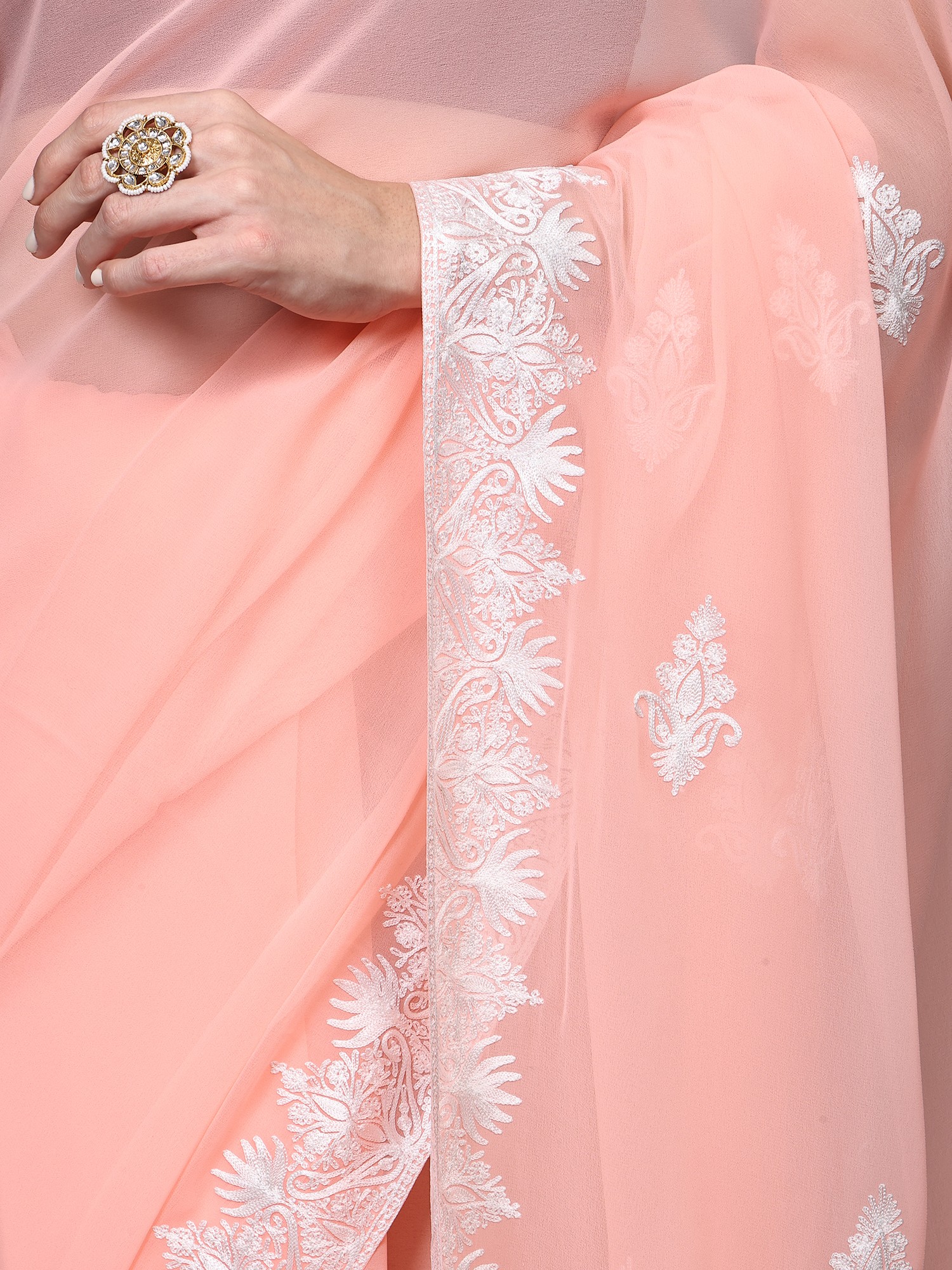 The true beauty of this saree lies in its exquisite Aari embroidery. Originating from the picturesque valleys of Kashmir, the Aari technique is renowned for its intricate detailing and the delicate touch of the artisan's hand. The border and pallu of this georgette saree are adorned with mesmerising paisley motifs, meticulously hand-embroidered in a contrasting white thread. These paisley patterns, a timeless symbol of good fortune and prosperity, are rendered with such precision that they appear to bloom against the soft, peachy backdrop. The embroidery extends with captivating detail along the entire length of the border and culminates in a resplendent display on the pallu, creating a breathtaking visual impact.