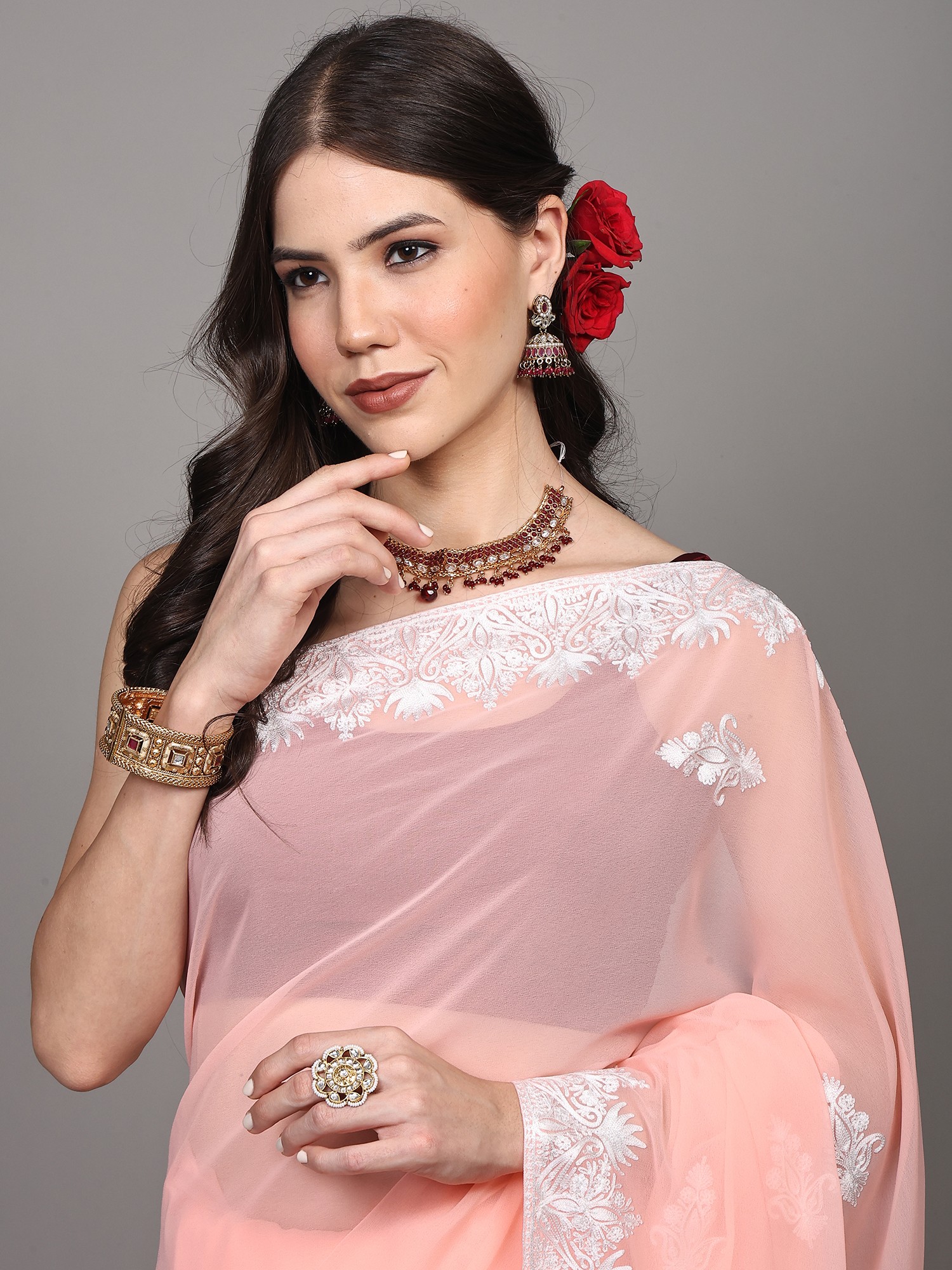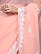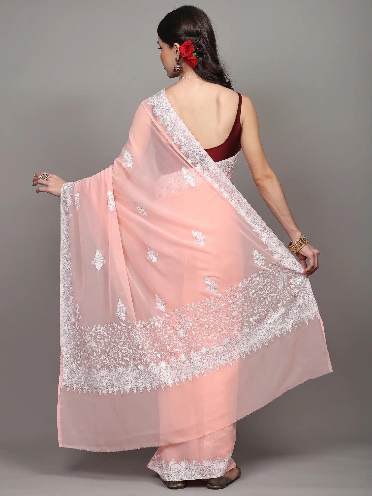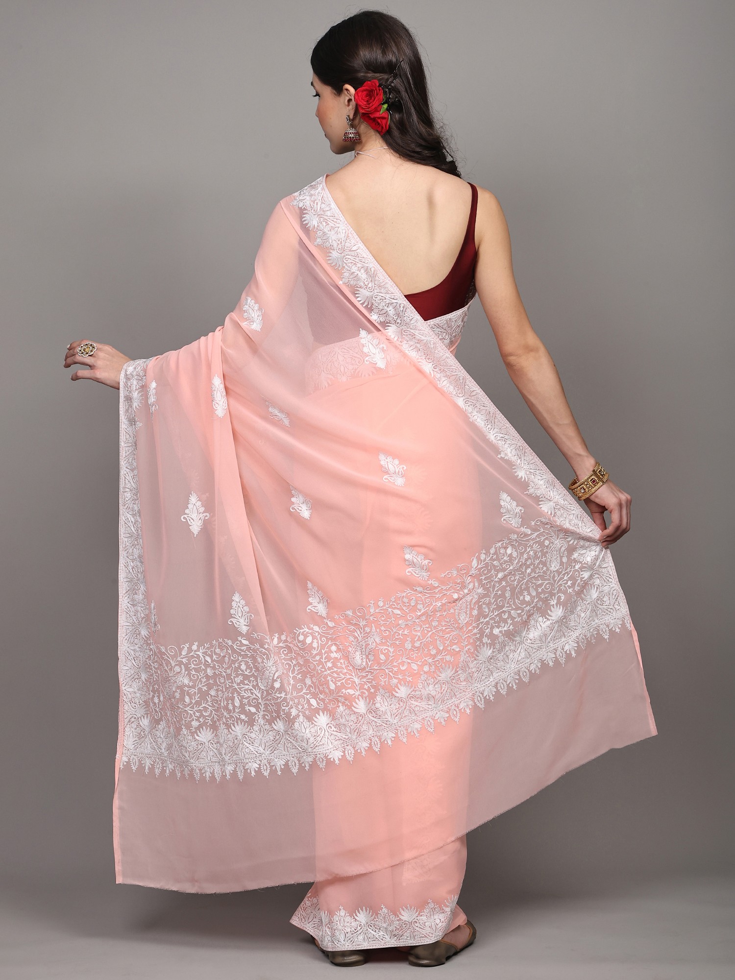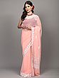 Pale-Rosette Georgette Saree with Paisleys Aari Embroidery on Border and Pallu from Kashmir