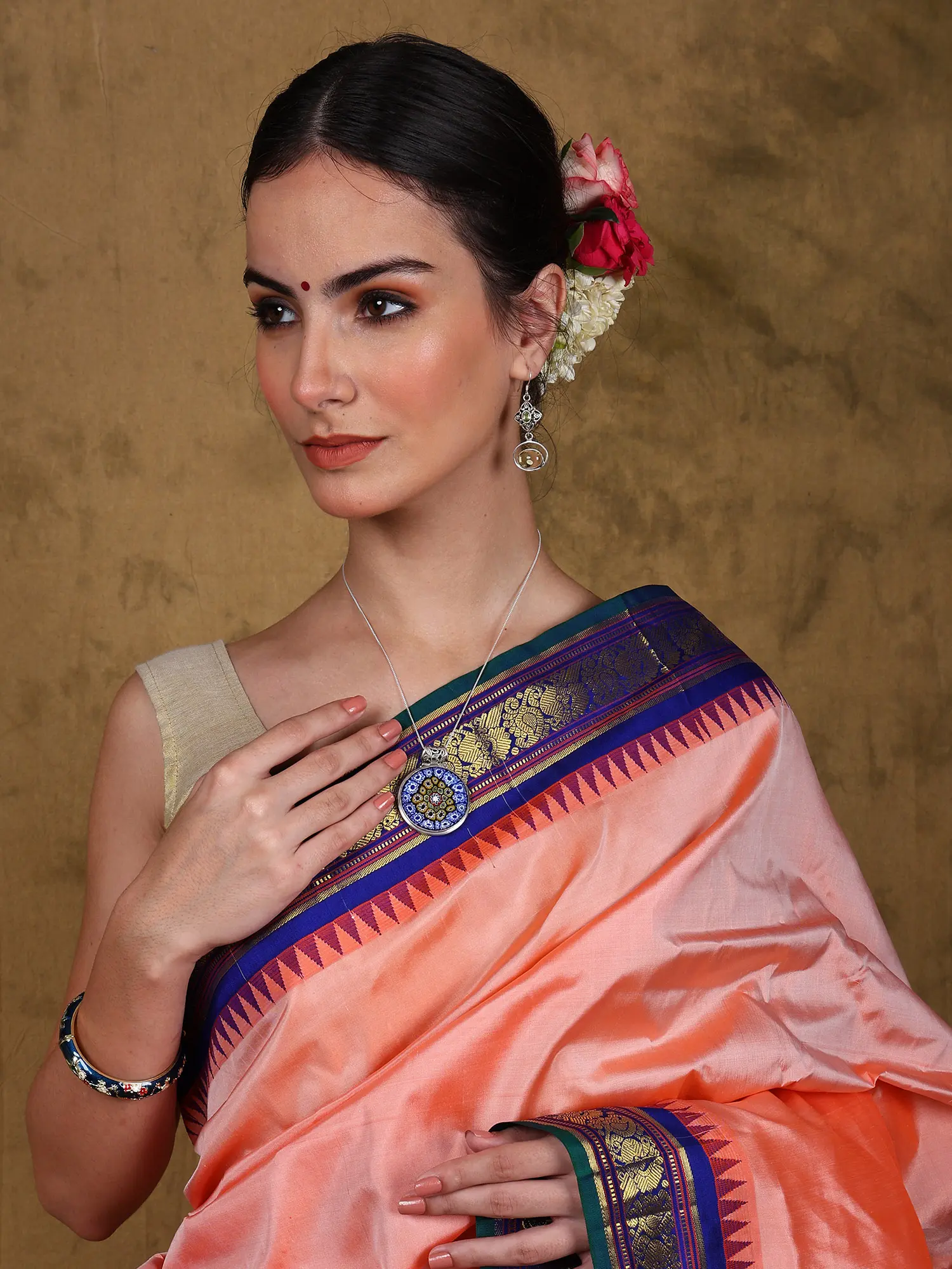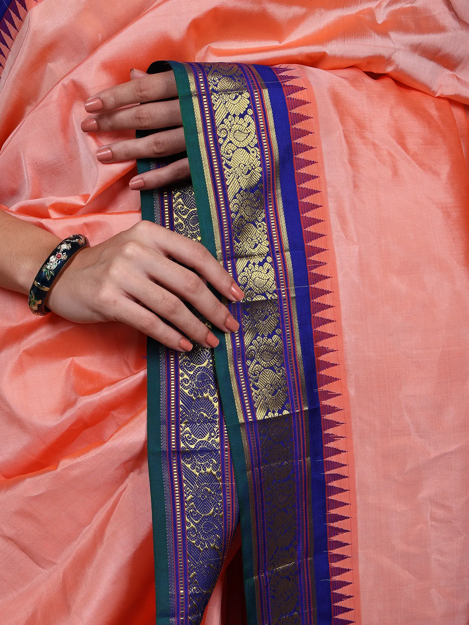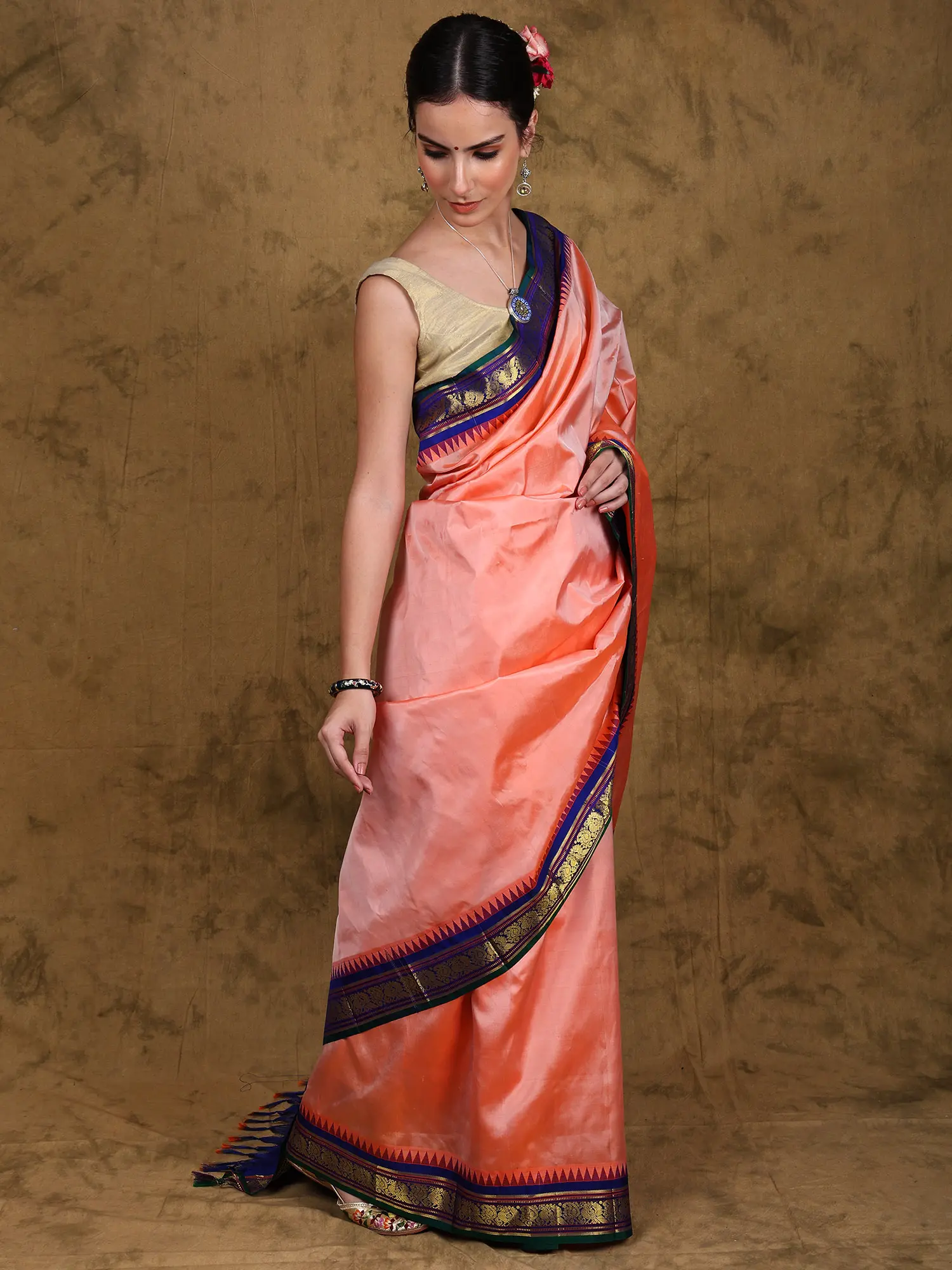 Papaya-Punch Pure Silk Saree with Double Side Temple Border and Zari Woven Peacock Contrast Pallu from Kumbakonam