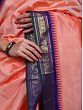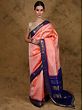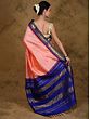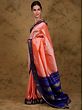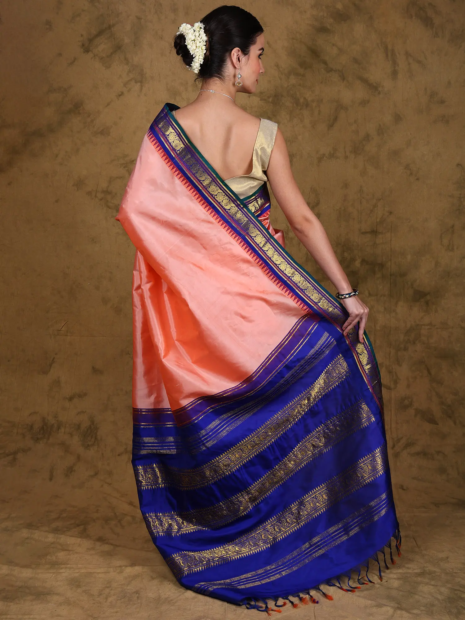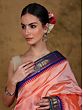 This saree is a testament to intricate detailing and vibrant color combinations. The double-sided temple border adds a touch of traditional charm, showcasing the artistry of skilled weavers. The border's deep blue and gold accents beautifully contrast with the delicate papaya shade of the main body. This intricate border work is not only visually stunning, but it also speaks to the quality and heritage of the saree.