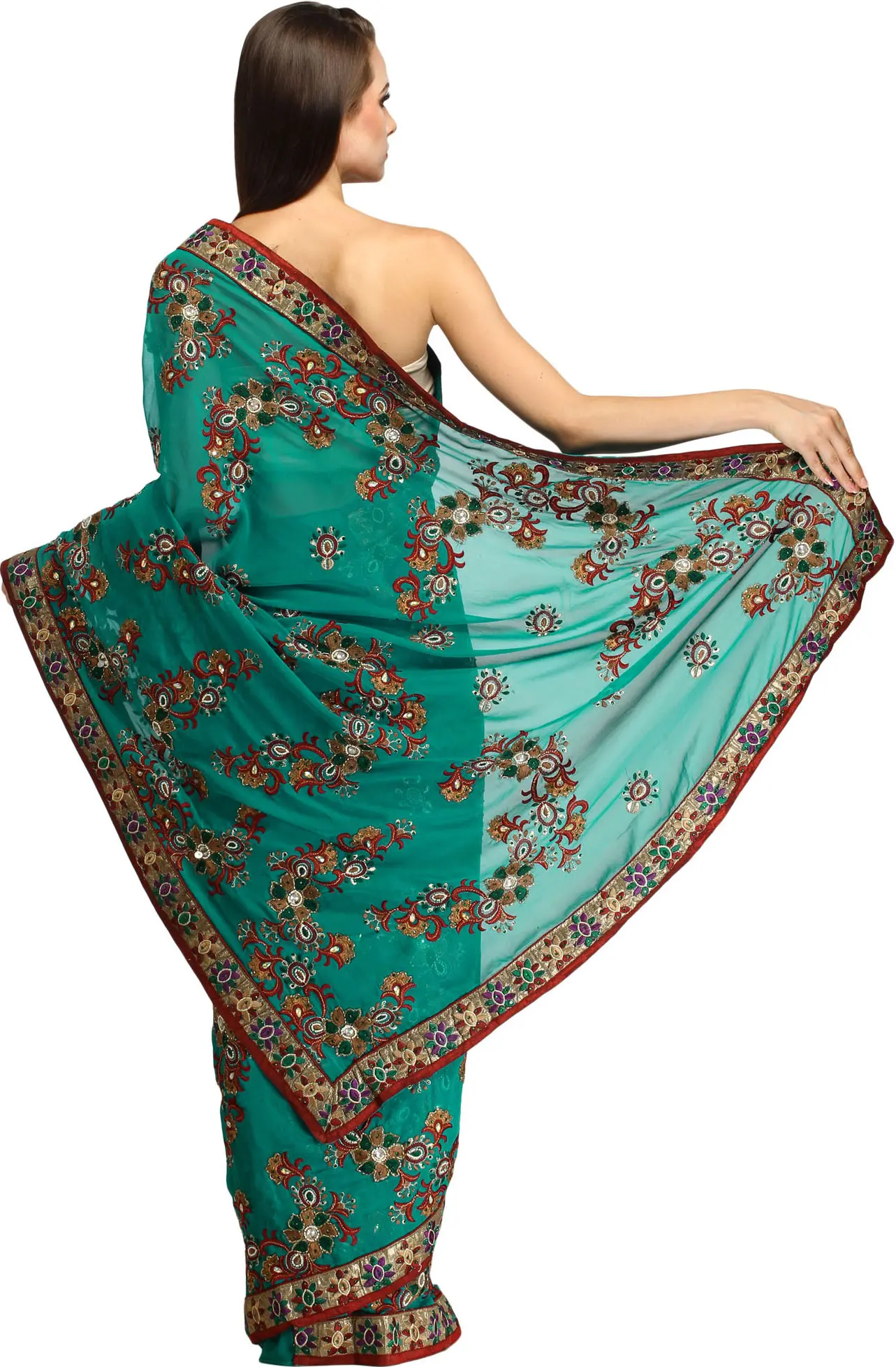 Step into a world of refined beauty and captivating style with this exquisite georgette saree. The vibrant parasailing green hue serves as a canvas for a mesmerizing display of intricate floral embroidery and delicate beadwork. Each motif is meticulously crafted, creating a symphony of color and texture that adorns the sheer georgette fabric. This saree is a testament to traditional craftsmanship fused with contemporary design, making it a perfect choice for any special occasion where you want to make a lasting impression.