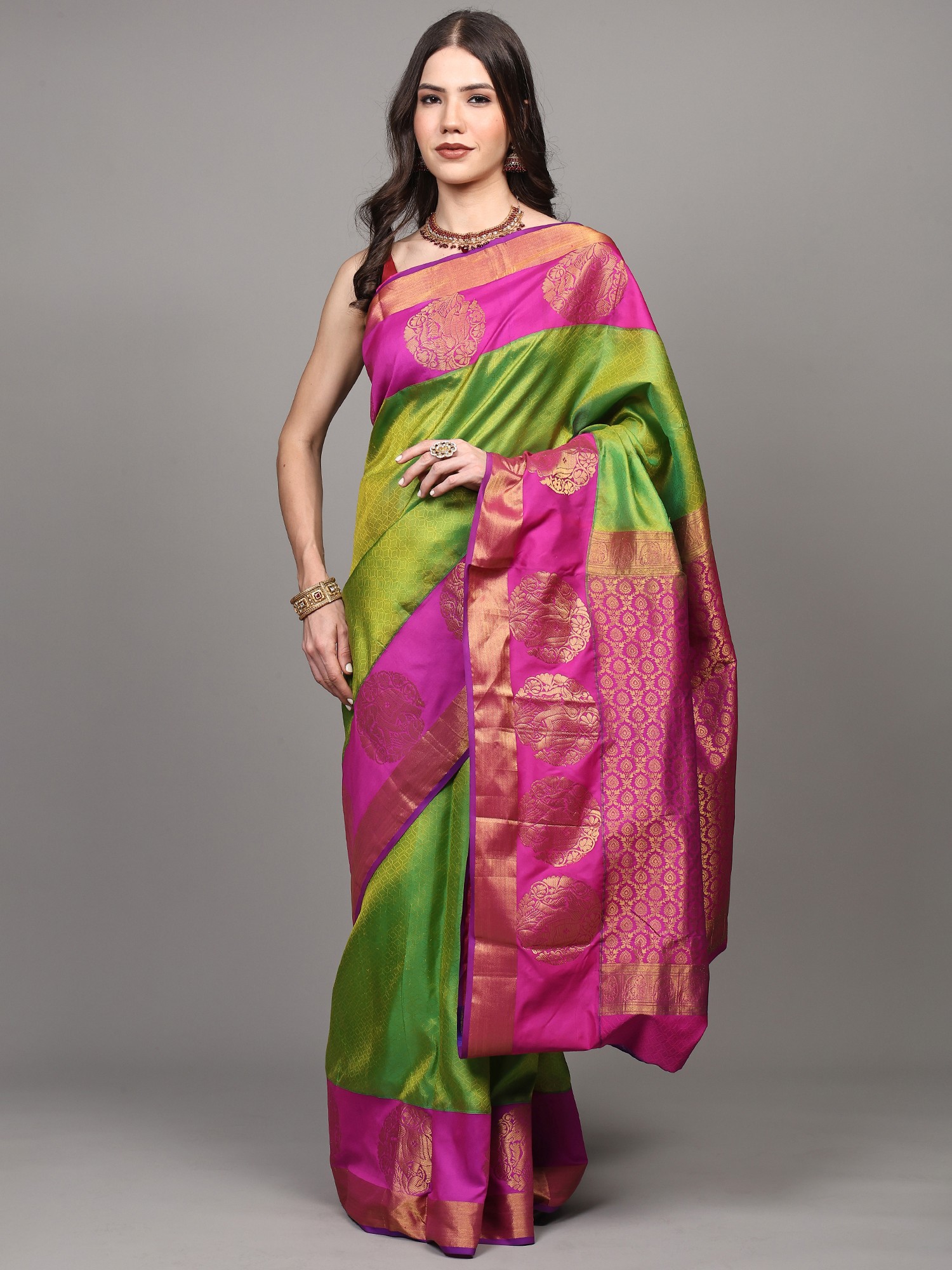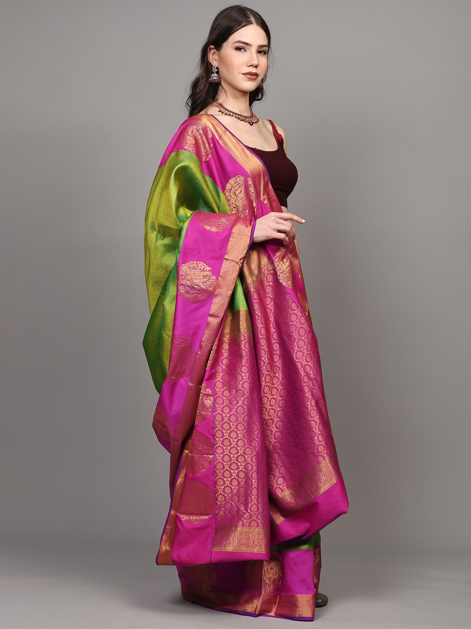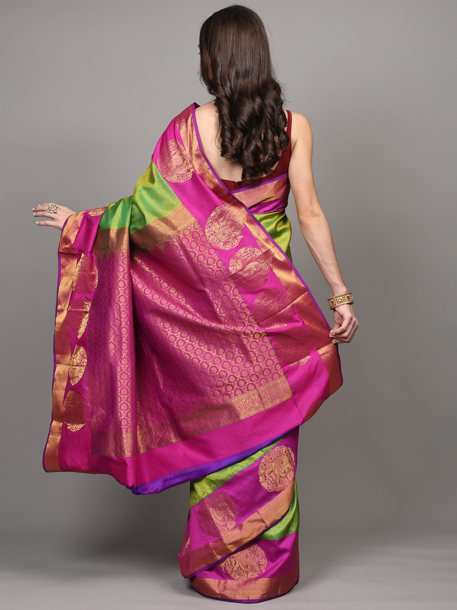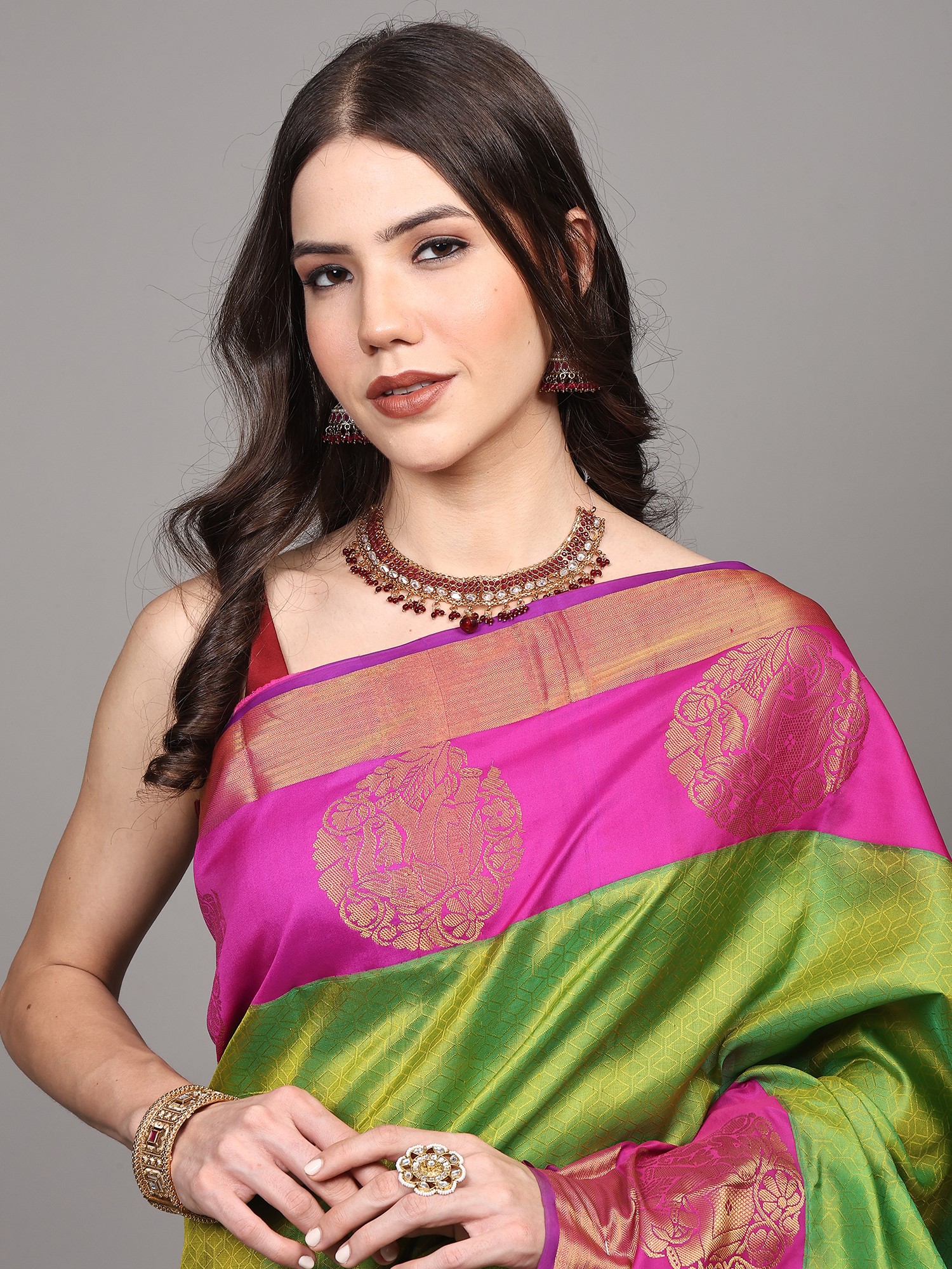Drape yourself in the epitome of traditional Indian craftsmanship with this breathtaking parrot-green pure silk saree. This exquisite piece is a testament to the artistry and heritage of silk weaving, designed to make you the center of attention at any occasion. The vibrant parrot-green hue evokes the freshness of nature and the exuberance of life, creating a captivating visual appeal that is both bold and sophisticated.