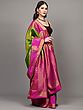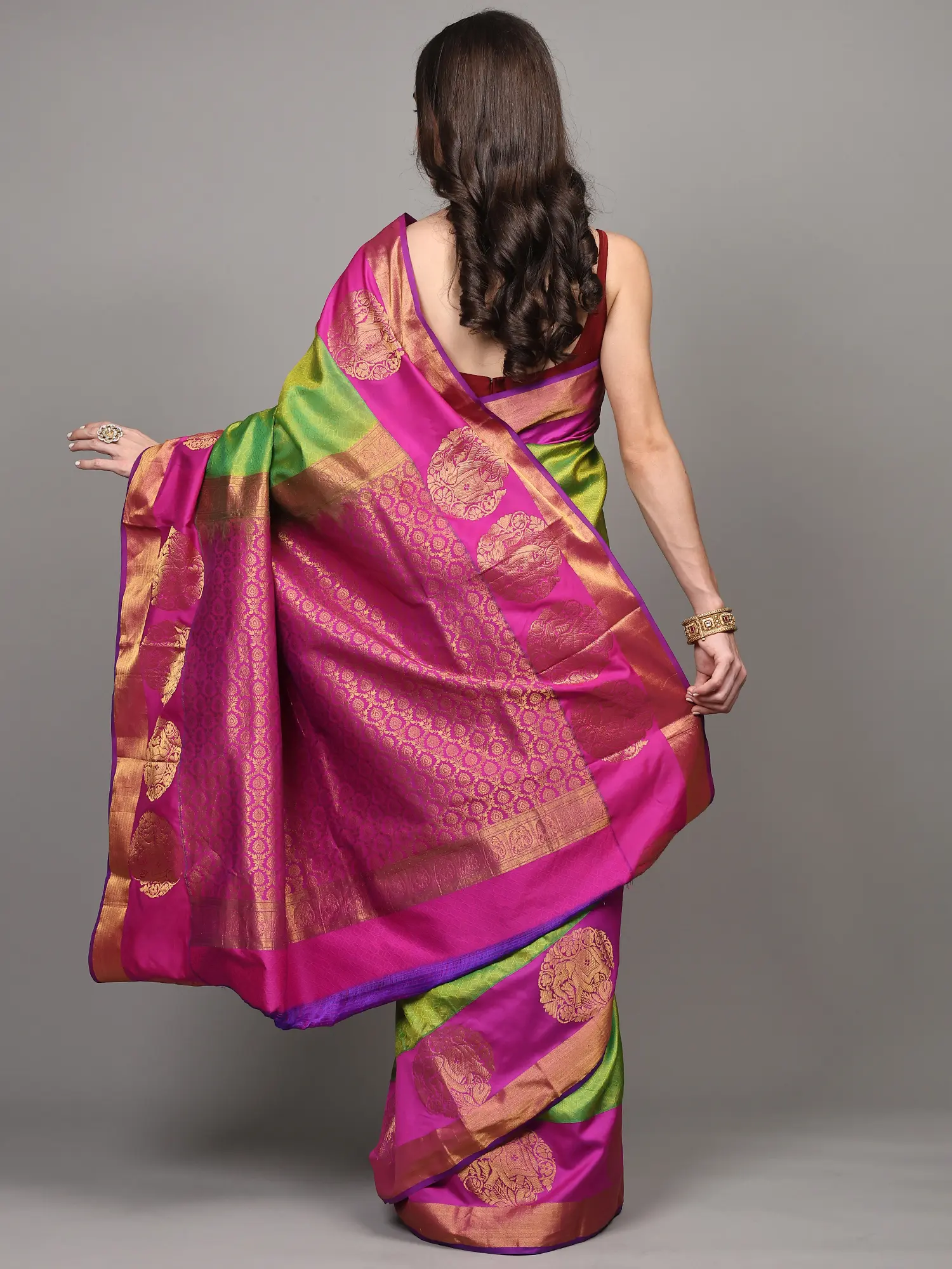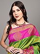 The saree is further enhanced by a striking contrast border in a vibrant magenta shade. This bold border is not just a design element; it's a statement. Adorned with intricately woven elephant motifs in golden thread, the border commands attention and adds a touch of regal splendor. Elephants, symbols of strength, wisdom, and good fortune, are rendered with meticulous detail, making this saree a truly auspicious choice for celebrations and significant events. The contrast between the lush green and the vivid magenta, coupled with the shimmering gold, creates a harmonious yet impactful visual, embodying the very essence of South Indian textile artistry.