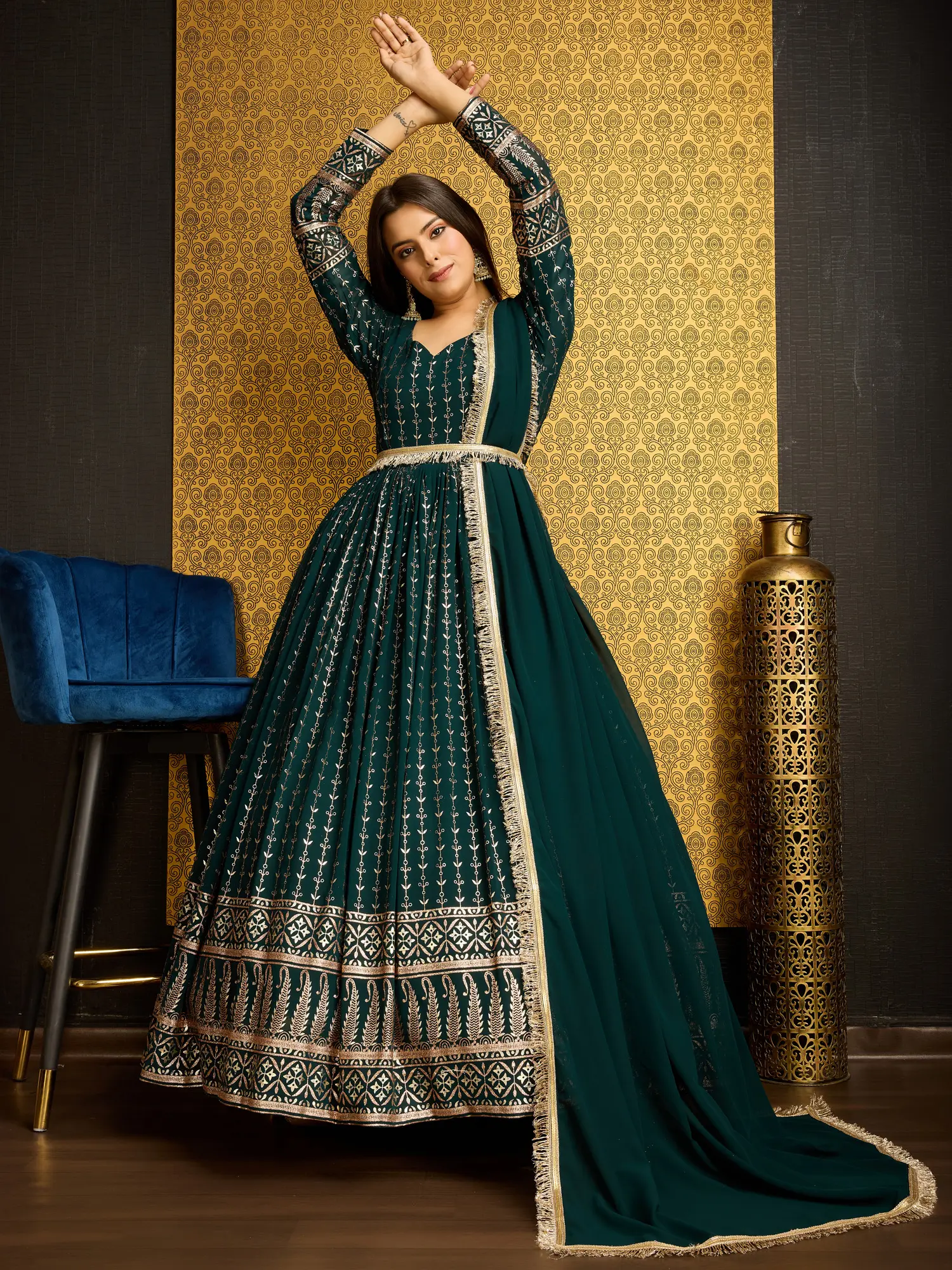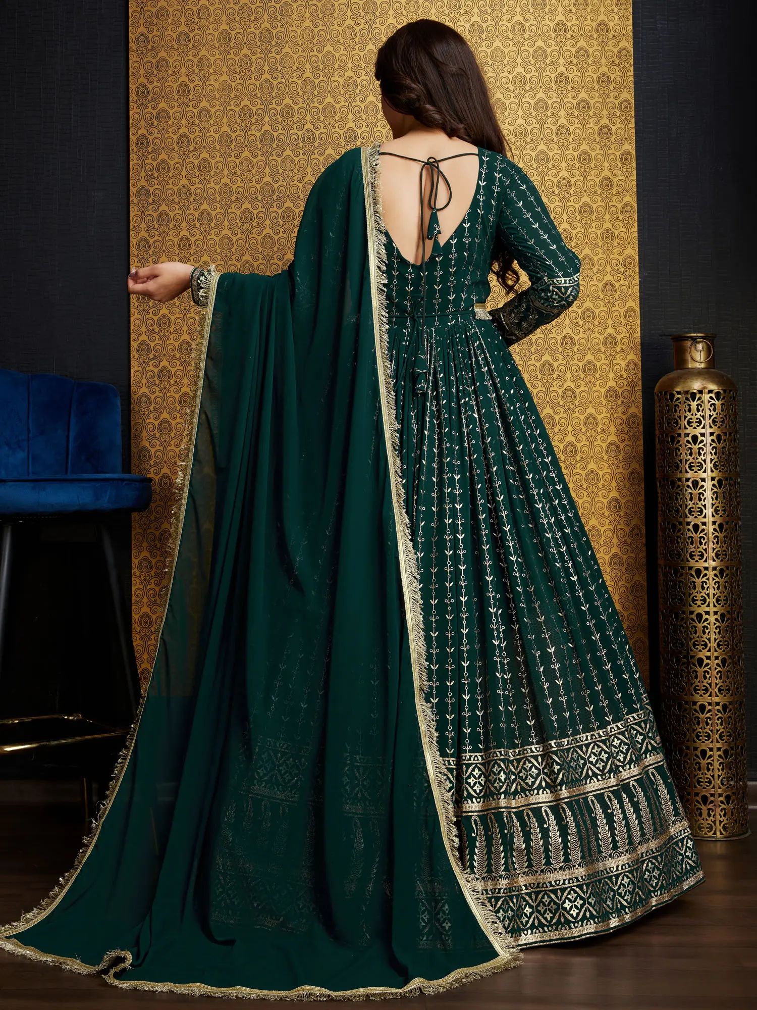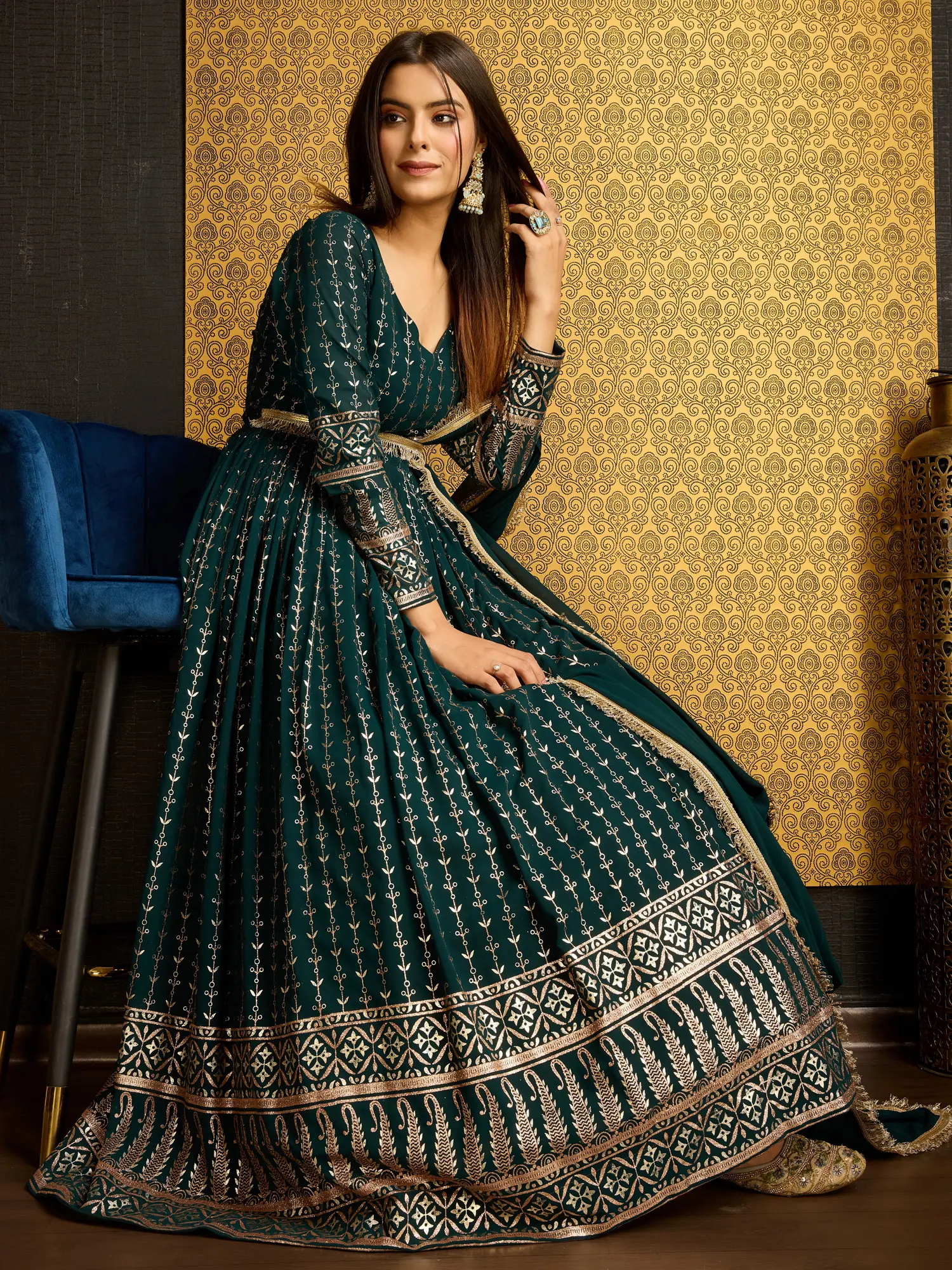 Who does not love a stylish blend of tradition and trend? This classic ethnic gown, crafted like the royal Anarkali suit, brings the volume of European dresses to your wardrobe, with a touch of ethnic Indian fashion. The gown is decorated with beautiful foil work- Ladi or rows of leaves on the body and exquisite paisley patterns on the hemline and cuffs.