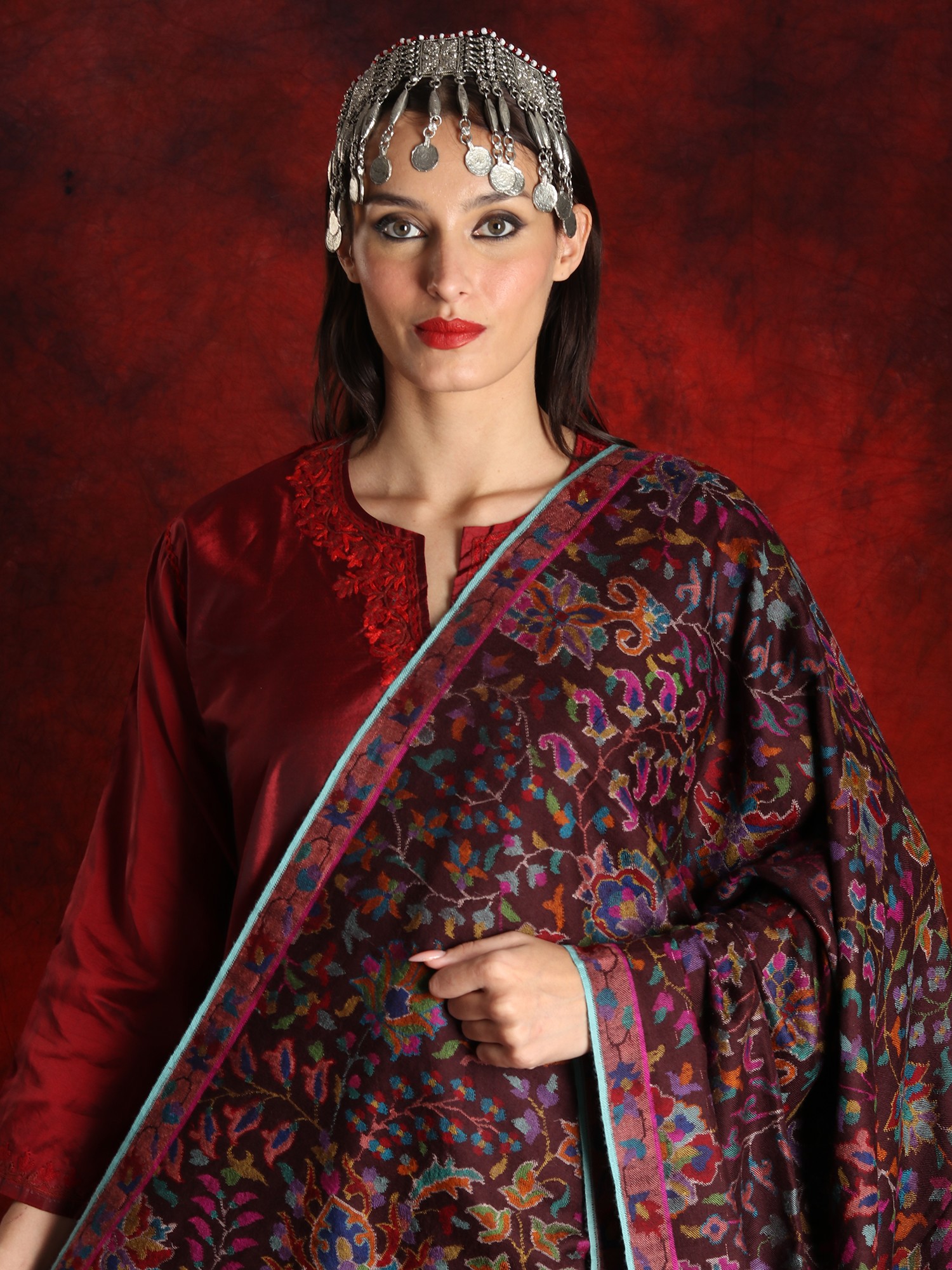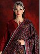 Shawls with patterns that “filled even painters with surprise”, are how the beauty of Kani Pashmina shawls has been expressed by a 15th-century Kashmiri writer, Srivara. Gazing at the marvelous detailing of this pure Pashmina Kani shawl, we know why the poet chose to describe the traditional attire with such high praises. The technique of Kani used in this wine-hued Pashmina is a meticulous work, of tying the silk threads together with the wool to put the patterns in the shawl, during the weaving process itself. The entire field of the Pashmina is covered in bustling blossoms in vibrant colors, taking one to the gardens of Kashmir, from where the charm of Pashmina spreads its fragrance worldwide.