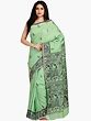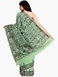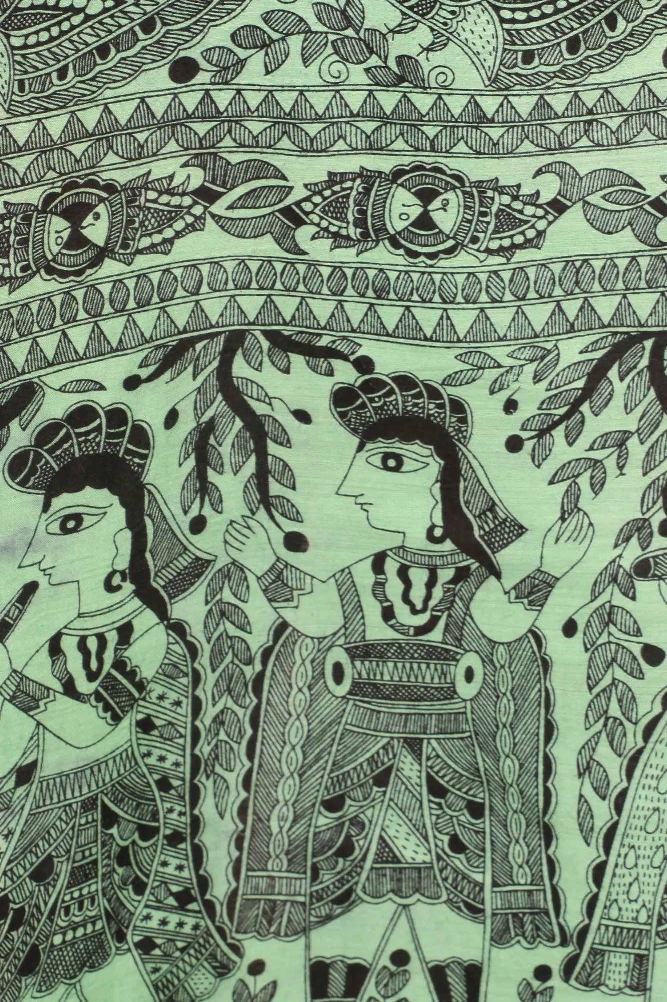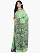 Pastel-Green Sari from Bengal with Printed Madhubani Folk Motifs