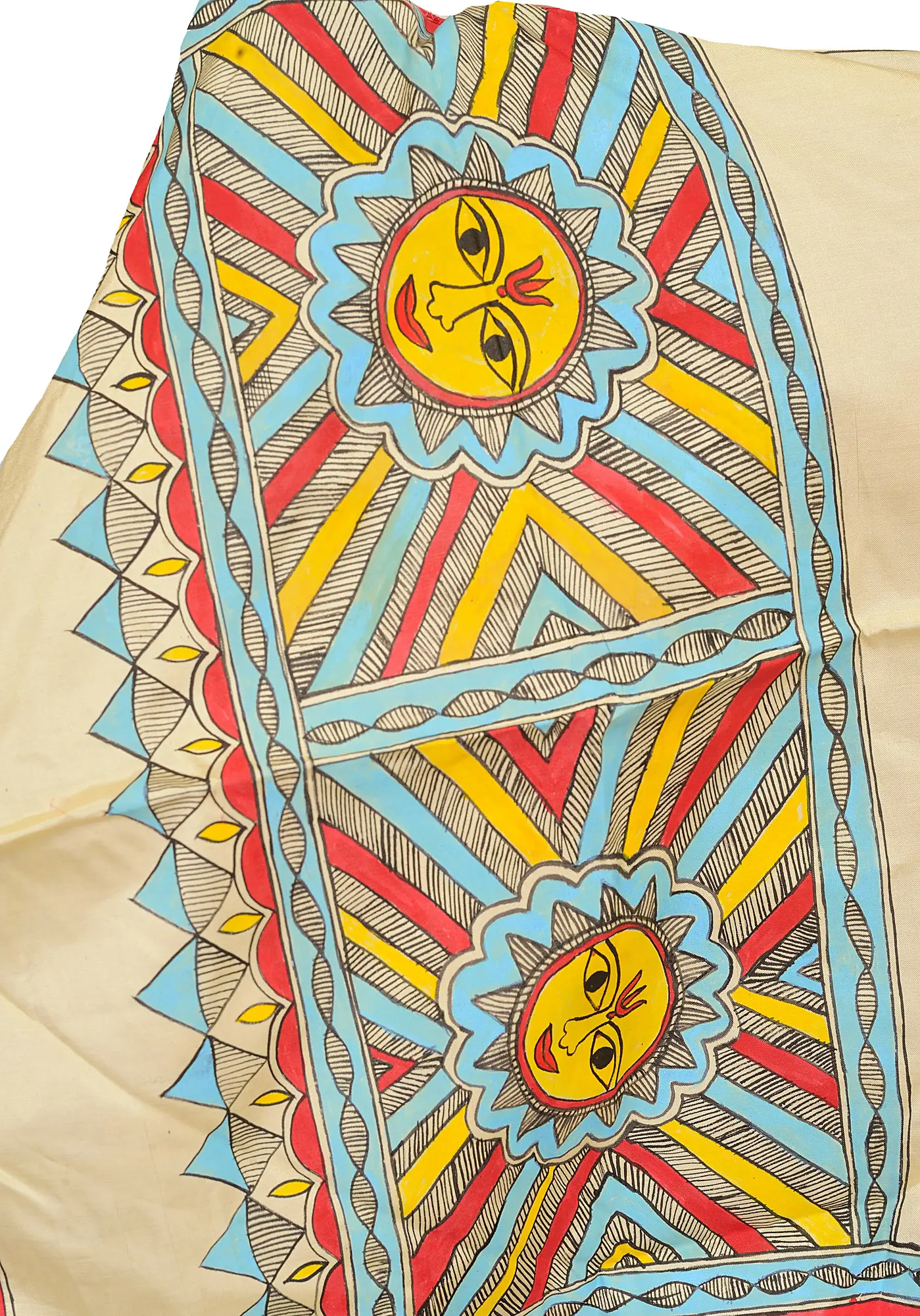 Dark-Shadow Sari from Bihar with Hand-Painted Madhubani Folk Motifs on Aanchal