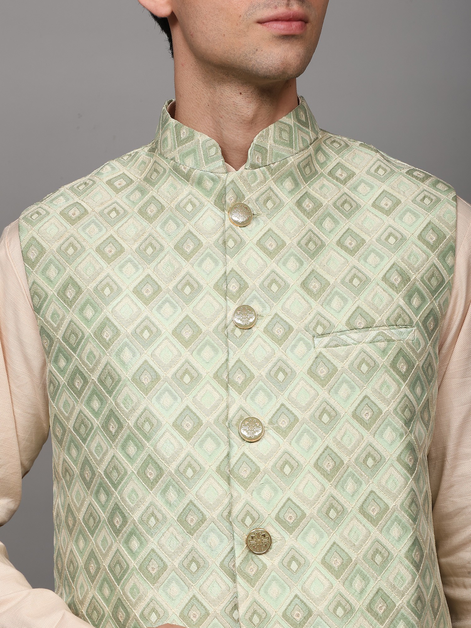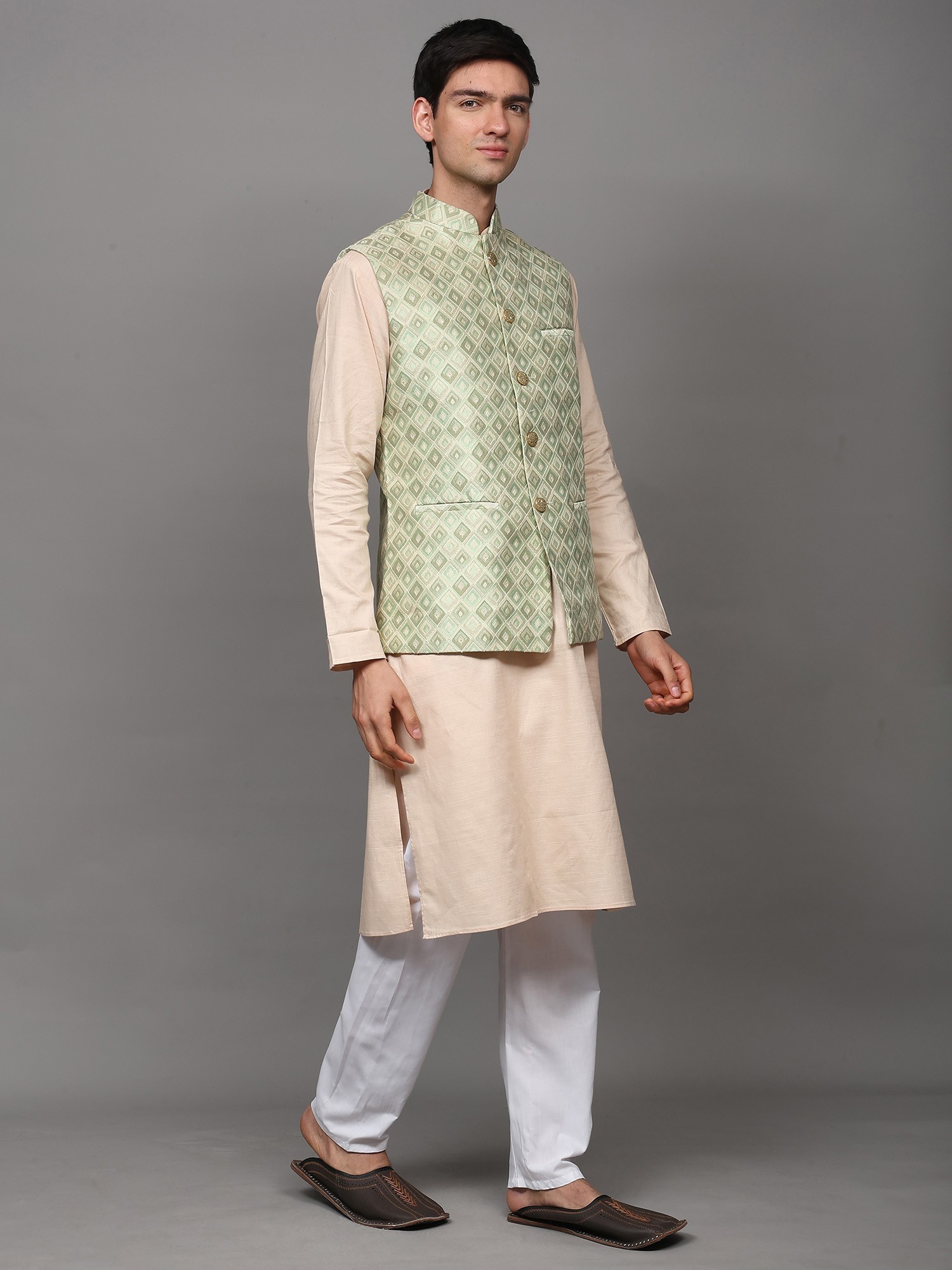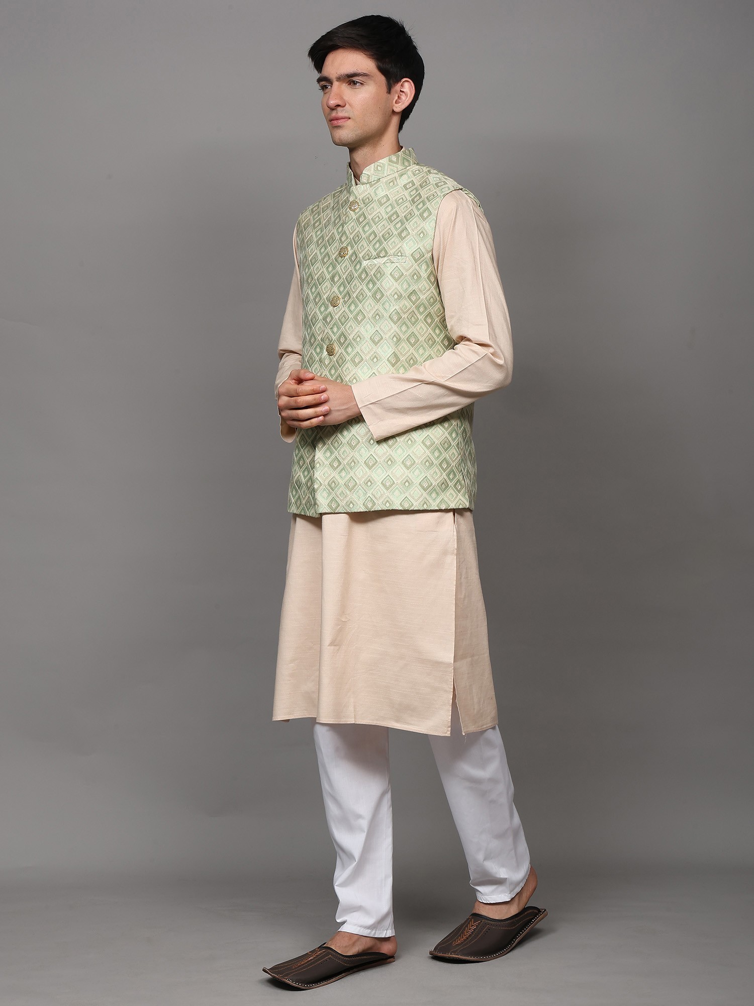 This waistcoat is a versatile piece that can be styled in numerous ways to create different looks. Pair it with a traditional kurta pajama set for a classic ethnic ensemble, perfect for weddings and festive occasions. The contrast of the waistcoat against the kurta adds depth and visual interest to the outfit. For a more contemporary look, consider layering it over a simple shirt and trousers. This unexpected combination creates a fusion of traditional and modern styles that is both stylish and unique. Add a pair of loafers or dress shoes to complete the ensemble. The waistcoat's subtle color also allows you to experiment with different color palettes. Whether you prefer to coordinate with complementary hues or create contrast with bolder shades, this waistcoat provides a versatile canvas for your personal style.
