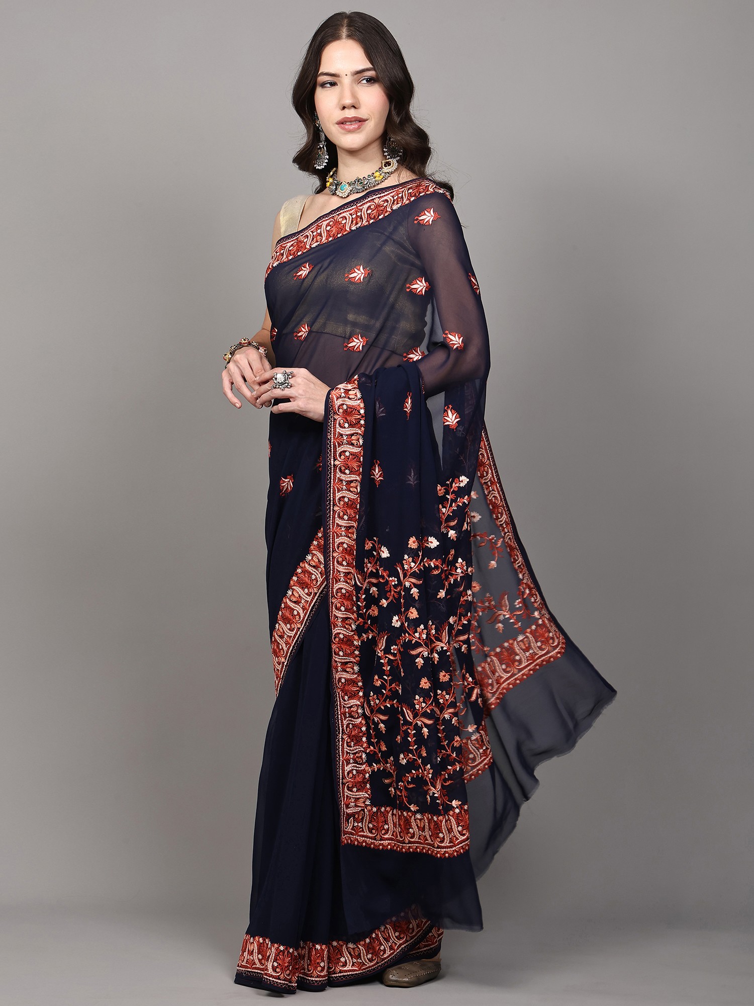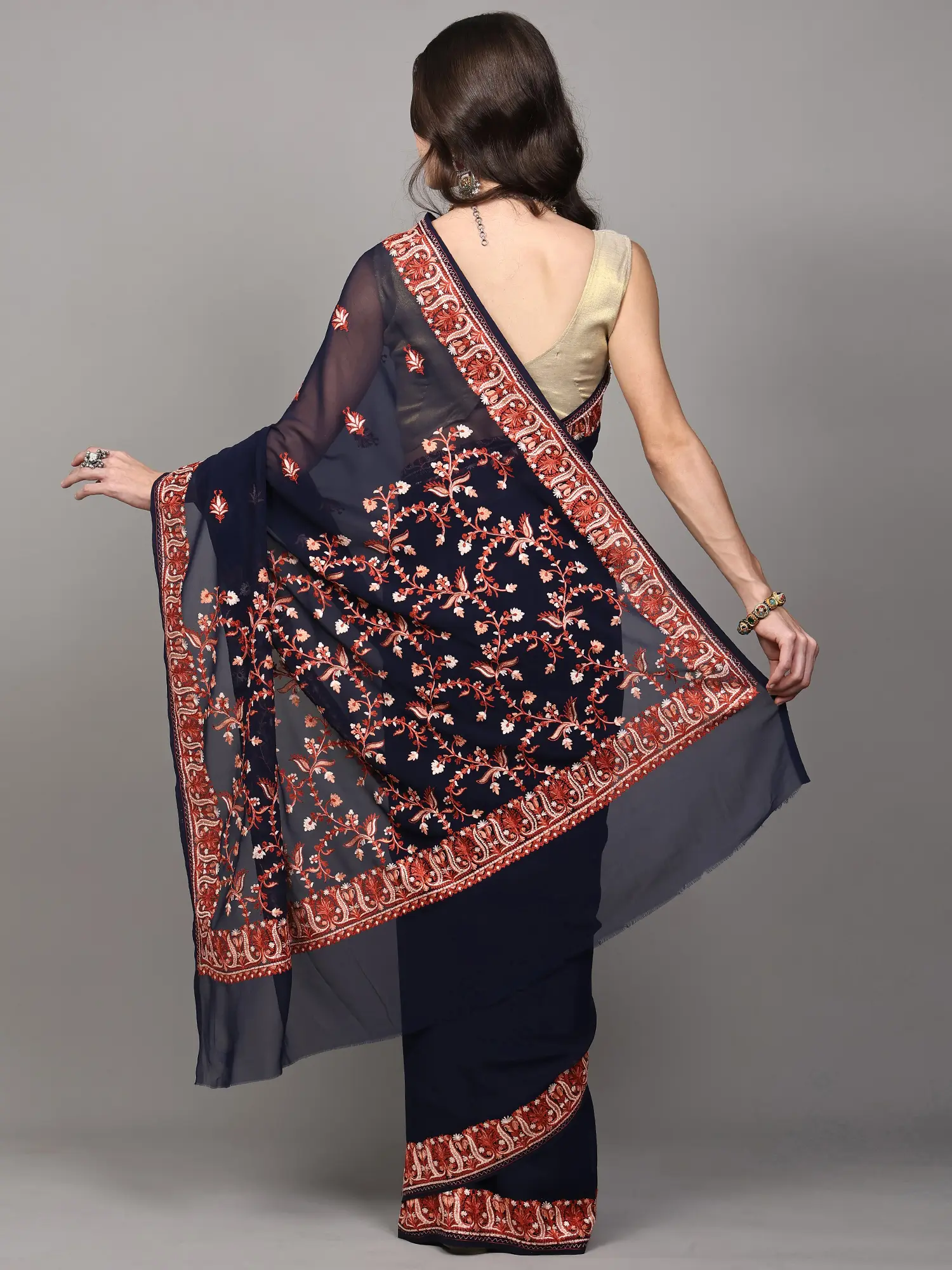 Macaw-Green Floral Aari Embroidered Georgette Saree from Kashmir