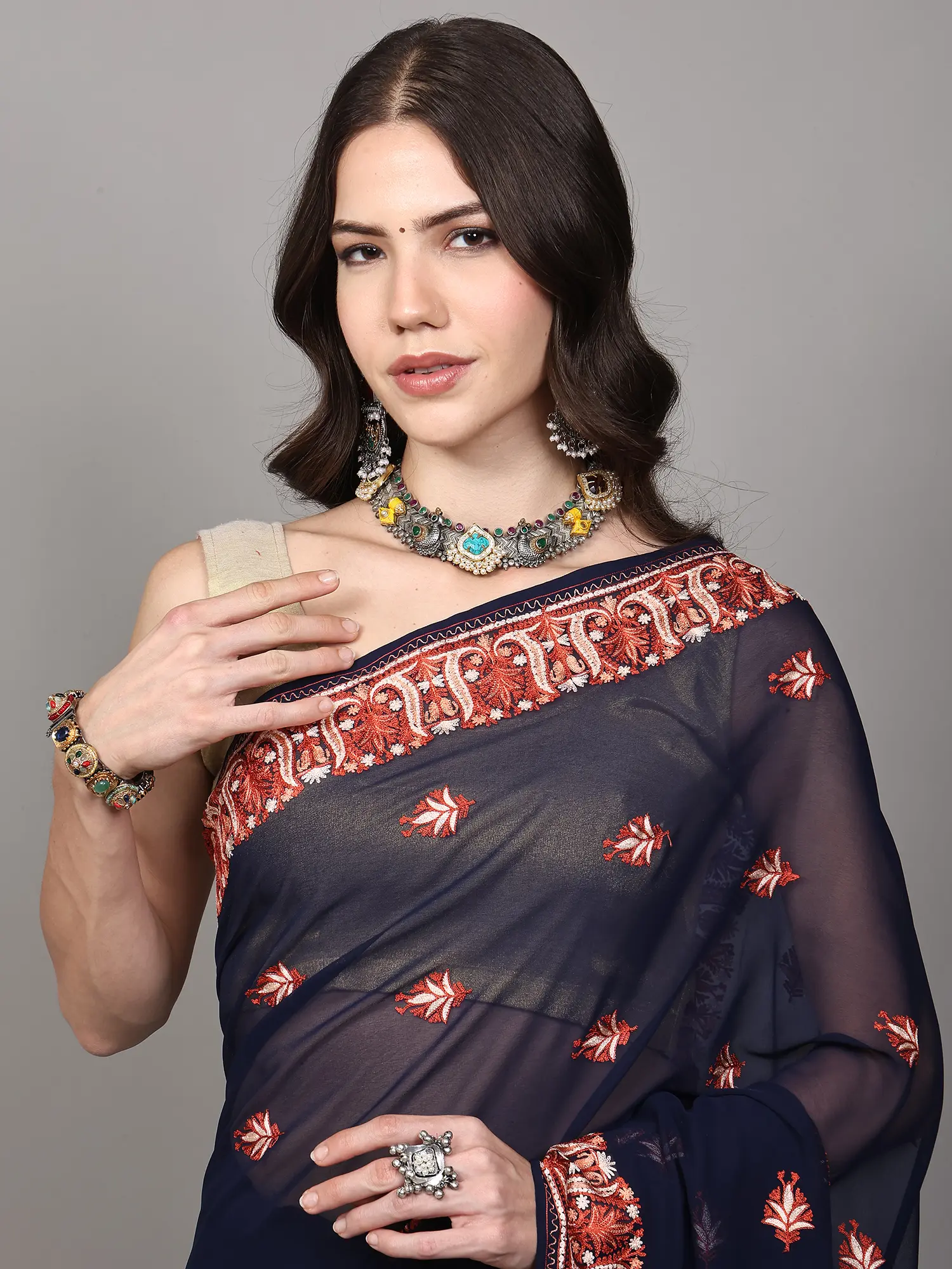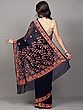 Rosebloom Blended Bangalore Silk Geometric Pattern Hand-Embroidered Kantha Saree