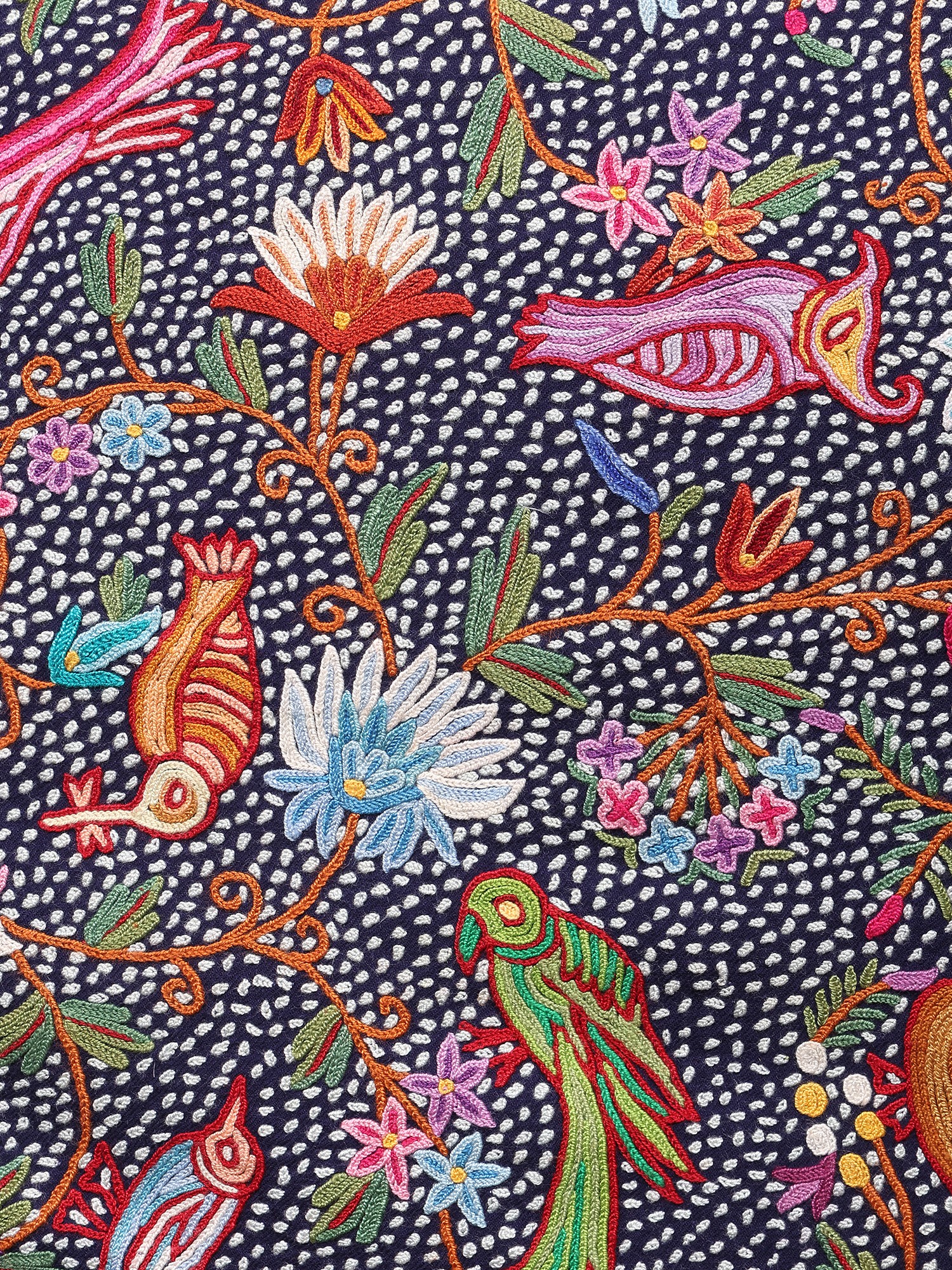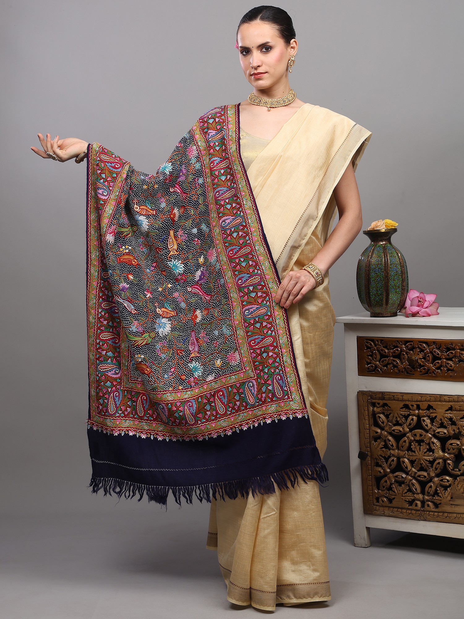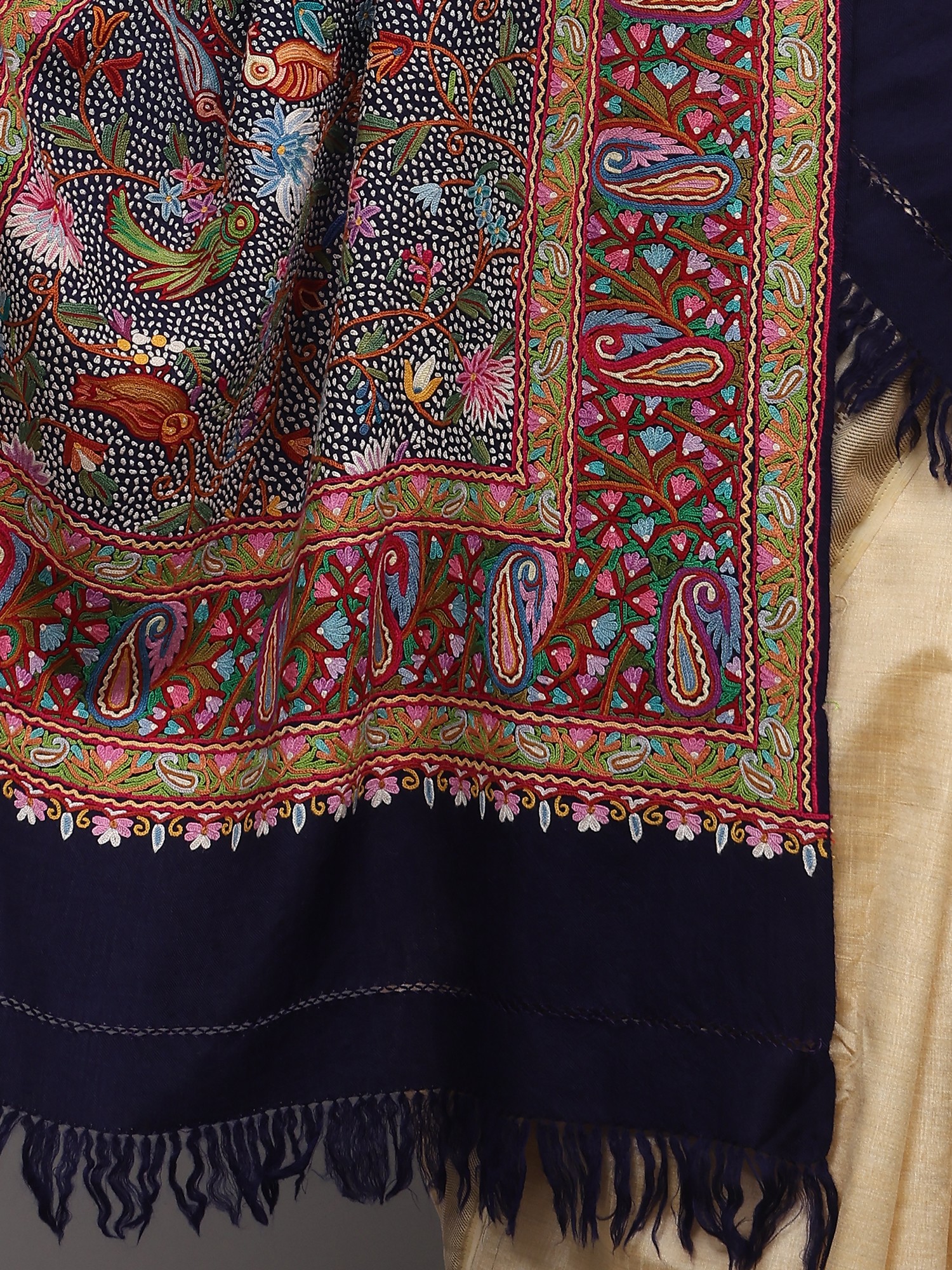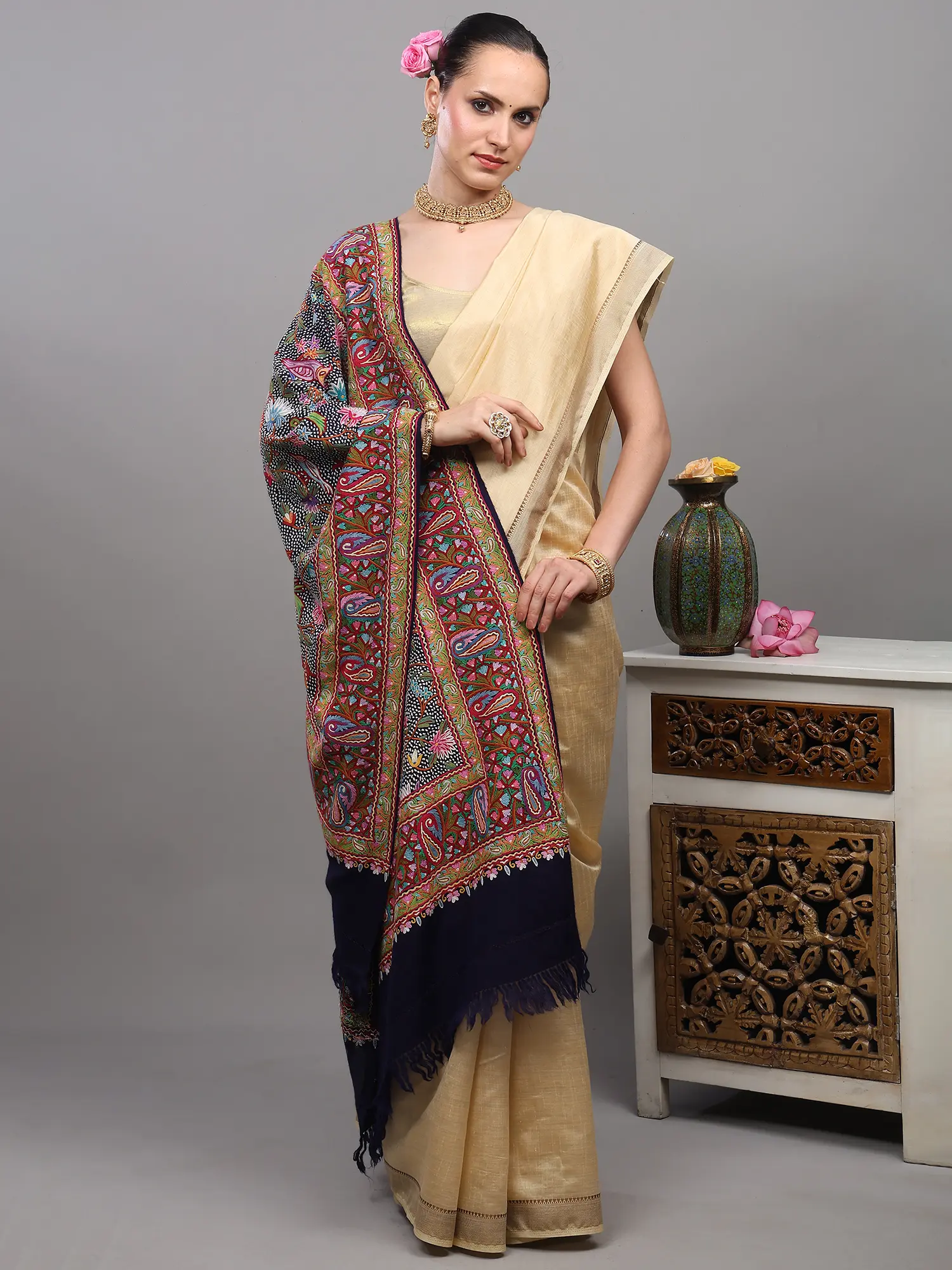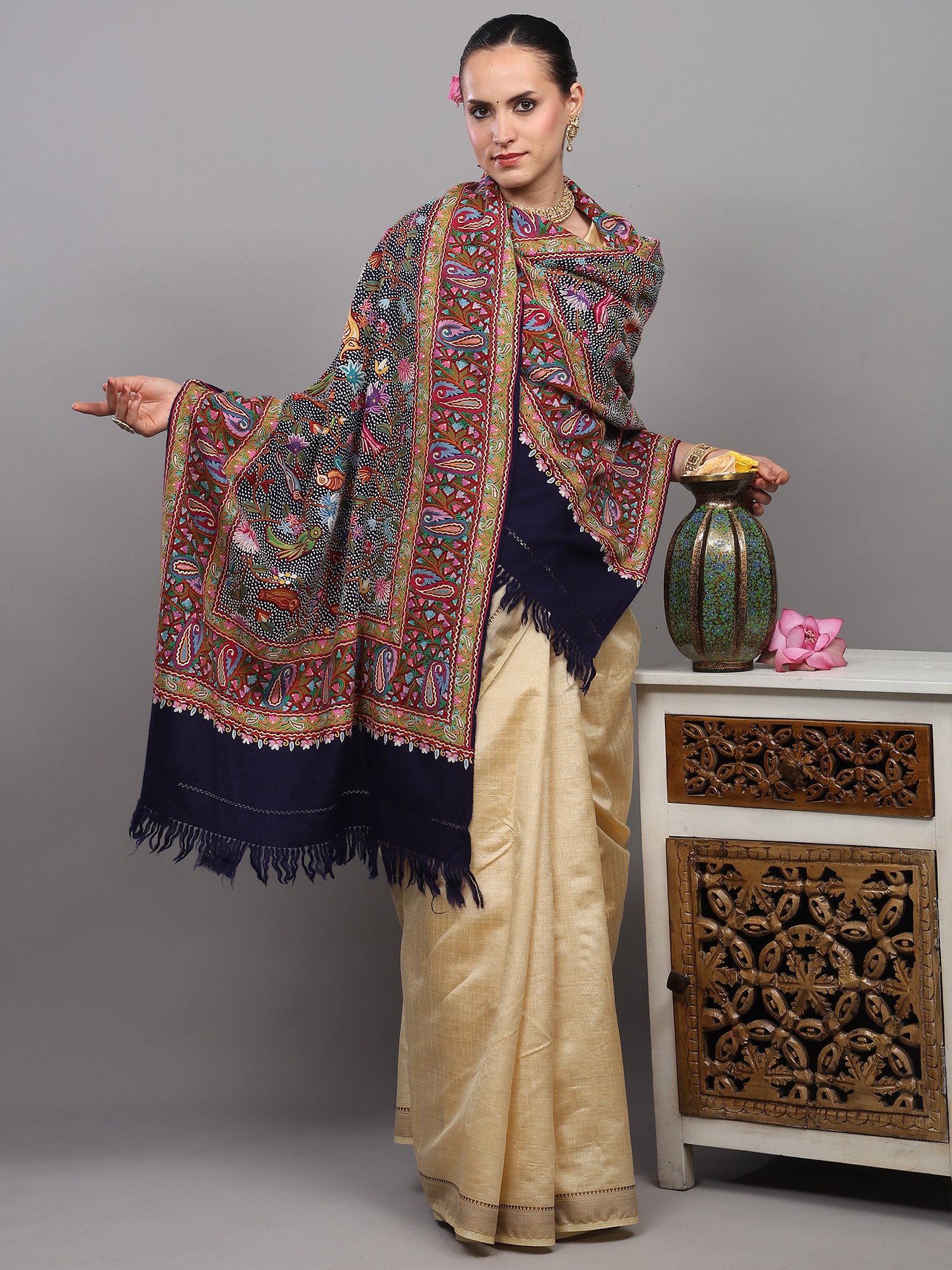 Amritsari Chain Stitch Satin Aari Embroidered Mughal Motif Pure Wool Shawl