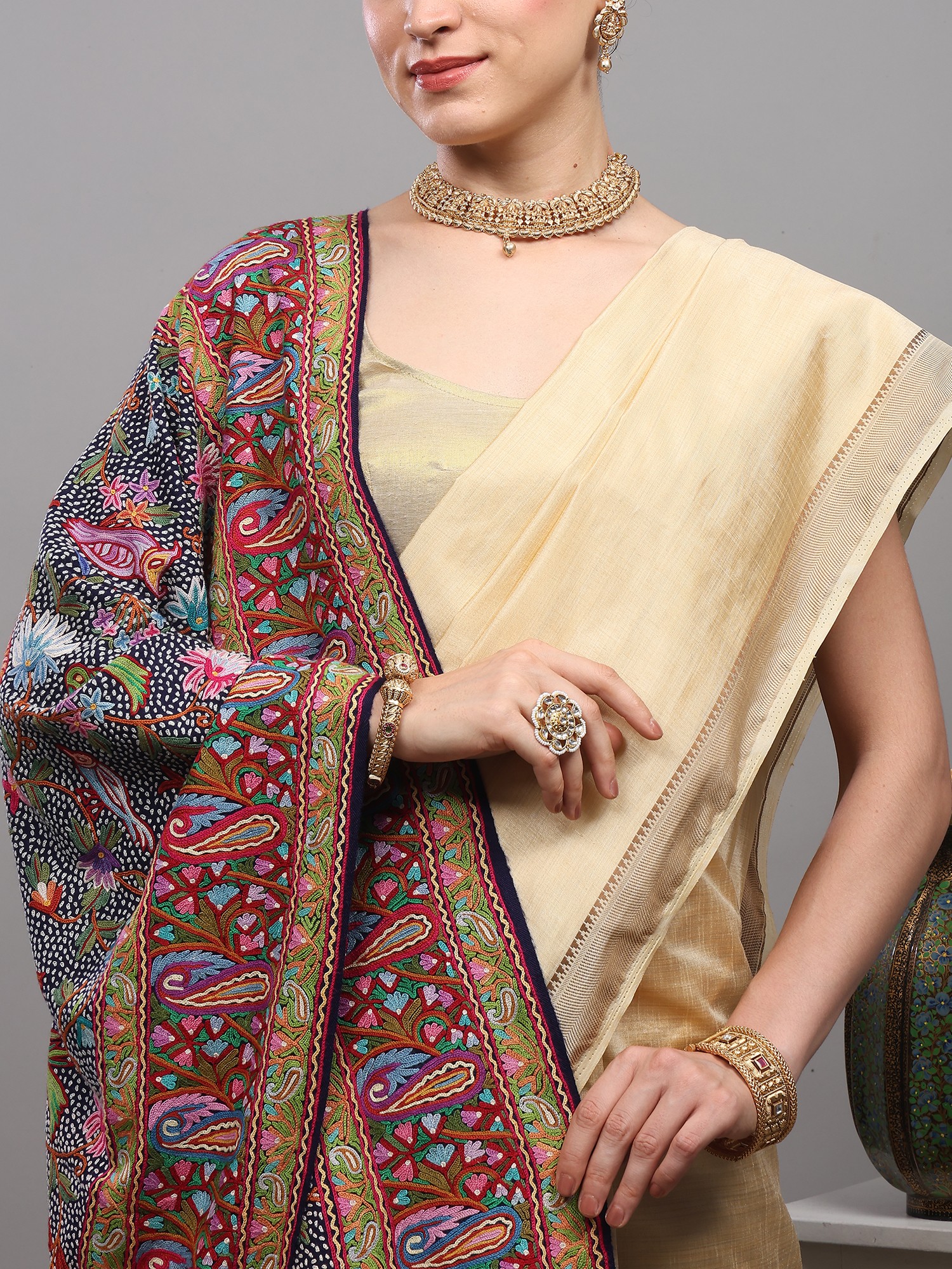 Pure Wool Shawl from Punjab with Multicolor Intricate Embroidered Floral Vines