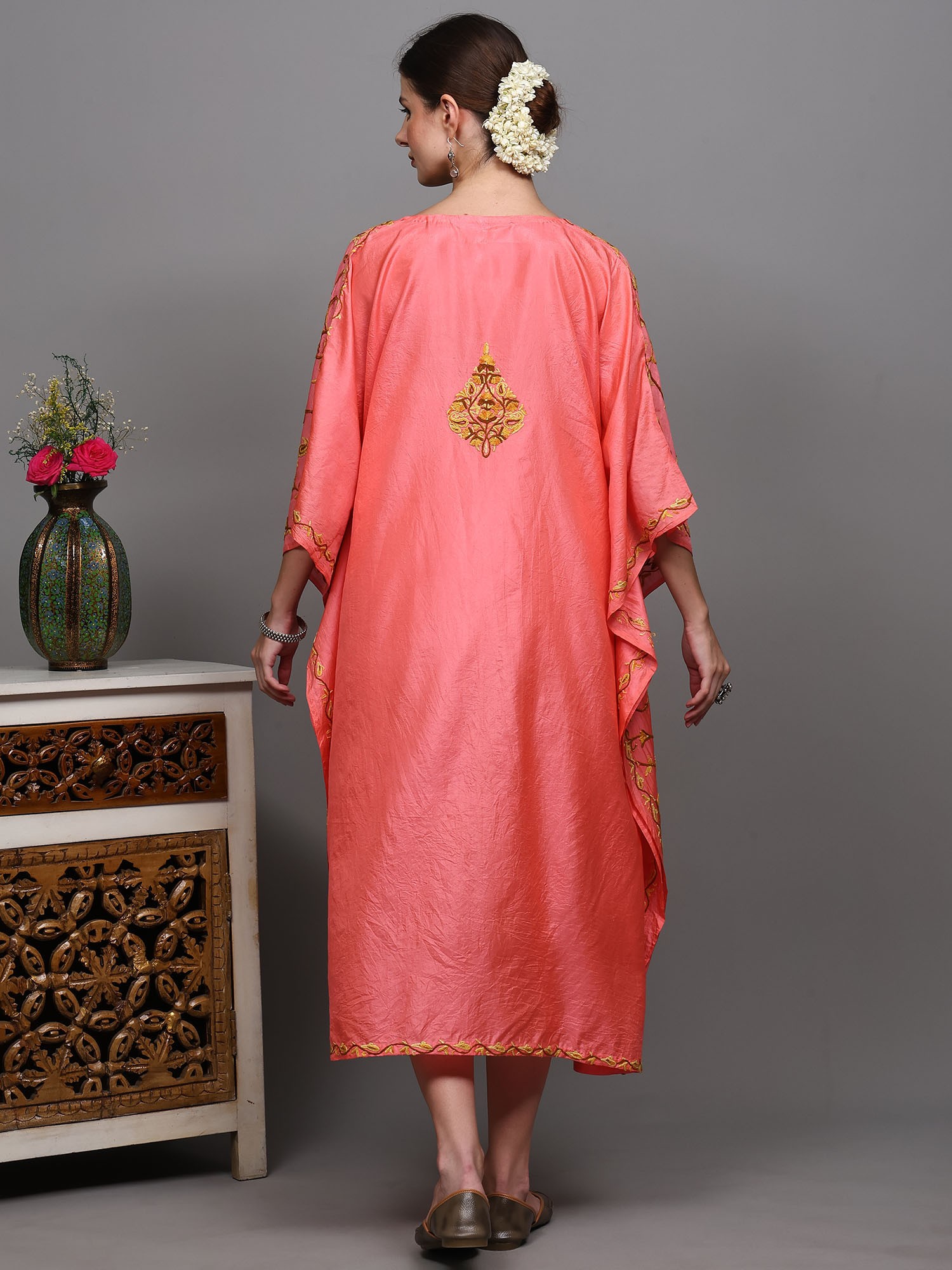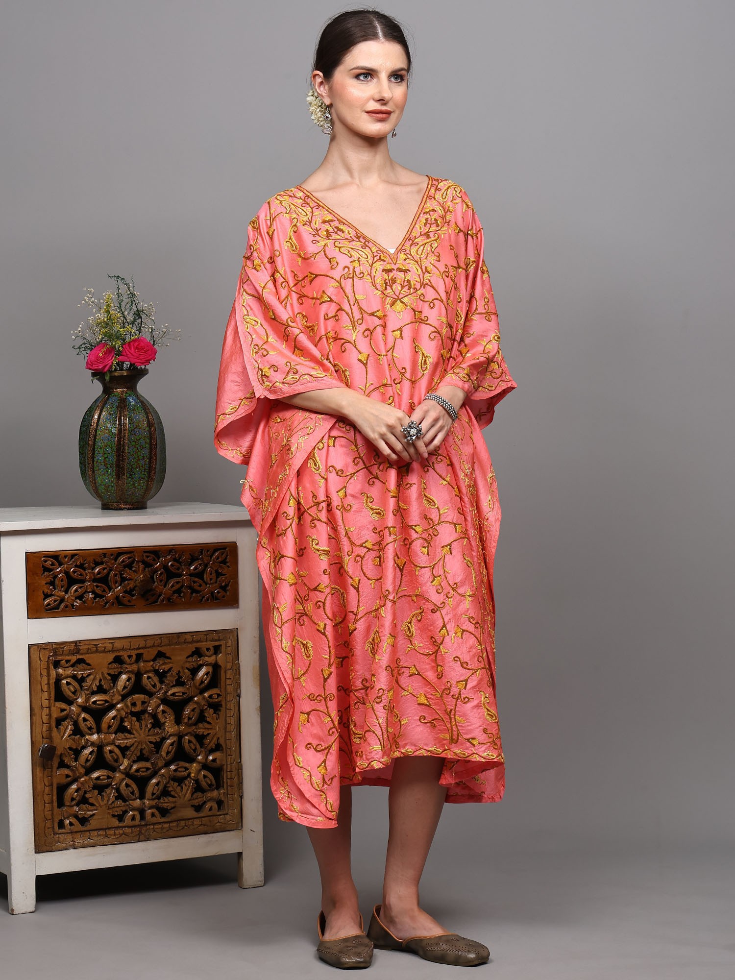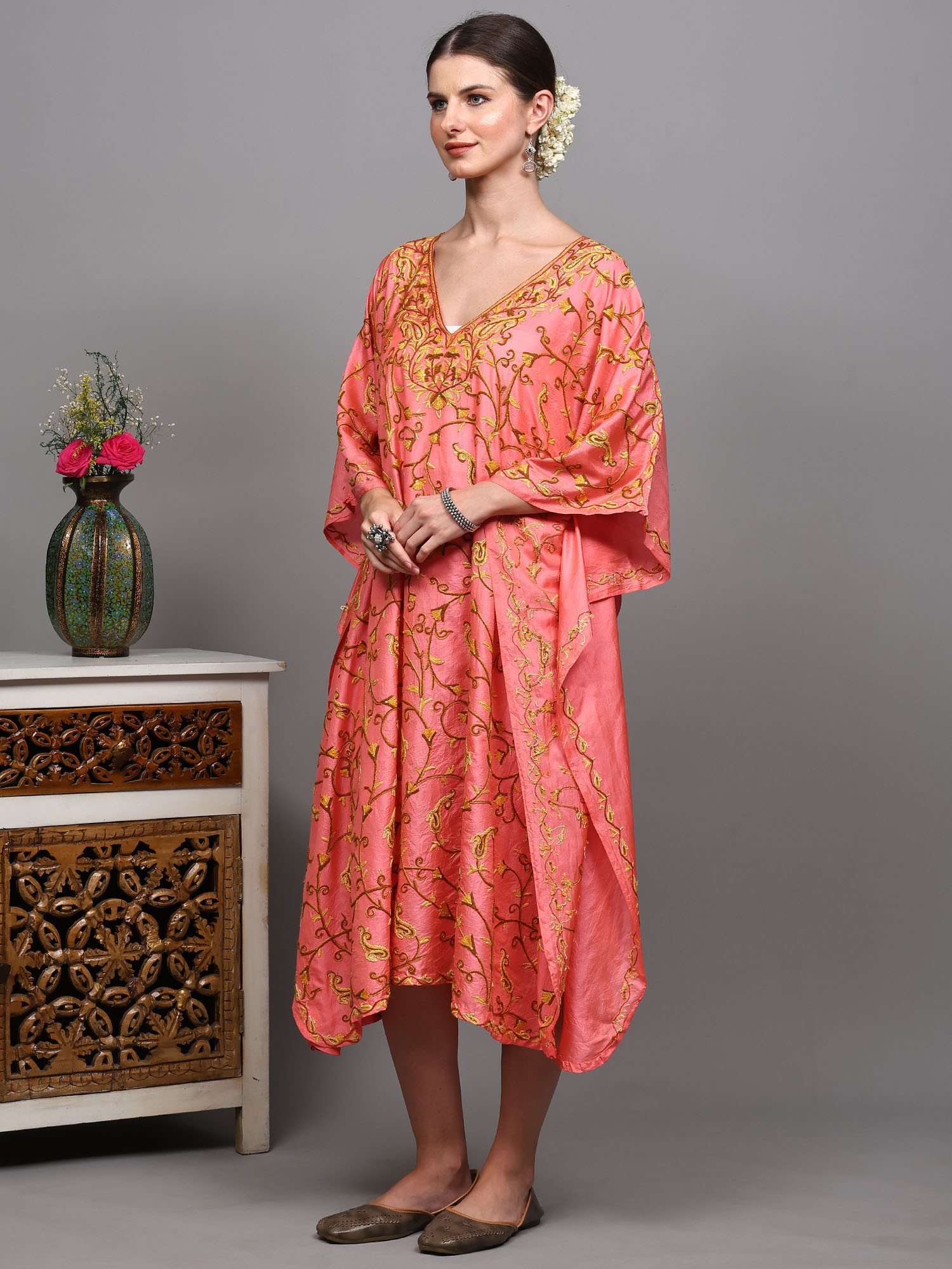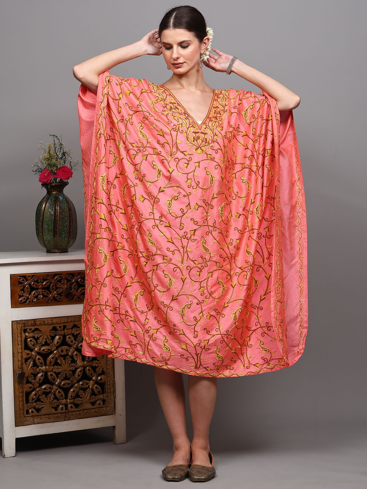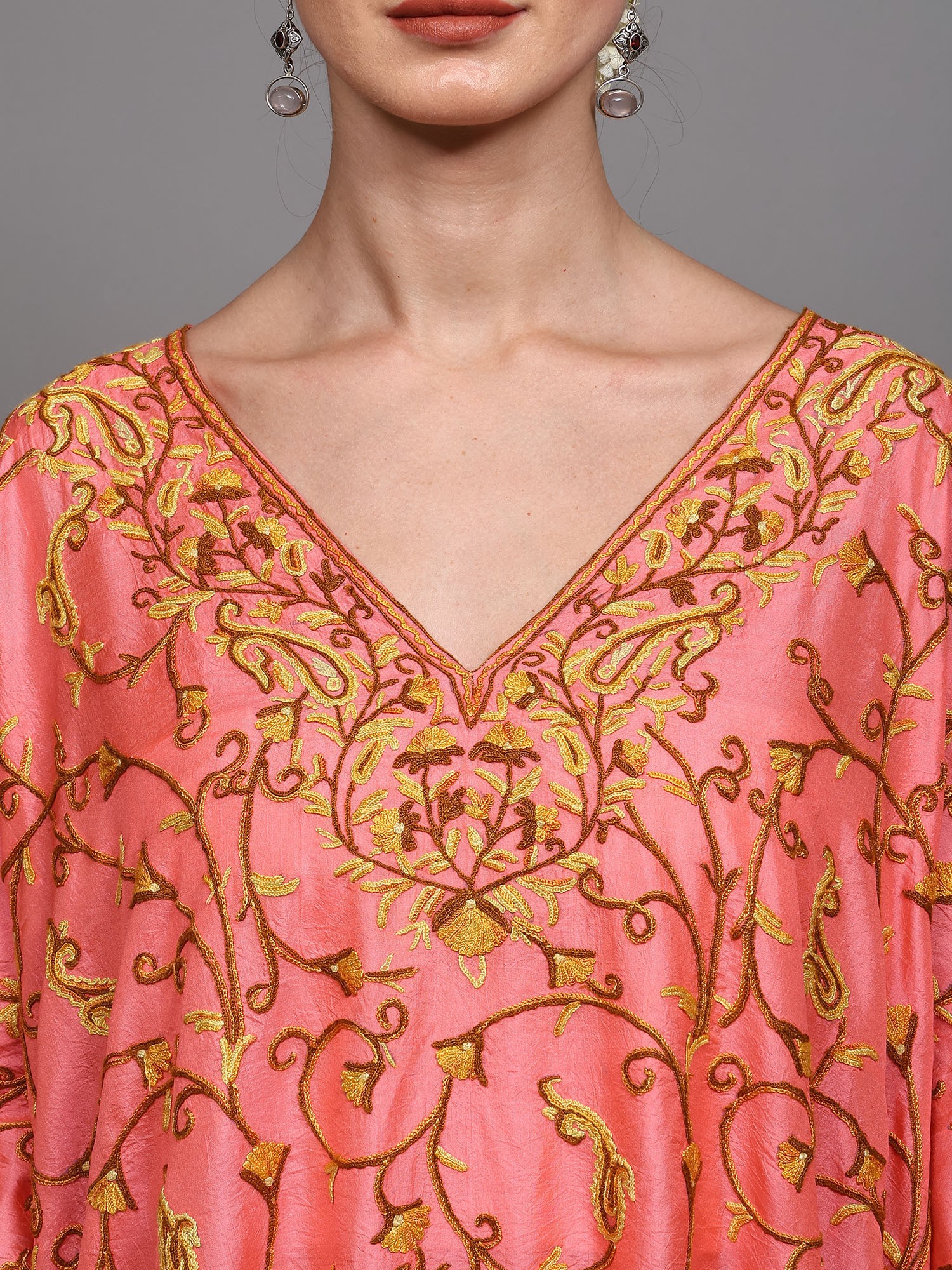 Pink-Dolphin Pure Wool Kashmiri Short Kaftan with Aari Embroidered Paisleys